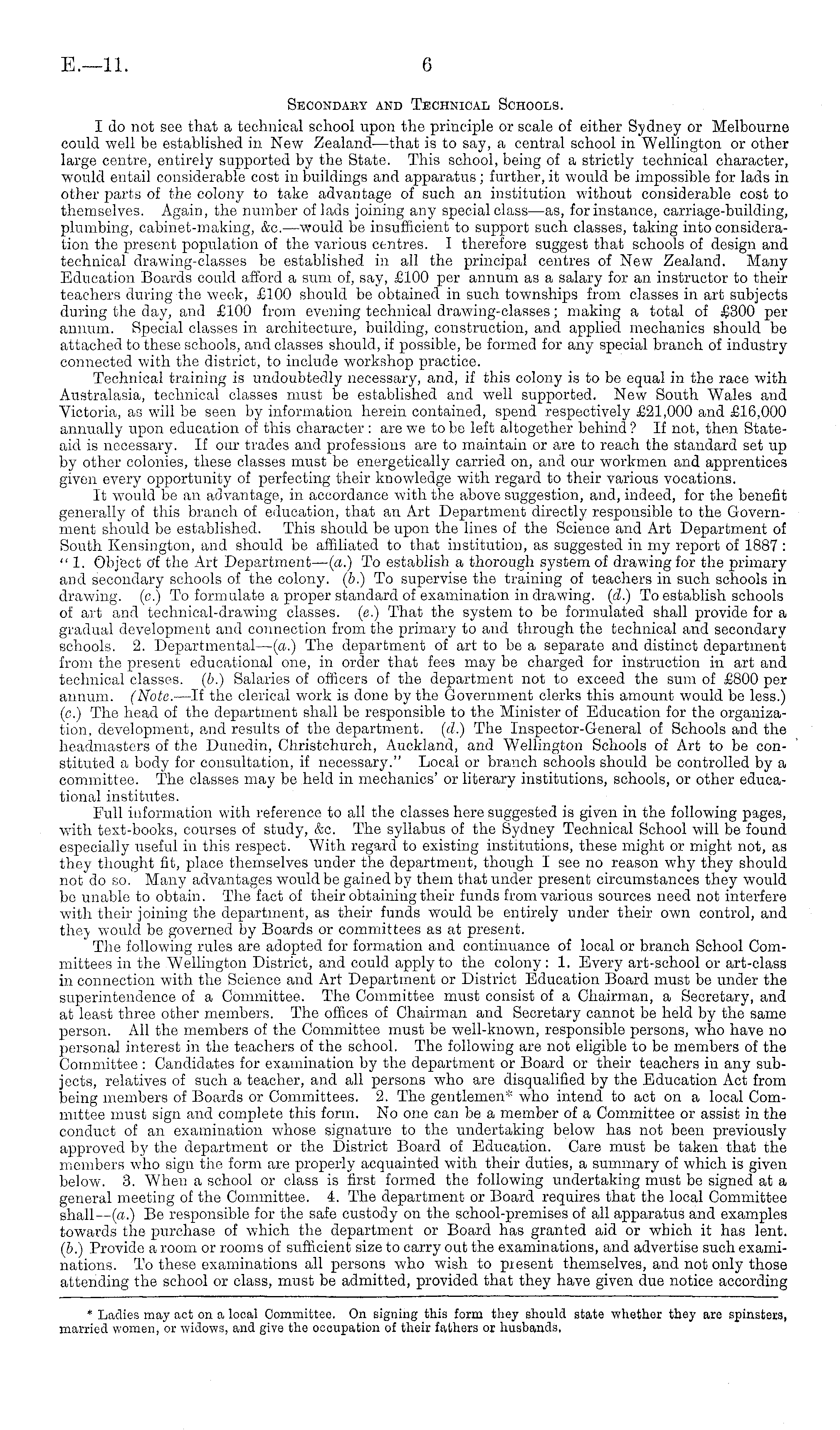 Secondaey and Technical Schools. I do not see that a technical school upon the principle or scale of either Sydney or Melbourne could well be established in New Zealand—that is to say, a central school in Wellington or other large centre, entirely supported by the State. This school, being of a strictly technical character, would entail considerable cost in buildings and apparatus; further, it would be impossible for lads in other parts of the colony to take advantage of such an institution without considerable cost to themselves. Again, the number of lads joining any special class—as, for instance, carriage-building, plumbing, cabinet-making, &e. —would be insufficient to support such classes, taking into consideration the present population of the various centres. I therefore suggest that schools of design and technical drawing-classes be established in all the principal centres of New Zealand. Many Education Boards could afford a sum of, say, £100 per annum as a salary for an instructor to their teachers during the week, £100 should be obtained in such townships from classes in art subjects during the day, and £100 from evening technical drawing-classes; making a total of £300 per annum. Special classes in architecture, building, construction, and applied mechanics should be attached to these schools, and classes should, if possible, be formed for any special branch of industry connected with the district, to include workshop practice. Technical training is undoubtedly necessary, and, if this colony is to be equal in the race with Australasia, technical classes must be established and well supported. New South Wales and Victoria, as will be seen by information herein contained, spend respectively £21,000 and £16,000 annually upon education of this character : are we to be left altogether behind ? If not, then Stateaid is necessary. If our trades and professions are to maintain or are to reach the standard set up by other colonies, these classes must be energetically carried on, and our workmen and apprentices given every opportunity of perfecting their knowledge with regard to their various vocations. It would be an advantage, in accordance with the above suggestion, and, indeed, for the benefit generally of this branch of education, that an Art Department directly responsible to the Government should be established. This should be upon the lines of the Science and Art Department of South Kensington, and should be affiliated to that institution, as suggested in my report of 1887 : " 1. Obj'ect Of the Art Department— (a.) To establish a thorough system of drawing for the primary and secondary schools of the colony. (6.) To supervise the training of teachers in such schools in drawing, (c.) To formulate a proper standard of examination in drawing, (d.) To establish schools of art and technical-drawing classes, (c.) That the system to be formulated shall provide for a gradual development and connection from the primary to and through the technical and secondary schools. 2. Departmental— (a.) The department of art to be a separate and distinct department from the present educational one, in order that fees may be charged for instruction in art and technical classes, (b.) Salaries of officers of the department not to exceed the sum of £800 per annum. (Note. —If the clerical work is done by the Government clerks this amount would be less.) (c.) The head of the department shall be responsible to the Minister of Education for the organization, development, and results of the department, (d.) The Inspector-General of Schools and the headmasters of the Dunedin, Christchurch, Auckland, and Wellington Schools of Art to be constituted a body for consultation, if necessary." Local or branch schools should be controlled by a committee. The classes may be held in mechanics' or literary institutions, schools, or other educational institutes. Full information with reference to all the classes here suggested is given in the following pages, with text-books, courses of study, &c. The syllabus of the Sydney Technical School will be found especially useful in this respect. With regard to existing institutions, these might or might not, as they thought fit, place themselves under the department, though I see no reason why they should not do so. Many advantages would be gained by them that under present circumstances they would be unable to obtain. The fact of their obtaining their funds from various sources need not interfere with their joining the department, as their funds would be entirely under their own control, and they would be governed by Boards or committees as at present. The following rules are adopted for formation and continuance of local or branch School Committees in the Wellington District, and could apply to the colony: 1. Every art-school or art-class in connection with the Science and Art Department or District Education Board must be under the superintendence of a Committee. The Committee must consist of a Chairman, a Secretary, and at least three other members. The offices of Chairman and Secretary cannot be held by the same person. All the members of the Committee must be well-known, responsible persons, who have no personal interest in the teachers of the school. The following are not eligible to be members of the Committee : Candidates for examination by the department or Board or their teachers in any subjects, relatives of such a teacher, and all persons who are disqualified by the Education Act from being members of Boards or Committees. 2. The gentlemen* who intend to act on a local Committee must sign and complete this form. No one can be a member of a Committee or assist in the conduct of an examination whose signature to the undertaking below has not been previously approved by the department or the District Board of Education. Care must be taken that the members who sign the form are properly acquainted with their duties, a summary of which is given below. 