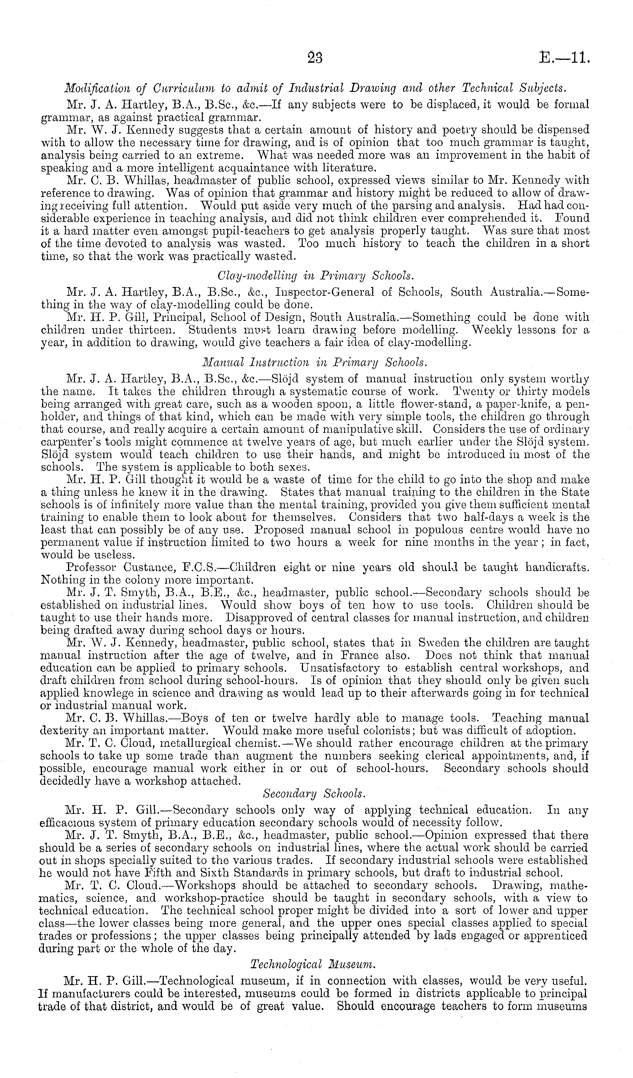 Modification of Curriculum to admit of Industrial Drawing and other Technical Subjects. Mr. J. A. Hartley, 8.A., B.Sc, &c. —If any subjects were to be displaced, it would be formal grammar, as against practical grammar. Mr. W. J. Kennedy suggests that a certain amount of history and poetry should be dispensed wuth to allow the necessary time for drawing, and is of opinion that too much grammar is taught, analysis being carried to an extreme. What was needed more was an improvement in the habit of speaking and a more intelligent acquaintance with literature. Mr. C. B. Whillas, headmaster of public school, expressed views similar to Mr. Kennedy with reference to drawing. Was of opinion that grammar and history might be reduced to allow of drawing receiving full attention. Would put aside very much of the parsing and analysis. Had had considerable experience in teaching analysis, and did not think children ever comprehended it. Found it a hard matter even amongst pupil-teachers to get analysis properly taught. Was sure that most of the time devoted to analysis was wasted. Too much history to teach the children in a short time, so that the work was practically wasted. Clay-modelling in Primary Schools. Mr. J. A. Hartley, 8.A., B.Sc, &c, Inspector-General of Schools, South Australia.— Something in the way of clay-modelling could be done. Mr. H. P. Gill, Principal, School of Design, South Australia.—Something could be done with children under thirteen. Students must learn drawing before modelling. Weekly lessons for a year, in addition to drawing, would give teachers a fair idea of clay-modelling. Manual Instruction in Primary Schools. Mr. J. A. Hartley, 8.A., B.Sc, &c—Slojd system of manual instruction only system worthy the name. It takes the children through a systematic course of work. Twenty or thirty models being arranged with great care, such as a wooden spoon, a little flower-stand, a paper-knife, a penholder, and things of that kind, which can be made with very simple tools, the children go through that course, and really acquire a certain amount of manipulative skill. Considers the use of ordinary carpenter's tools might commence at twelve years of age, but much earlier under the Slojd system. Slojd system would teach children to use their hands, and might bo introduced in most of the schools. The system is applicable to both sexes. Mr. H. P. Gill thought it would be a waste of time for the child to go into the shop and make a thing unless he knew it in the drawing. States that manual training to the children in the State schools is of infinitely more value than the mental training, provided you give them sufficient mental training to enable them to look about for themselves. Considers that two half-days a week is the least that can possibly be of any use. Proposed manual school in populous centre would have no permanent value if instruction limited to two hours a week for nine months in the year ; in fact, would be useless. Professor Custauce, E.C.S.—Children eight or nine years old should be taught handicrafts. Nothing in the colony more important. Mr. J. T. Smyth, 8.A., 8.E., &c, headmaster, public school.—Secondary schools should be established on industrial lines. Would show boys of ten how to use tools. Children should be taught to use their hands more. Disapproved of central classes for manual instruction, and children being drafted away during school days or hours. Mr. W. J. Kennedy, headmaster, public school, states that in Sweden the children are taught manual instruction after the age of twelve, and in Erance also. Does not think that manual education can be applied to primary schools. Unsatisfactory to establish central workshops, and draft children from school during school-hours. Is of opinion that they should only be given such applied knowlege in science and drawing as would lead up to their afterwards going in for technical or industrial manual work. Mr. C. B. Whillas.—Boys of ten or twelve hardly able to manage tools. Teaching manual dexterity an important matter. Would make more useful colonists; but was difficult of adoption. Mr. T. C. Cloud, metallurgical chemist. —We should rather encourage children at the primary schools to take up some trade than augment the numbers seeking clerical appointments, and, if possible, encourage manual work either in or out of school-hours. Secondary schools should decidedly have a workshop attached. Secondary Scliools. Mr. H. P. Gill.—Secondary schools only way of applying technical education. In any efficacious system of primary education secondary schools would of necessity follow. Mr. J. T. Smyth, 8.A., 8.E., &c, headmaster, public school. —Opinion expressed that there should be a series of secondary schools on industrial lines, where the actual work should be carried out in shops specially suited to the various trades. If secondary industrial schools were established he would not have Eifth and Sixth Standards in primary schools, but draft to industrial school. Mr. T. C. Cloud. —Workshops should be attached to secondary schools. Drawing, mathematics, science, and workshop-practice should be taught in secondary schools, with a view to technical education. The technical school proper might be divided into a sort of lower and upper class —the lower classes being more general, and the upper ones special classes applied to special trades or professions ; the upper classes being principally attended by lads engaged or apprenticed during part or the whole of the day. Technological Museum. Mr. H. P. Gill. —Technological museum, if in connection with classes, would be very useful. If manufacturers could be interested, museums could be formed in districts applicable to principal trade of that district, and would be of great value. Should encourage teachers to form museums