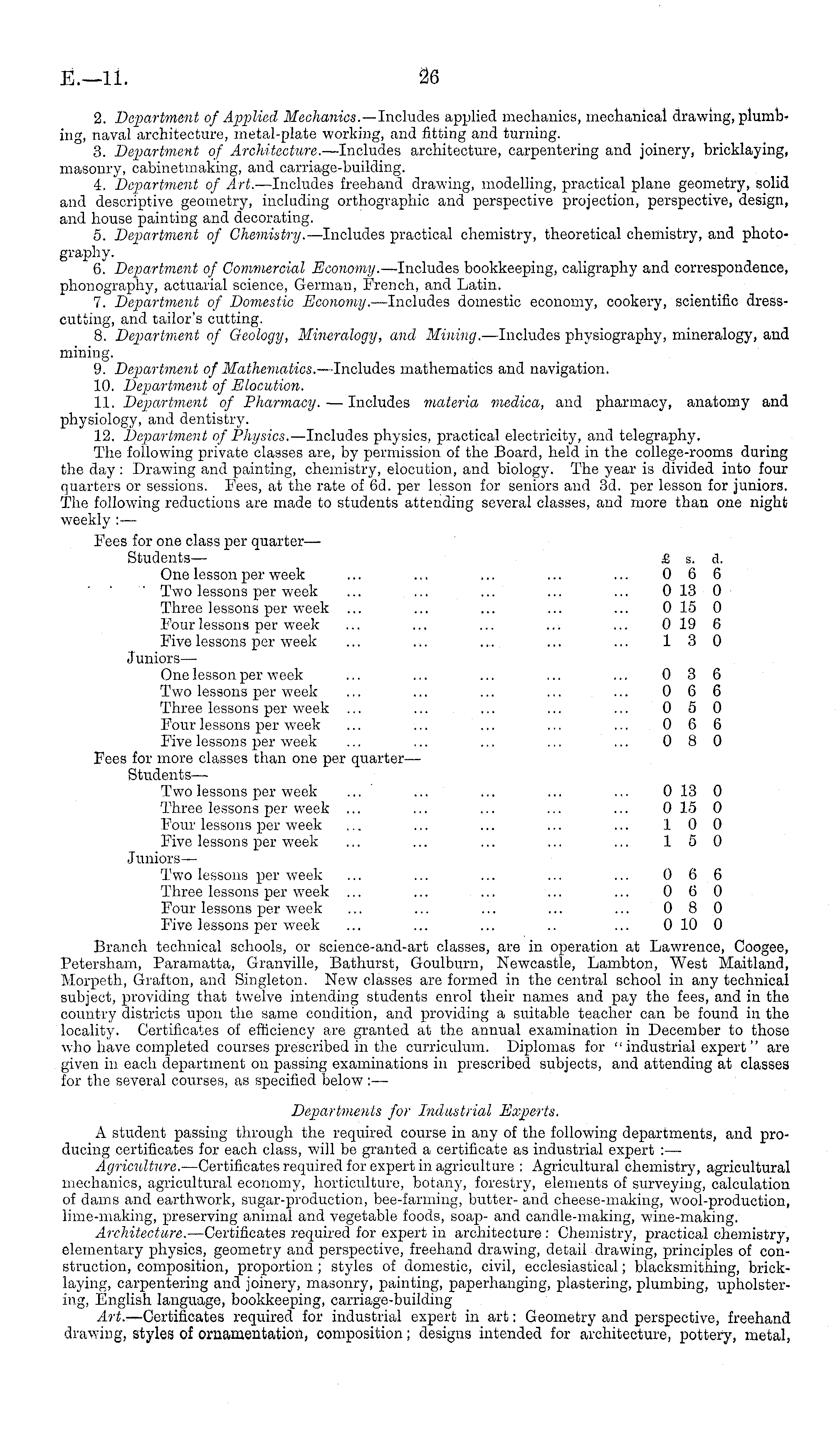 2. Department of Applied Mechanics. —Includes applied mechanics, mechanical drawing, plumbing, naval architecture, metal-plate working, and fitting and turning. 3. Department of Architecture. —lncludes architecture, carpentering and joinery, bricklaying, masonry, cabinetinaking, and carriage-building. 4. Department of Art. —Includes freehand drawing, modelling, practical plane geometry, solid and descriptive geometry, including orthographic and perspective projection, perspective, design, and house painting and decorating. 5. Department of Chemistry. —Includes practical chemistry, theoretical chemistry, and photography. 6. Department of Commercial Economy. —lncludes bookkeeping, caligraphy and correspondence, phonography, actuarial science, German, French, and Latin. 7. Department of Domestic Economy. —lncludes domestic economy, cookery, scientific dresscutting, and tailor's cutting. 8. Department of Geology, Mineralogy, and Mining. —lncludes physiography, mineralogy, and mining. 9. Department of Mathematics. —lncludes mathematics and navigation. 10. Department of Elocution. 11. Department of Pharmacy. — Includes materia medica, and pharmacy, anatomy and physiology, and dentistry. 12. Department of Physics. —lncludes physics, practical electricity, and telegraphy. The following private classes are, by permission of the Board, held in the college-rooms during the day: Drawing and painting, chemistry, elocution, and biology. The year is divided into four quarters or sessions. Fees, at the rate of 6d. per lesson for seniors and 3d. per lesson for juniors. The following reductions are made to students attending several classes, and more than one night weekly : — Fees for one class per quarter— Students — £ s. a. One lesson per week ... ... ... ... ... 066 Two lessons per week ... ... ... ... ... 013 0 Three lessons per week ... ... ... ... ... 0150 Four lessons per week ... ... ... ... ... 0196 Five lessons per week ... ... ... ... ... 130 Juniors— One lesson per week ... ... ... ... ... 036 Two lessons per week ... ... ... ... ... 066 Three lessons per week ... ... ... ... ... 050 Four lessons per w Teek ... ... ... ... ... 066 Five lessons per week ... ... ... ... ... 080 Fees for more classes than one per quarter — Students — Two lessons per week ... ... ... ... ... 0130 Three lessons per week ... ... ... ... ... 0150 Four lessons per week ... ... ... ... ... 100 Five lessons per week ... ... ... ... ... 150 JuniorsTwo lessons per week ... ... ... ... ... 066 Three lessons per week ... ... ... ... ... 060 Four lessons per week ... ... ... ... ... 080 Five lessons per week ... ... ... .. ... 010 0 Branch technical schools, or science-and-art classes, are in operation at Lawrence, Coogee, Petersham, Paramatta, Granville, Bathurst, Goulburn, Newcastle, Lambton, West Maitland, Morpeth, Grafton, and Singleton. New classes are formed in the central school in any technical subject, providing that twelve intending students enrol their names and pay the fees, and in the country districts upon the same condition, and providing a suitable teacher can be found in the locality. Certificates of efficiency are granted at the annual examination in December to those who have completed courses prescribed in the curriculum. Diplomas for " industrial expert " are given in each department on passing examinations in prescribed subjects, and attending at classes for the several courses, as specified below : — Departments for Industrial Experts. A student passing through the required course in any of the following departments, and producing certificates for each class, will be granted a certificate as industrial expert :— Agriculture.- —Certificates required for expert in agriculture : Agricultural chemistry, agricultural mechanics, agricultural economy, horticulture, botany, forestry, elements of surveying, calculation of dams and earthwork, sugar-production, bee-farming, butter- and cheese-making, wool-production, lime-making, preserving animal and vegetable foods, soap- and candle-making, wine-making. Architecture. —Certificates required for expert in architecture : Chemistry, practical chemistry, elementary physics, geometry and perspective, freehand drawing, detail drawing, principles of construction, composition, proportion; styles of domestic, civil, ecclesiastical; blacksmithing, bricklaying, carpentering and joinery, masonry, painting, paperhanging, plastering, plumbing, upholstering, English language, bookkeeping, carriage-building Art. —Certificates required for industrial expert in art: Geometry and perspective, freehand drawing, styles of ornamentation, composition; designs intended for architecture, pottery, metal,