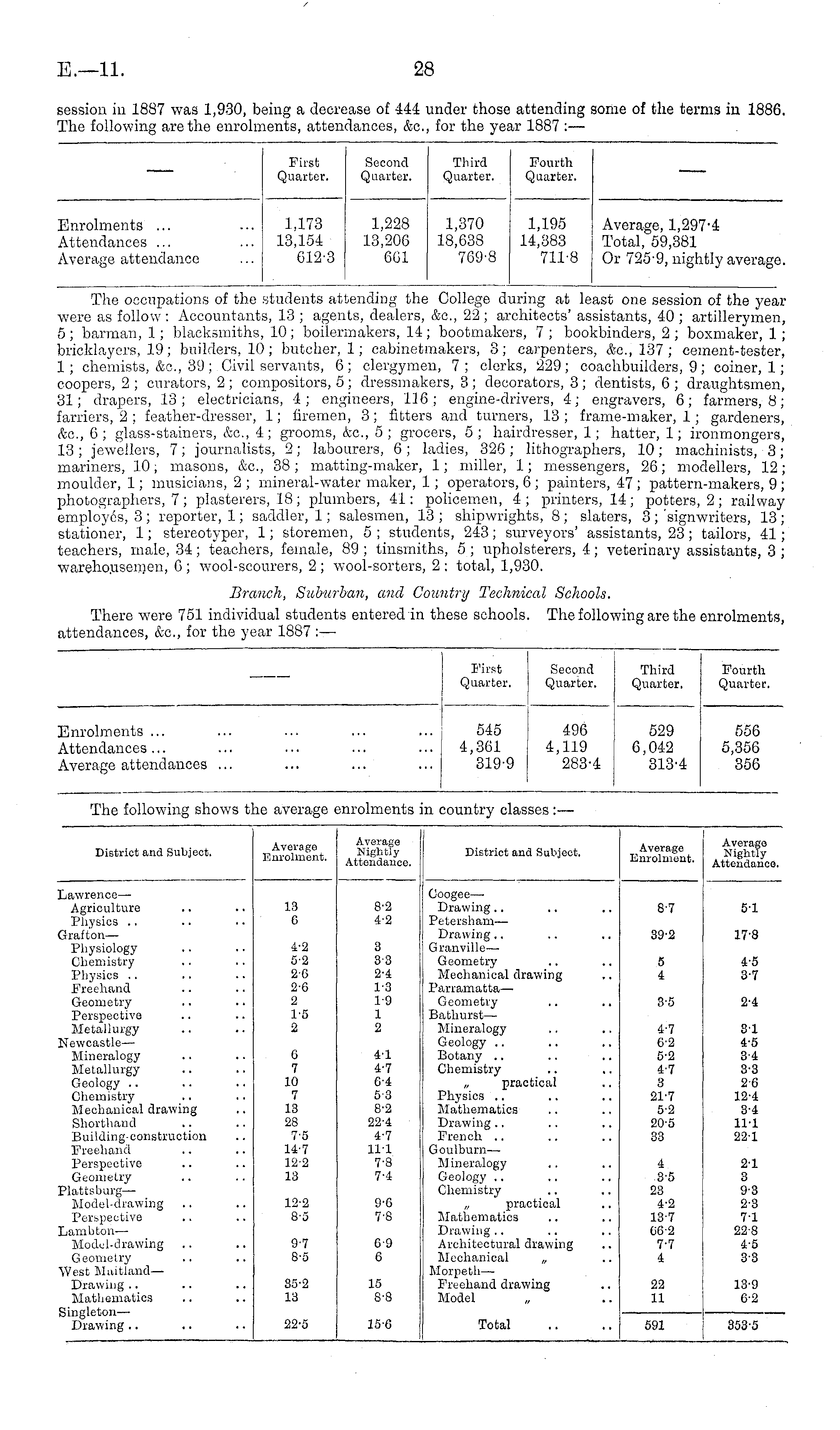 The occupations of the students attending the College during at least one session of the year were as follow : Accountants, 13 ; agents, dealers, &c, 22 ; architects' assistants, 40 ; artillerymen, 5 ; barman, 1; blacksmiths, 10; boilermakers, 14; bootmakers, 7 ; bookbinders, 2 ; boxmaker, 1 ; bricklayers, 19; builders, 10 ; butcher, 1; cabinetmakers, 3; carpenters, &c, 137 ; cement-tester, 1; chemists, &c, 39; Civil servants, 6; clergymen, 7; clerks, 229; coachbuilders, 9; coiner, 1; coopers, 2 ; curators, 2 ; compositors, 5 ; dressmakers, 3 ; decorators, 3 ; dentists, 6 ; draughtsmen, 31; drapers, 13; electricians, 4; engineers, 116; engine-drivers, 4; engravers, 6; farmers, 8; farriers, 2 ; feather-dresser, 1; firemen, 3; fitters and turners, 13 ; frame-maker, 1 ; gardeners, &c, 6; glass-stainers, &c, 4; grooms, <tec, 5; grocers, 5; hairdresser, 1; hatter, 1; ironmongers, 13 ; jewellers, 7; journalists, 2; labourers, 6 ; ladies, 326 ; lithographers, 10 ; machinists, 3; mariners, 10; masons, &c, 38; matting-maker, 1; miller, 1; messengers, 26; modellers, 12; moulder, 1; musicians, 2 ; mineral-water maker, 1 ; operators, 6 ; painters, 47 ; pattern-makers, 9 ; photographers, 7 ; plasterers, 18; plumbers, 41: policemen, 4; printers, 14; potters, 2; railway employes, 3; reporter,!; saddler, 1; salesmen, 13; shipwrights, 8; slaters, 3; signwriters, 13; stationer, 1; stereotyper, 1; storemen, 5 ; students, 243; surveyors' assistants, 23 ; tailors, 41 ; teachers, male, 34; teachers, female, 89 ; tinsmiths, 5 ; upholsterers, 4; veterinary assistants, 3 ; warehousemen, 6; wool-scourers, 2 ; w;ool-sorters, 2 : total, 1,930. Branch, Suburban, and Country Technical Schools. There were 751 individual students entered in these schools. The following are the enrolments, attendances, &c, for the year 1887 : —