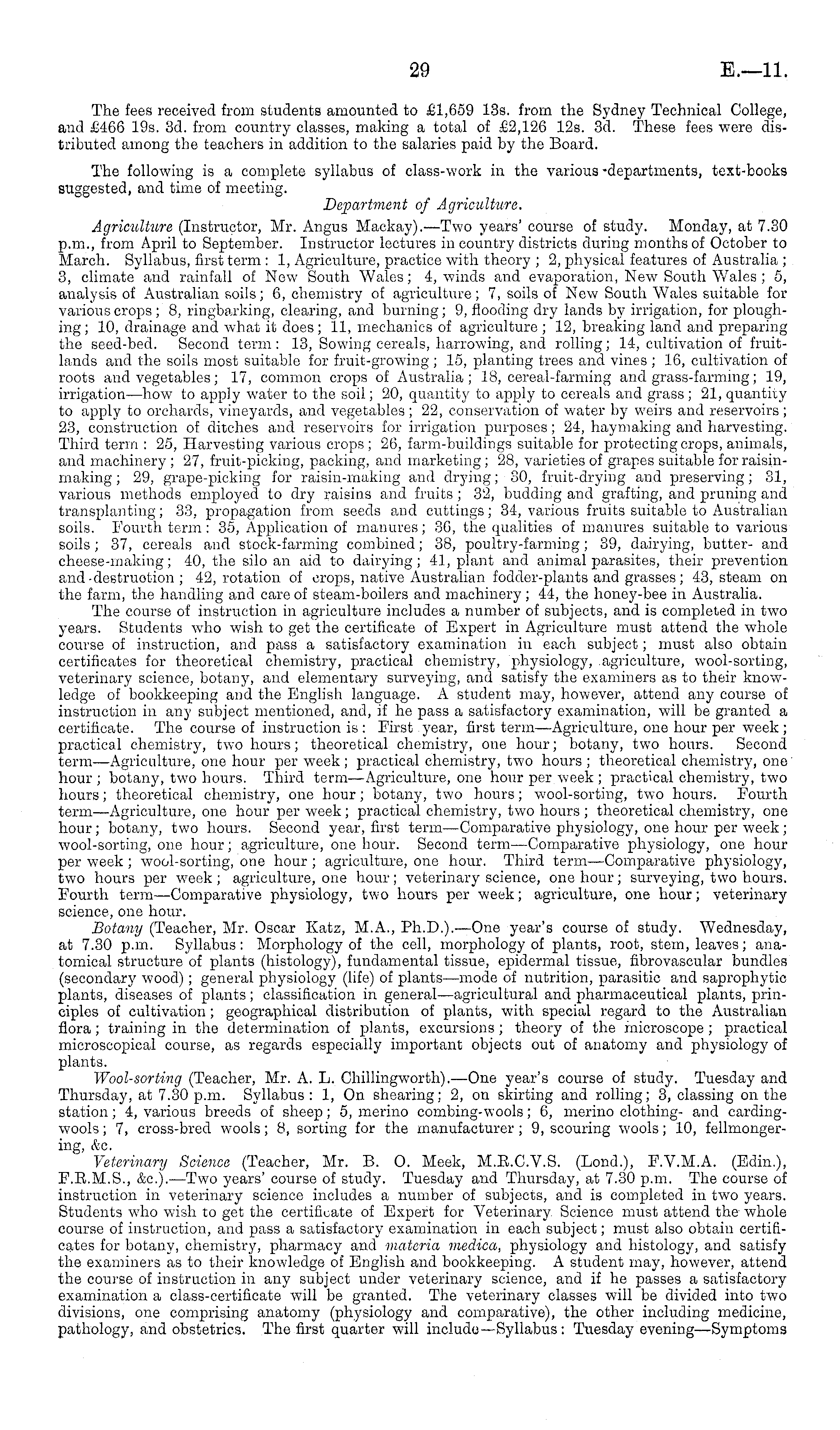 The fees received from students amounted to £1,659 13s. from the Sydney Technical College, and £466 19s. 3d. from country classes, making a total of £2,126 12s. 3d. These fees were distributed among the teachers in addition to the salaries paid by the Board. The following is a complete syllabus of class-work in the various -departments, text-books suggested, and time of meeting. Department of Agriculture. Agriculture (Instructor, Mr. Angus Mackay).—Two years' course of study. Monday, at 7.30 p.m., from April to September. Instructor lectures in country districts during months of October to March. Syllabus, first term :1, Agriculture, practice with theory ;2, physical features of Australia ; 3, climate and rainfall of New South Wales; 4, winds and evaporation, New South Wales ; 5, analysis of Australian soils; 6, chemistry of agriculture; 7, soils of New South Wales suitable for various crops ; 8, ringbarking, clearing, and burning; 9, flooding dry lands by irrigation, for ploughing ; 10, drainage and what it does ; 11, mechanics of agriculture ; 12, breaking land and preparing the seed-bed. Second term : 13, Sowing cereals, harrowing, and rolling ; 14, cultivation of fruitlands and the soils most suitable for fruit-growing; 15, planting trees and vines ; 16, cultivation of roots and vegetables; 17, common crops of Australia; 18, cereal-farming and grass-farming; 19, irrigation—how to apply water to the soil; 20, quantity to apply to cereals and grass; 21, quantity to apply to orchards, vineyards, and vegetables; 22, conservation of water by weirs and reservoirs; 23, construction of ditches and reservoirs for irrigation purposes; 24, haymaking and harvesting. Third term : 25, Harvesting various crops ; 26, farm-buildings suitable for protecting crops, animals, and machinery ; 27, fruit-picking, packing, and marketing ; 28, varieties of grapes suitable forraisinmaking; 29, grape-picking for raisin-making and drying; 30, fruit-drying and preserving; 31, various methods employed to dry raisins and fruits ; 32, budding and grafting, and pruning and transplanting; 33, propagation from seeds and cuttings; 34, various fruits suitable to Australian soils. Fourth term: 35, Application of manures; 36, the qualities of manures suitable to various soils; 37, cereals and stock-farming combined; 38, poultry-farming; 39, dairying, butter- and cheese-making; 40, the silo an aid to dairying; 41, plant and animal parasites, their prevention and -destruction ; 42, rotation of crops, native Australian fodder-plants and grasses; 43, steam on the farm, the handling and care of steam-boilers and machinery ; 44, the honey-bee in Australia. The course of instruction in agriculture includes a number of subjects, and is completed in tw To years. Students who wish to get the certificate of Expert in Agriculture must attend the whole course of instruction, and pass a satisfactory examination in each subject; must also obtain certificates for theoretical chemistry, practical chemistry, physiology, agriculture, wool-sorting, veterinary science, botany, and elementary surveying, and satisfy the examiners as to their knowledge of bookkeeping and the English language. A student may, however, attend any course of instruction in any subject mentioned, and, if he pass a satisfactory examination, will be granted a certificate. The course of instruction is: First year, first term—Agriculture, one hour per week; practical chemistry, two hours; theoretical chemistry, one hour; botany, two hours. Second term—.Agriculture, one hour per week ; practical chemistry, two hours ; theoretical chemistry, one hour ; botany, two hours. Third term—Agriculture, one hour per week ; practical chemistry, two hours; theoretical chemistry, one hour; botany, two hours; wool-sorting, two hours. Fourth term —Agriculture, one hour per week; practical chemistry, two hours; theoretical chemistry, one hour; botany, two hours. Second year, first term —Comparative physiology, one hour per week; wool-sorting, one hour; agriculture, one hour. Second term—Comparative physiology, one hour per week ; wool-sorting, one hour ; agriculture, one hour. Third term—Comparative physiology, two hours per week ; agriculture, one hour; veterinary science, one hour; surveying, two hours. Fourth term—Comparative physiology, two hours per week; agriculture, one hour; veterinary science, one hour. Botany (Teacher, Mr. Oscar Katz, M.A., Ph.D.). —One year's course of study. Wednesday, at 7.30 p.m. Syllabus : Morphology of the cell, morphology of plants, root, stem, leaves; anatomical structure of plants (histology), fundamental tissue, epidermal tissue, fibrovascular bundles (secondary wood); general physiology (life) of plants—mode of nutrition, parasitic and saprophytic plants, diseases of plants; classification in general—agricultural and pharmaceutical plants, principles of cultivation ; geographical distribution of plants, with special regard to the Australian flora ; training in the determination of plants, excursions ; theory of the microscope ; practical microscopical course, as regards especially important objects out of anatomy and physiology of plants. Wool-sorting (Teacher, Mr. A. L. Cbillingworth).—One year's course of study. Tuesday and Thursday, at 7.30 p.m. Syllabus: 1, On shearing; 2, on skirting and rolling; 3, classing on the station; 4, various breeds of sheep; 5, merino combing-wools; 6, merino clothing- and cardingwools; 7, cross-bred wools; 8, sorting for the manufacturer; 9, scouring wools; 10, fellmongering, &c. Veterinary Science (Teacher, Mr. B. O. Meek, M.B.C.V.S. (Bond.), F.V.M.A. (Edin.), F.8.M.5., &c). —Two years' course of study. Tuesday and Thursday, at 7.30 p.m. The course of instruction in veterinary science includes a number of subjects, and is completed in two years. Students who wish to get the certificate of Expert for Veterinary Science must attend the whole course of instruction, and pass a satisfactory 