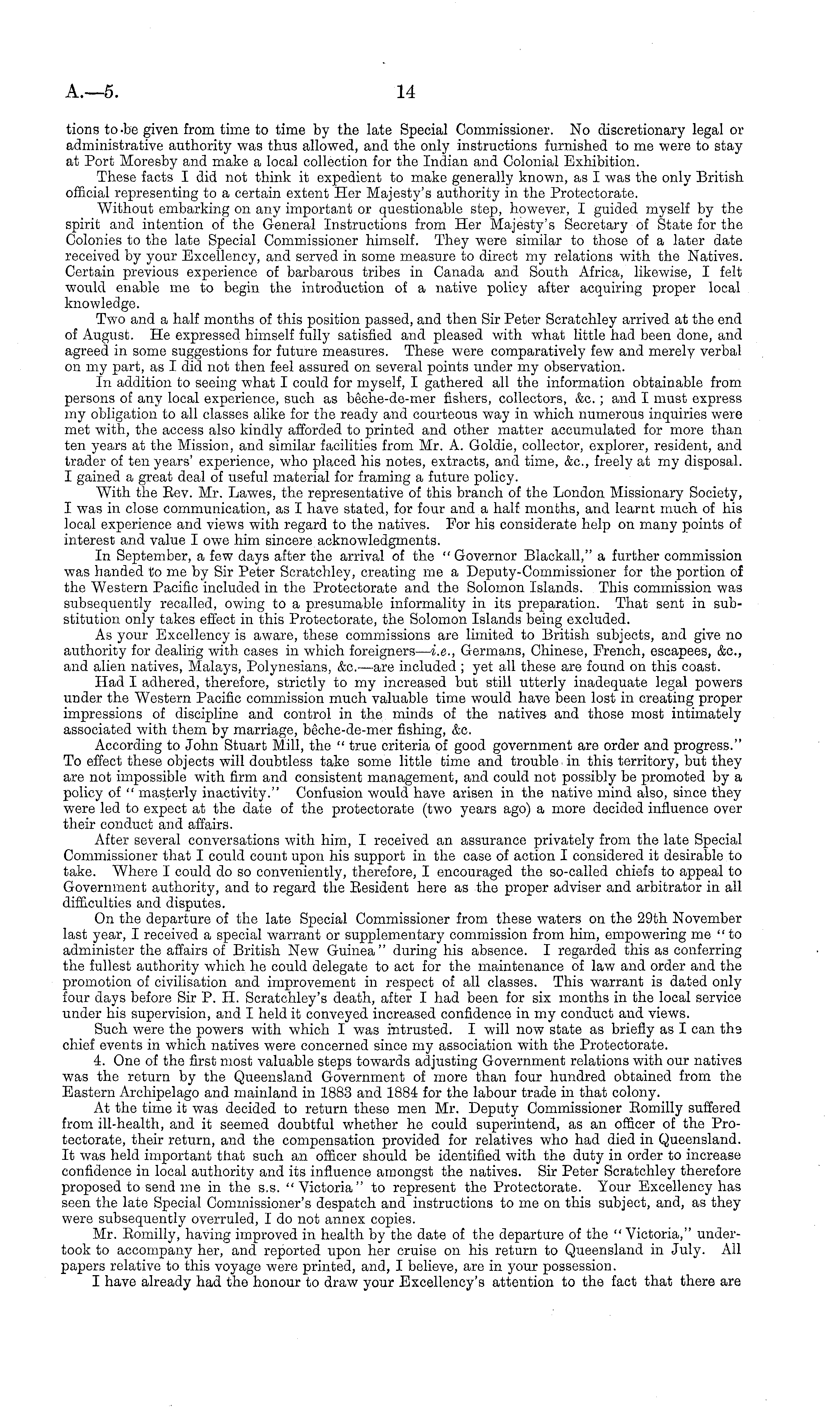 tions to-be given from time to time by the late Special Commissioner. No discretionary legal or administrative authority was thus allowed, and the only instructions furnished to me were to stay at Port Moresby and make a local collection for the Indian and Colonial Exhibition. These facts I did not think it expedient to make generally known, as I was the only British official representing to a certain extent Her Majesty's authority in the Protectorate. Without embarking on any important or questionable step, however, I guided myself by the spirit and intention of the General Instructions from Her Majesty's Secretary of State for the Colonies to the late Special Commissioner himself. They were similar to those of a later date received by your Excellency, and served in some measure to direct my relations with the Natives. Certain previous experience of barbarous tribes in Canada and South Africa, likewise, I felt would enable me to begin the introduction of a native policy after acquiring proper local knowledge. Two and a half months of this position passed, and then Sir Peter Scratchley arrived at the end of August. He expressed himself fully satisfied and pleased with what little had been done, and agreed in some suggestions for future measures. These were comparatively few and merely verbal on my part, as I did not then feel assured on several points under my observation. In addition to seeing what I could for myself, I gathered all the information obtainable from persons of any local experience, such as beche-de-mer fishers, collectors, &c. ; and I must express my obligation to all classes alike for the ready and courteous way in which numerous inquiries were met with, the access also kindly afforded to printed and other matter accumulated for more than ten years at the Mission, and similar facilities from Mr. A. Goldie, collector, explorer, resident, and trader of ten years' experience, who placed his notes, extracts, and time, &c, freely at my disposal. I gained a great deal of useful material for framing a future policy. With the Eev. Mr. Lawes, the representative of this branch of the London Missionary Society, I was in close communication, as I have stated, for four and a half months, and learnt much of his local experience and views with regard to the natives. For his considerate help on many points of interest and value I owe him sincere acknowledgments. In September, a few days after the arrival of the " Governor Blackall," a further commission was handed to me by Sir Peter Scratchley, creating me a Deputy-Commissioner for the portion of the Western Pacific included in the Protectorate and the Solomon Islands. This commission was subsequently recalled, owing to a presumable informality in its preparation. That sent in substitution only takes effect in this Protectorate, the Solomon Islands being excluded. As your Excellency is aware, these commissions are limited to British subjects, and give no authority for dealing with cases in which foreigners— i.e., Germans, Chinese, French, escapees, &c, and alien natives, Malays, Polynesians, &c. —are included ; yet all these are found on this coast. Had I adhered, therefore, strictly to my increased but still utterly inadequate legal powers under the Western Pacific commission much valuable time would have been lost in creating proper impressions of discipline and control in the minds of the natives and those most intimately associated with them by marriage, beche-de-mer fishing, &c. According to John Stuart Mill, the " true criteria of good government are order and progress." To effect these objects will doubtless take some little time and trouble in this territory, but they are not impossible with firm and consistent management, and could not possibly be promoted by a policy of " masterly inactivity." Confusion would have arisen in the native mind also, since they were led to expect at the date of the protectorate (two years ago) a more decided influence over their conduct and affairs. After several conversations with him, I received an assurance privately from the late Special Commissioner that I could count upon his support in the case of action I considered it desirable to take. Where I could do so conveniently, therefore, I encouraged the so-called chiefs to appeal to Government authority, and to regard the Eesident here as the proper adviser and arbitrator in all difficulties and disputes. On the departure of the late Special Commissioner from these waters on the 29th November last year, I received a special warrant or supplementary commission from him, empowering me " to administer the affairs of British New Guinea" during his absence. I regarded this as conferring the fullest authority which he could delegate to act for the maintenance of law and order and the promotion of civilisation and improvement in respect of all classes. This warrant is dated only four days before Sir P. H. Scratchley's death, after I had been for six months in the local service under his supervision, and I held it conveyed increased confidence in my conduct and views. Such were the powers with which I was intrusted. I will now state as briefly as I can tha chief events in which natives were concerned since my association with the Protectorate. 4. One of the first most valuable steps towards adjusting Government relations with our natives was the return by the Queensland Government of more than four hundred obtained from the Eastern Archipelago and mainland in 1883 and 1884 for the labour trade in that colony. At the time it was decided to return these men Mr. Deputy Commissioner Eomilly suffered from ill-health, and it seemed doubtful whether he could superintend, as an officer of the Protectorate, their return, and the compensation provided for relatives who had died in Queensland. It was held important that such an officer should be identified with the duty in order to increase confidence in local authority and its influence amongst the natives. S
