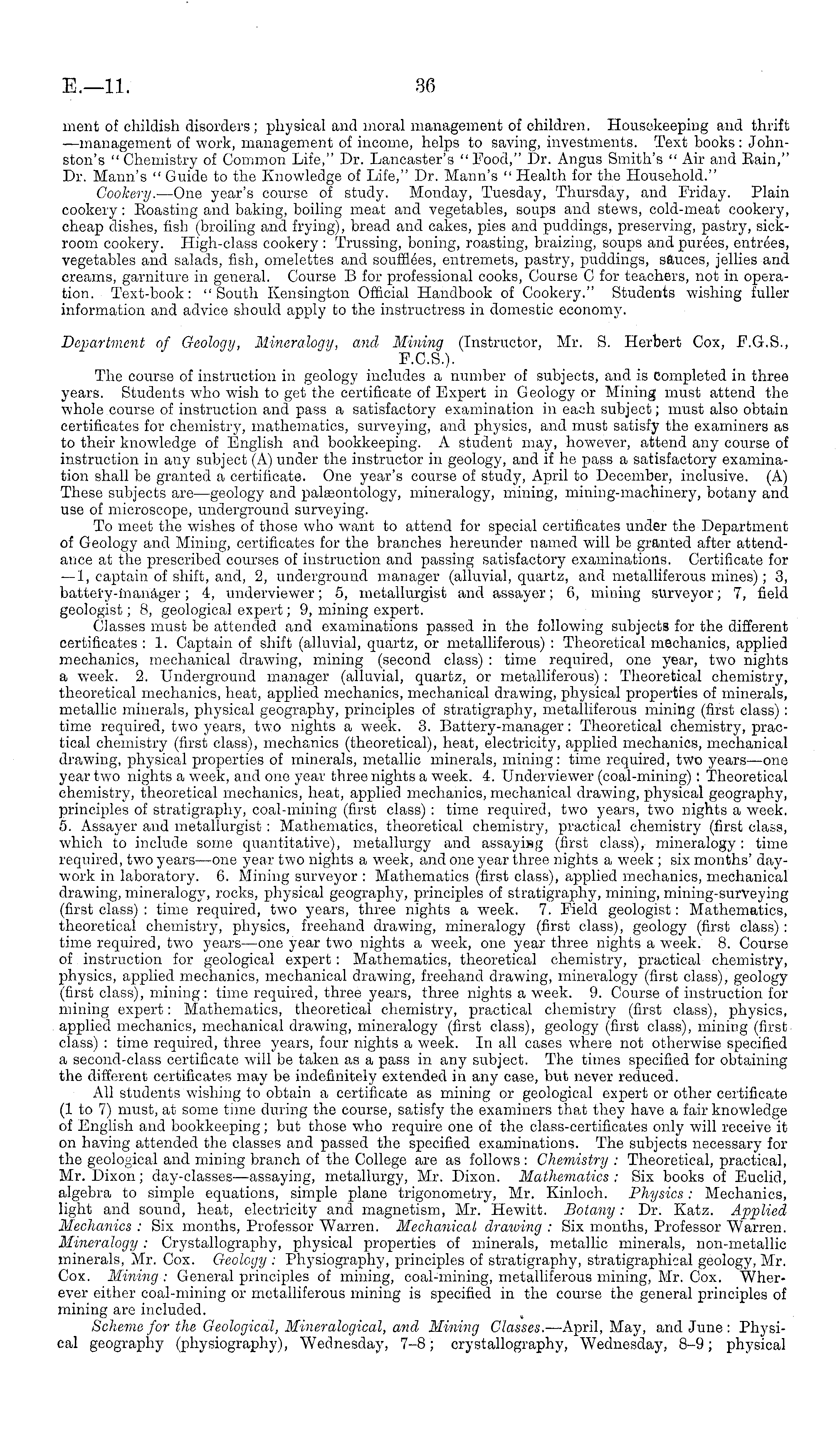 ment of childish disorders; physical and moral management of children. Housekeeping and thrift —management of work, management of income, helps to saving, investments. Text books: Johnston's " Chemistry of Common Life," Dr. Lancaster's "Food," Dr. Angus Smith's " Air and Rain," Dr. Mann's " Guide to the Knowledge of Life," Dr. Mann's " Health for the Household." Cookery. —One year's course of study. Monday, Tuesday, Thursday, and Friday. Plain cookery : Roasting and baking, boiling meat and vegetables, soups and stews, cold-meat cookery, cheap dishes, fish (broiling and frying), bread and cakes, pies and puddings, preserving, pastry, sickroom cookery. High-class cookery : Trussing, boning, roasting, braizing, soups and purees, entrees, vegetables and salads, fish, omelettes and soufflees, entremets, pastry, puddings, sauces, jellies and creams, garniture in general. Course B for professional cooks, Course C for teachers, not in operation. Text-book: "South Kensington Official Handbook of Cookery." Students wishing fuller information and advice should apply to the instructress in domestic economy. Department of Geology, Mineralogy, and Mining (Instructor, Mr. S. Herbert Cox, F.G.S., F.C.S.). The course of instruction in geology includes a number of subjects, and is Completed in three years. Students who wish to get the certificate of Expert in Geology or Mining must attend the whole course of instruction and pass a satisfactory examination in each subject; must also obtain certificates for chemistry, mathematics, surveying, and physics, and must satisfy the examiners as to their knowledge of English and bookkeeping. A student may, however, attend any course of instruction in any subject (A) under the instructor in geology, and if he pass a satisfactory examination shall be granted a certificate. One year's course of study, April to December, inclusive. (A) These subjects are —geology and palaeontology, mineralogy, mining, mining-machinery, botany and use of microscope, underground surveying. To meet the wishes of those who want to attend for special certificates under the Department of Geology and Mining, certificates for the branches hereunder named will be granted after attendance at the prescribed courses of instruction and passing satisfactory examinations. Certificate for —1, captain of shift, and, 2, underground manager (alluvial, quartz, and metalliferous mines) ; 3, battery-manager; 4, underviewer; 5, metallurgist and assayer; 6, mining surveyor; 7, field geologist; 8, geological expert; 9, mining expert. Classes must be attended and examinations passed in the following subjects for the different certificates : 1. Captain of shift (alluvial, quartz, or metalliferous) : Theoretical mechanics, applied mechanics, mechanical drawing, mining (second class) : time required, one year, two nights a week. 2. Underground manager (alluvial, quartz, or metalliferous) : Theoretical chemistry, theoretical mechanics, heat, applied mechanics, mechanical drawing, physical properties of minerals, metallic minerals, physical geography, principles of stratigraphy, metalliferous mining (first class) : time required, two years, two nights a week. 3. Battery-manager: Theoretical chemistry, practical chemistry (first class), mechanics (theoretical), heat, electricity, applied mechanics, mechanical drawing, physical properties of minerals, metallic minerals, mining: time required, two years—one year two nights a week, and one year three nights a week. 4. Underviewer (coal-mining): Theoretical chemistry, theoretical mechanics, heat, applied mechanics, mechanical drawing, physical geography, principles of stratigraphy, coal-mining (first class) : time required, two years, two nights a week. 5. Assayer and metallurgist : Mathematics, theoretical chemistry, practical chemistry (first class, which to include some quantitative), metallurgy and assayisg (first class), mineralogy: time required, two years—one year two nights a week, and one year three nights a week ; six months' daywork in laboratory. 6. Mining surveyor : Mathematics (first class), applied mechanics, mechanical drawing, mineralogy, rocks, physical geography, principles of stratigraphy, mining, mining-surveying (first class) : time required, two years, three nights a week. 7. Field geologist: Mathematics, theoretical chemistry, physics, freehand drawing, mineralogy (first class), geology (first class) : time required, two years —one year two nights a week, one year three nights a week. 8. Course of instruction for geological expert : Mathematics, theoretical chemistry, practical chemistry, physics, applied mechanics, mechanical drawing, freehand drawing, mineralogy (first class), geology (first class), mining : time required, three years, three nights a week. 9. Course of instruction for mining expert: Mathematics, theoretical chemistry, practical chemistry (first class), physics, applied mechanics, mechanical drawing, mineralogy (first class), geology (first class), mining (first class) : time required, three years, four nights a week. In all cases where not otherwise specified a second-class certificate will be taken as a pass in any subject. The times specified for obtaining the different certificates may be indefinitely extended in any case, but never reduced. All students wishing to obtain a certificate as mining or geological expert or other certificate (1 to 7) must, at some time during the course, satisfy the examiners that they have a fair knowledge of English and bookkeeping; but those who require one of the class-certificates only will receive it on having attended the classes and passed the specified examinations. The subjects necessary for the geological and mining branch of the College are as follows : Chemistry : Theoretical, practical, Mr. Dixon; day-classes—assaying, metallurgy, Mr. Dixon. Mathematics: Six books of Euclid, algebra to simple equations, simple plane trigonometry, Mr. Kinloch. Physics : Mechanics, lig