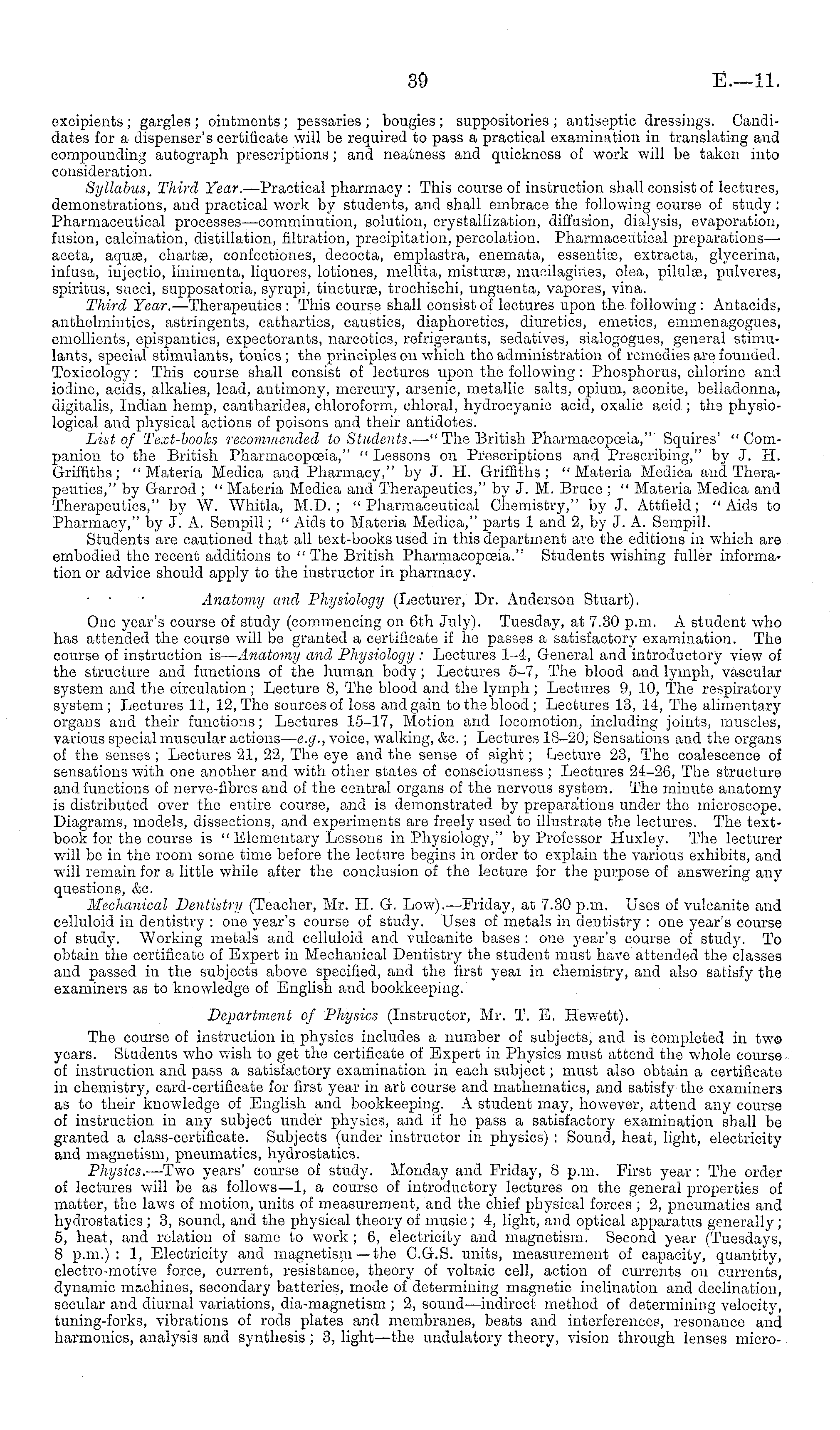 excipients; gargles ; ointments; pessaries ; bougies ; suppositories ; antiseptic dressings. Candidates for a dispenser's certificate will be required to pass a practical examination in translating and compounding autograph prescriptions; and neatness and quickness of work will be taken into consideration. Syllabus, Third Year. —Practical pharmacy : This course of instruction shall consist of lectures, demonstrations, and practical work by students, and shall embrace the following course of study : Pharmaceutical processes —comminution, solution, crystallization, diffusion, dialysis, evaporation, fusion, calcination, distillation, filtration, precipitation, percolation. Pharmaceutical preparations— aceta, aquas, chartae, confectiones, decocta, emplastra, enemata, essentia;, extracta, glycerina, infusa, iujectio, linimenta, liquores, lotiones, mellita, misturas, mucilagines, olea, piluloe, pulveres, spiritus, succi, supposatoria, syrupi, tincturas, trochischi, unguenta, vapores, vina. Third Year. —Therapeutics : This course shall consist of lectures upon the following: Antacids, anthelmintics, astringents, cathartics, caustics, diaphoretics, diuretics, emetics, emmenagogues, emollients, epispantics, expectorants, narcotics, refrigerants, sedatives, sialogogues, general stimulants, special stimulants, tonics; the principles on which the administration of remedies are founded. Toxicology: This course shall consist of lectures upon the following: Phosphorus, chlorine and iodine, acids, alkalies, lead, antimony, mercury, arsenic, metallic salts, opium, aconite, belladonna, digitalis, Indian hemp, cantharides, chloroform, chloral, hydrocyanic acid, oxalic acid ; the physiological and physical actions of poisons and their antidotes. List of Text-books recommended to Students. —■" The British Pharmacopoeia," Squires' " Companion to the British Pharmacopoeia," "Lessons on Prescriptions and Prescribing," by J. 11. Griffiths; "Materia Medica and Pharmacy," by J. 11. Griffiths; "Materia Medica and Therapeutics," by Garrod ; " Materia Medica and Therapeutics," by J. M. Bruce ; " Materia Medica and Therapeutics," by W. Whitla, M.D. ; "Pharmaceutical Chemistry," by J. Attfield; "Aids to Pharmacy," by J. A. Sempill; " Aids to Materia Medica," parts 1 and 2, by J. A. Sempill. Students are cautioned that all text-books used in this department are the editions in which are embodied the recent additions to " The British Pharmacopoeia." Students wishing fuller information or advice should apply to the instructor in pharmacy. Anatomy and Physiology (Lecturer, Dr. Anderson Stuart). One year's course of study (commencing on 6th July). Tuesday, at 7.30 p.m. A student who has attended the course will be granted a certificate if he passes a satisfactory examination. The course of instruction is— Anatomy and Physiology : Lectures 1-4, General and introductory view of the structure and functions of the human body; Lectures 5-7, The blood and lymph, vascular system and the circulation; Lecture 8, The blood and the lymph ; Lectures 9, 10, The respiratory system; Lectures 11, 12, The sources of loss and gain to the blood; .Lectures 13, 14, The alimentary organs and their functions; Lectures 15-17, Motion and locomotion, including joints, muscles, various special muscular actions— e.g., voice, walking, &c.; Lectures 13-20, Sensations and the organs of the senses ; Lectures 21, 22, The eye and the sense of sight; Lecture 23, The coalescence of sensations with one another and with other states of consciousness ; Lectures 24-26, The structure and functions of nerve-fibres and of the central organs of the nervous system. The minute anatomy is distributed over the entire course, and is demonstrated by preparations under the microscope. Diagrams, models, dissections, and experiments are freely used to illustrate the lectures. The textbook for the course is " Elementary Lessons in Physiology," by Professor Huxley. The lecturer will be in the room some time before the lecture begins in order to explain the various exhibits, and will remain for a little while after the conclusion of the lecture for the purpose of answering any questions, &c. Mechanical Dentistry (Teacher, Mr. H. G. Low). —Friday, at 7.30 p.m. Uses of vulcanite and celluloid in dentistry : one year's course of study. Uses of metals in dentistry : one year's course of study. Working metals and celluloid and vulcanite bases : one year's course of study. To obtain the certificate of Expert in Mechanical Dentistry the student must have attended the classes and passed in the subjects above specified, and the first year in chemistry, and also satisfy the examiners as to knowledge of English and bookkeeping. Department of Physics (Instructor, Mr. T. E. Hewett). The course of instruction in physics includes a number of subjects, and is completed in two years. Students who wish to get the certificate of Expert in Physics must attend the whole course of instruction and pass a satisfactory examination in each subject; must also obtain a certificate in chemistry, card-certificate for first year in art course and mathematics, and satisfy the examiners as to their knowledge of English and bookkeeping. A student may, however, attend any course of instruction in any subject under physics, and if he pass a satisfactory examination shall be granted a class-certificate. Subjects (under instructor in physics) : Sound, heat, light, electricity and magnetism, pneumatics, hydrostatics. Physics. —-Two years' course of study. Monday and Friday, 8 p.m. First year: The order of lectures will be as follows—l, a course of introductory lectures on the general properties of matter, the laws of motion, units of measurement, and the chief physical forces ; 2, pneumatics and hydrostatics; 3, sound, and the physical theory of music; 4, light, and optical apparatus generally; 5, heat, and relation of same to work ;6, electricity and magnetism. Second year (Tuesdays, 8 p.m.) : 