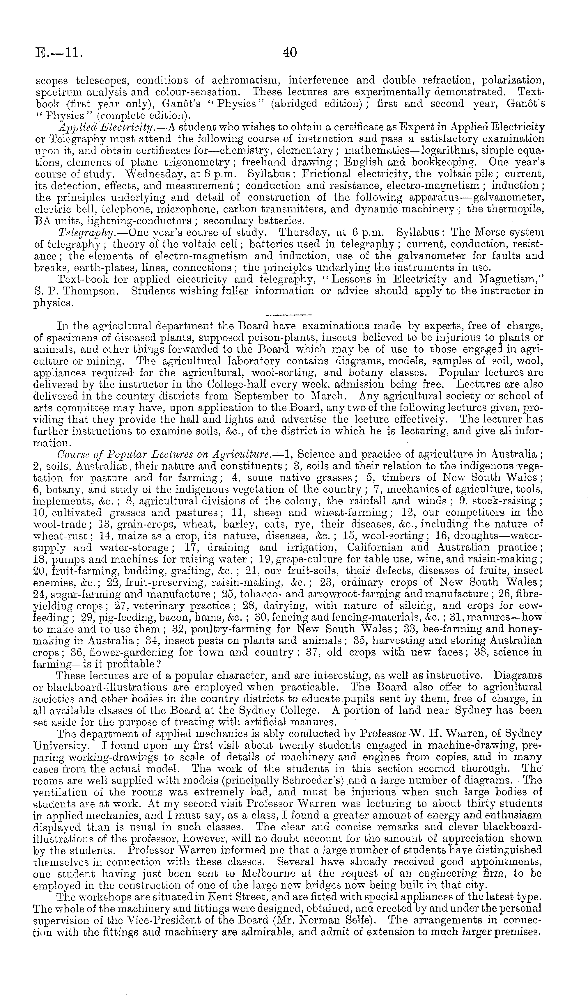 In the agricultural department the Board have examinations made by experts, free of charge, of specimens of diseased plants, supposed poison-plants, insects believed to be injurious to plants or animals, and other things forwarded to the Board which may be of use to those engaged in agriculture or mining. The agricultural laboratory contains diagrams, models, samples of soil, wool, appliances required for the agricultural, wool-sorting, and botany classes. Popular lectures are delivered by the instructor in the College-hall every week, admission being free. Lectures are also delivered in the country districts from September to March. Any agricultural society or school of arts committee may have, upon application to the Board, any two of the following lectures given, providing that they provide the hall and lights and advertise the lecture effectively. The lecturer has further instructions to examine soils, &c, of the district in which he is lecturing, and give all information. Course of Popular Lectures on Agriculture. —1, Science and practice of agriculture in Australia ; 2, soils, Australian, their nature and constituents; 3, soils and their relation to the indigenous vegetation for pasture and for farming; 4, some native grasses; 5, timbers of New South Wales ; 6, botany, and study of the indigenous vegetation of the country ; 7, mechanics of agriculture, tools, implements, &c. ; 8, agricultural divisions of the colony, the rainfall and winds ; 9, stock-raising ; 10, cultivated grasses and pastures; 11, sheep and wheat-farming; 12, our competitors in the wool-trade; 13, grain-crops, wheat, barley, oats, rye, their diseases, &c, including the nature of wheat-rust; 14, maize as a crop, its nature, diseases, &c. ; 15, wool-sorting; 16, droughts—watersupply and water-storage; 17, draining and irrigation, Californian and Australian practice; 18, pumps and machines for raising water ; 19, grape-culture for table use, wine, and raisin-making; 20, fruit-farming, budding, grafting, &c. ; 21, our fruit-soils, their defects, diseases of fruits, insect enemies, &c; 22, fruit-preserving, raisin-making, &c. ; 23, ordinary crops of New South Wales; 24, sugar-farming and manufacture; 25, tobacco- and arrowroot-farming and manufacture; 26, fibreyielding crops; 27, veterinary practice ; 28, dairying, with nature of siloing, and crops for cowfeeding ; 29, pig-feeding, bacon, hams, &c. ; 30, fencing and fencing-materials, &c.; 31, manures—how to make and to use them ; 32, poultry-farming for New South Wales; 33, bee-farming and honeymaking in Australia ; 34, insect pests on plants and animals ; 35, harvesting and storing Australian crops; 36, flower-gardening for town and country; 37, old crops with new faces; 38, science in farming—is it profitable ? These lectures are of a popular character, and are interesting, as well as instructive. Diagrams or blackboard-illustrations are employed when practicable. The Board also offer to agricultural societies and other bodies in the country districts to educate pupils sent by them, free of charge, in all available classes of the Board at the Sydney College. A portion of land near Sydney has been set aside for the purpose of treating with artificial manures. The department of applied mechanics is ably conducted by Professor W. H. Warren, of Sydney University. I found upon my first visit about twenty students engaged in machine-drawing, preparing working-drawings to scale of details of machinery and engines from copies, and in many cases from the actual model. The work of the students in this section seemed thorough. The rooms are well supplied with models (principally Schroeder's) and a large number of diagrams. The ventilation of the rooms was extremely bad, and must be injurious when such large bodies of students are at work. At my second visit Professor Warren was lecturing to about thirty students in applied mechanics, and I must say, as a class, I found a greater amount of energy and enthusiasm displayed than is usual in such classes. The clear and concise remarks and clever blackboardillustrations of the professor, however, will no doubt account for the amount of appreciation shown by the students. Professor Warren informed ine that a large number of students have distinguished themselves in connection with these classes. Several have already received good appointments, one student having just been sent to Melbourne at the request of an engineering firm, to be employed in the construction of one of the large new bridges now being built in that city. The workshops are situated in Kent Street, and are fitted with special appliances of the latest type. The whole of the machinery and fittings were designed, obtained, and erected by and under the personal supervision of the Vice-President of the Board (Mr. Norman Selfe). The arrangements in connection with the fittings and machinery are admirable, and admit of extension to much larger premises.