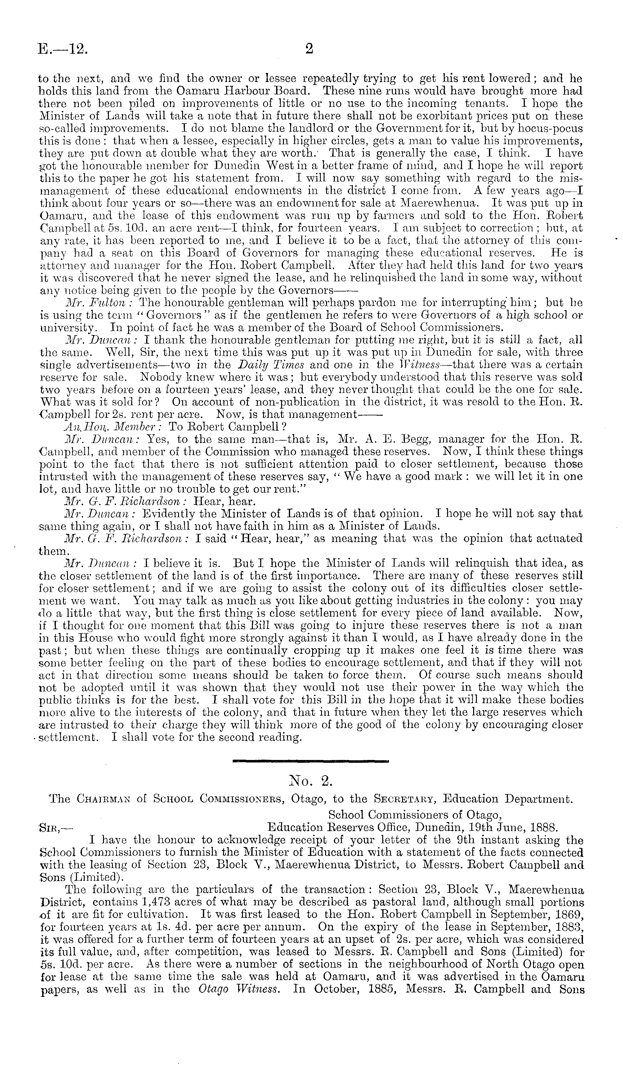 No. 2. The Chairman of School Commissioners, Otago, to the Secketaby, Education Department. School Commissioners of Otago, Sib, — Education Eeserves Office, Dunedin, 19th June, 1888. I have the honour to acknowledge receipt of your letter of the 9th instant asking the School Commissioners to furnish the Minister of Education with a statement of the facts connected with the leasing of Section 23, Block V., Maerewhenua District, to Messrs. Eobert Campbell and Sons (Limited). The following are the particulars of the transaction : Section 23, Block V., Maerewhenua District, contains 1,473 acres of what may be described as pastoral land, although small portions of it are fit for cultivation. It was first leased to the Hon. Eobert Campbell in September, 1869, for fourteen years at Is. 4d. per acre per annum. On the expiry of the lease in September, 1883, it was offered for a further term of fourteen years at an upset of 2s. per acre, which was considered its full value, and, after competition, was leased to Messrs. E. Campbell and Sons (Limited) for ss. lOd. per acre. As there were a number of sections in the neighbourhood of North Otago open for lease at the same time the sale was held at Oamaru, and it was advertised in the Oamaru papers, as well as in the Otago Witness. In October, 1885, Messrs. E. Campbell and Sons