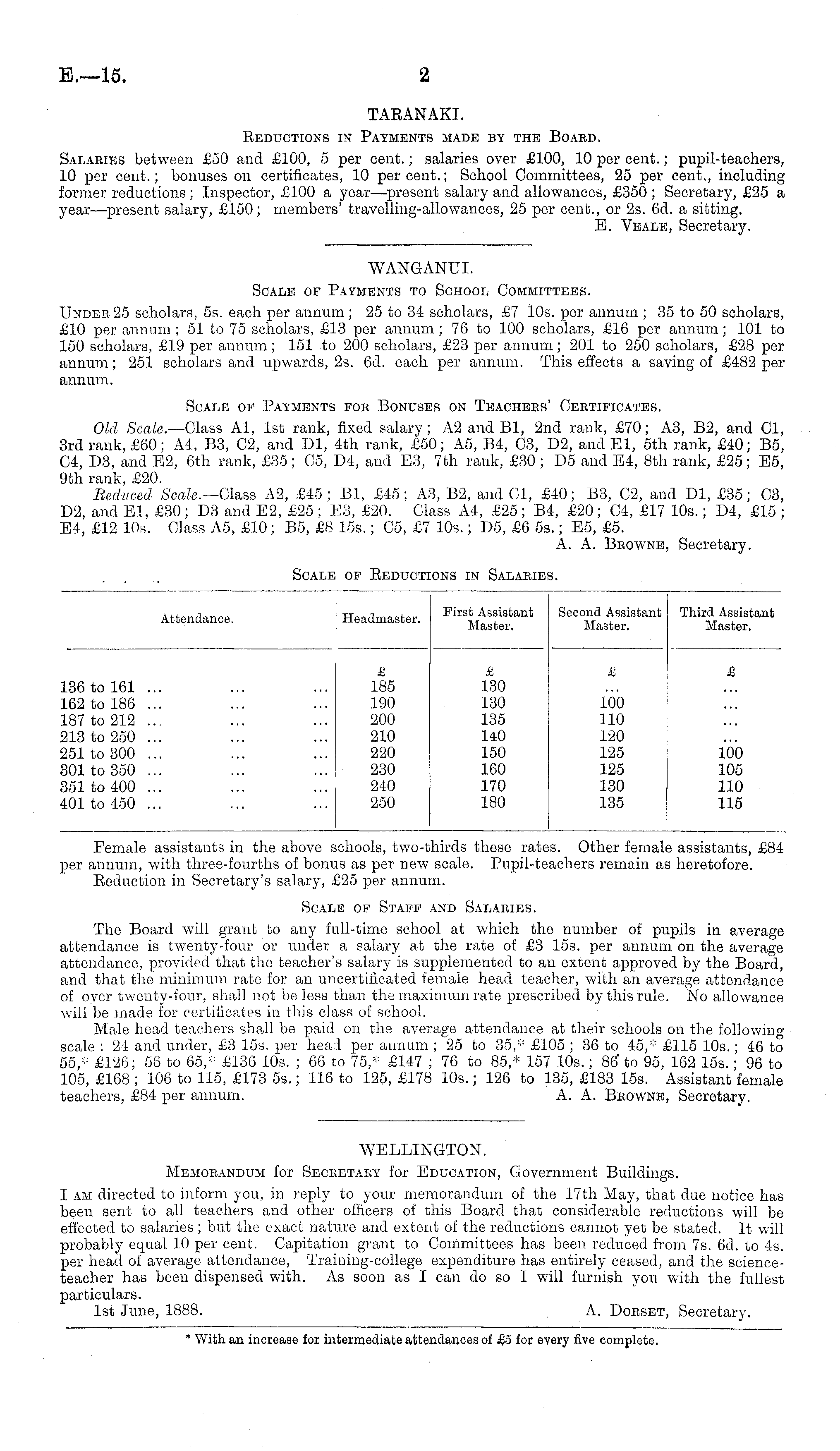WELLINGTON. Memoeandum for Seceetaby for Education, Government Buildings. I am directed to inform you, in reply to your memorandum of the 17th May, that due notice has been sent to all teachers and other officers of this Board that considerable reductions will be effected to salaries; but the exact nature and extent of the reductions cannot yet be stated. It will probably equal 10 per cent. Capitation grant to Committees has been reduced from 7s. 6d. to 4s. per head of average attendance, Training-college expenditure has entirely ceased, and the scienceteacher has been dispensed with. As soon as I can do so I will furnish you with the fullest particulars. Ist June, 1888. A. Dobset, Secretary.