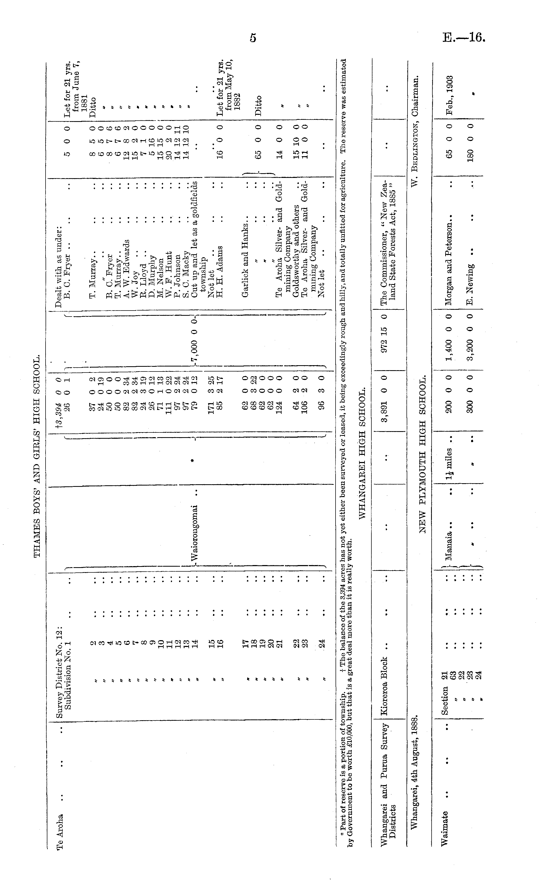 Te Aroha Survey District No. 12 : Subdivision No. 1 ,3,394 0 0 26 0 1 Dealt with as under: B. C. Fryer .. 5 0 0 Let for 21 yrs. from June 7, 1881 Ditto 2 3 4 5 6 7 8 9 10 11 12 13 14 37 0 2 24 0 19 50 0 0 50 0 0 82 2 34 82 2 34 24 3 19 26 0 12 71 1 13 111 0 22 97 2 24 97 2 24 79 0 12 T. Murray.. B. C." Fryer T. Murray.. A. W. Edwards W. Joy R. Lloyd D. Murphy M. Nelson W. F. Hunt P. Johnson S. C. Macky Cut up and let as a goldfields township Not let H. H. Adams 8 5 0 6 5 0 8 7 6 6 7 6 12 8 2 15 2 0 7 10 5 16 0 15 15 0 20 2 0 14 12 11 14 12 10 t ■ Waiorongomai .. 171 3 25 85 2 17 7,000 0 0. » 15 16 ie"o 0 Let for 21 yrs. from May 10, 1882 17 18 19 20 21 62 0 0 68 3 22 62 0 0 62 0 0 124 0 0 Garlick and Hanks.. ) 65 0 0 Ditto 22 23 64 2 0 106 2 0 Te Aroha Silver- and Goldmining Company Goldsworthy and others Te Aroha Silver- and Goldmining Company Not let 14 0 0 15 10 0 11 0 0 24 96 3 0 * Part of reserve is a portion of township. f The balance of the 3,394 acres has not yet either been surveyed or leased, it being exceedingly rough and hilly, and totally unfitted for agriculture. The reserve was estiinatoc by Government to be worth £10,000, but that is a great deal more than it is really worth.