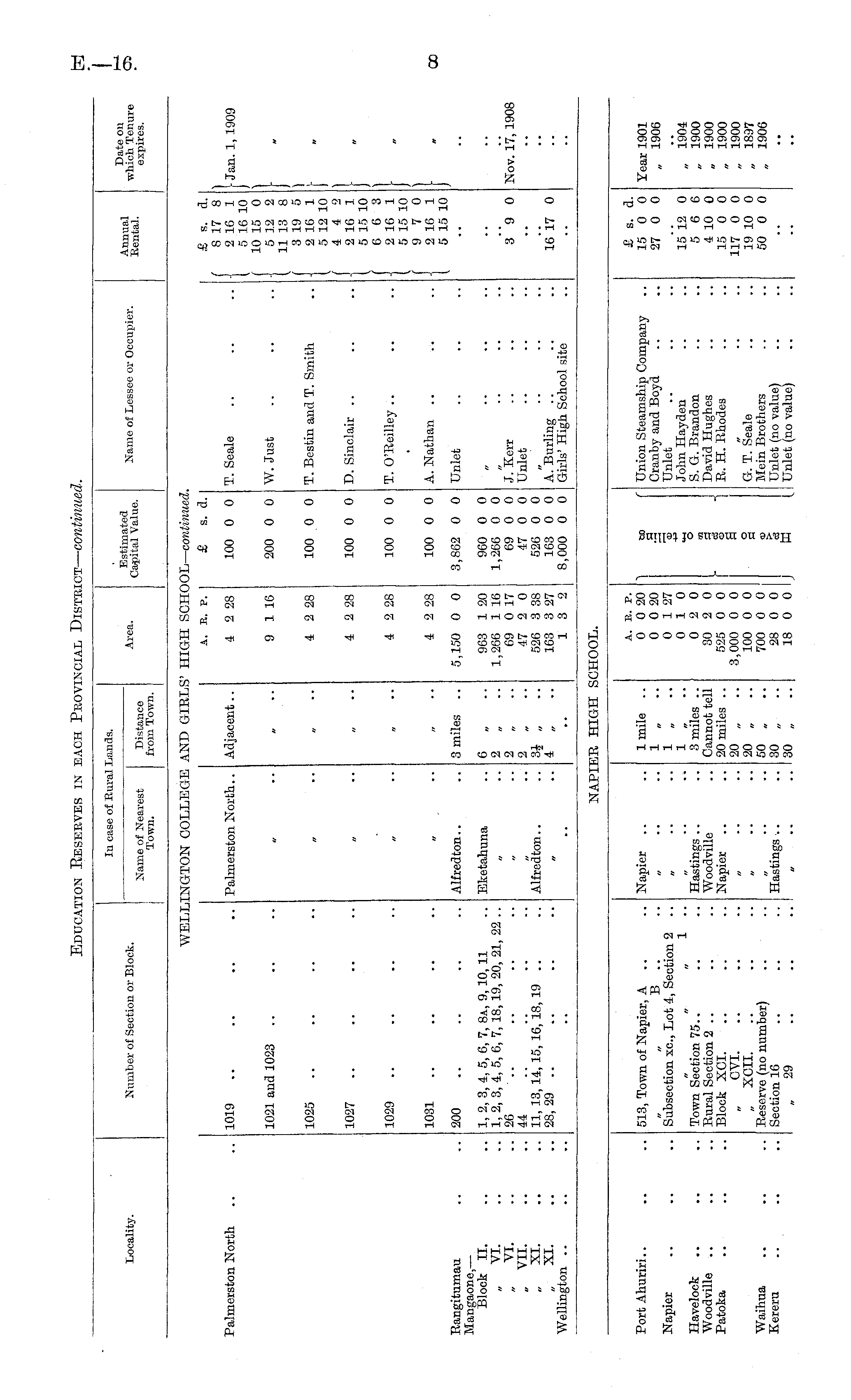 In case of Rural Lands. Locality. Number of Section or Block. Name of Nearest Town. Distance from Town. Area. Estimated Capital Value. Name of Lessee or Occupier. Annual Rental. Date on which Tenure expires. well: NGTON COLLEGE AND GIRL! i' HIGH SCH( >OL — continued. A. B. P. £ s. d. I 1 1 £ s. d. 8 17 8 2 16 1 5 16 10 10 15 0 5 12 2 11 13 8 3 19 5 2 16 1 5 12 10 4 4 2 2 16 1 5 15 10 6 6 3 2 16 1 5 15 10 9 7 0 2 16 1 5 15 10 Palmerston North 1019 Palmerston North.. Adjacent.. 4 2 28 100 0 0 T. Seale I Jan. 1, 1909 1021 and 1023 9 1 16 200 0 0 W. Just 1025 4 2 28 100 0 0 T. Bestin and T. Smith 1027 4 2 28 100 0 0 D. Sinclair .. 1029 4 2 28 100 0 0 T. O'Reilley 1031 4 2 28 100 0 0 A. Nathan Rangitumau Mangaone, — Block II. „ VI. VI. „ VII. „ XI. „ XI. Wellington .. 200 Alfredton.. 3 miles 5,150 0 0 3,802 0 0 Unlet 1, 2, 3, 4, 5, 6, 7, 8a, 9, 10, 11 1, 2, 3, 4, 5, 6, 7, 18, 19, 20, 21, 22 .. 26 44 11,13,14,15,16,18,19 .. 28, 29 .. Eketahuna 6 „ 2 „ 2 „ 2 „ 3J „ .. 4 „ 963 1 20 1,266 1 10 69 0 17 47 2 0 526 3 38 163 3 27 13 2 960 0 0 1,266 0 0 69 0 0 47 0 0 526 0 0 163 0 0 8,000 0 0 J. Kerr " '.'. Unlet 3*'9 0 Nov. 17, 1908 Alfredton A. Burling Girls' High School site 16* 17 0 •• •■