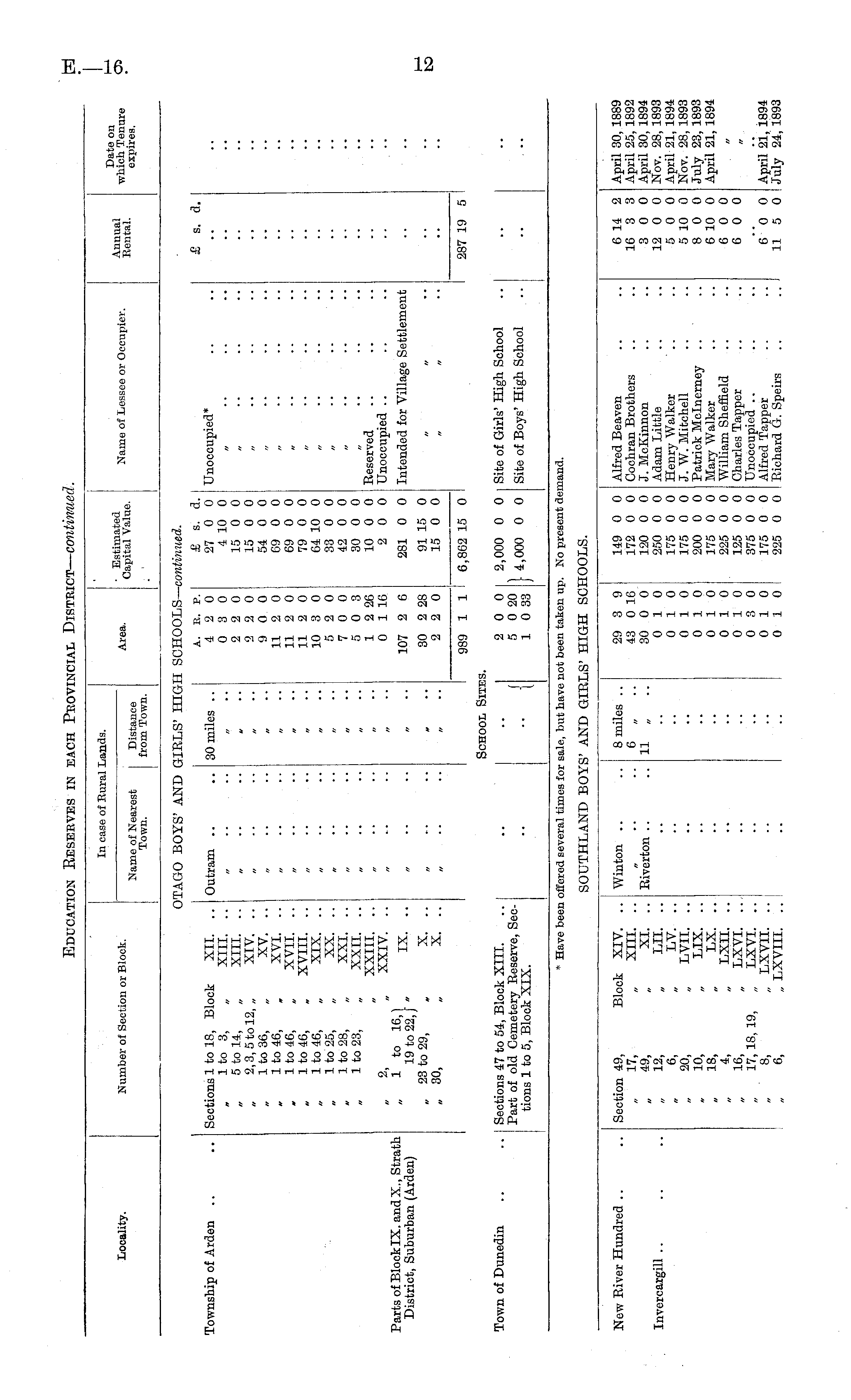 New River Hundred .. Section 49, „ 17, „ 49, „ 12, 6, 20, „ 10, 18, 4, „ 16, 17, 18, 19, 8, 6, Block XIV. XIII. XI. LII. LV. „ LVII. LIX. LX. „ LXII. „ LXVI. „ LXVI. „ LXVII. „ LXVIII. Winton .. 8 miles .. 6 „ 11 „ 29 3 9 43 0 16 30 0 0 0 10 0 10 0 10 0 10 0 10 0 10 0 10 0 3 0 0 10 0 10 149 0 0 172 0 0 120 0 0 250 0 0 175 0 0 175 0 0 200 0 0 175 0 0 225 0 0 125 0 0 375 0 0 175 0 0 225 0 0 Alfred Beaven Cochran Brothers J. McKinnon Adam Little Henry Walker J. W. Mitchell Patrick Mclnerney Mary Walker William Sheffield Charles Tapper Unoccupied .. Alfred Tapper Richard G. Speirs 6 14 2 16 3 3 3 0 0 12 0 0 5 0 0 5 10 0 8 0 0 6 10 0 6 0 0 6 0 0 April 30, 188! April 25, 189! April 30, 189? Nov. 28, 189! April 21, 189? Nov. 28, 189! July 23, 189! April 21, 189' Invercargill .. Riverton .. 6* 0 0 11 5 0 April 21, 189' July 24, 189!