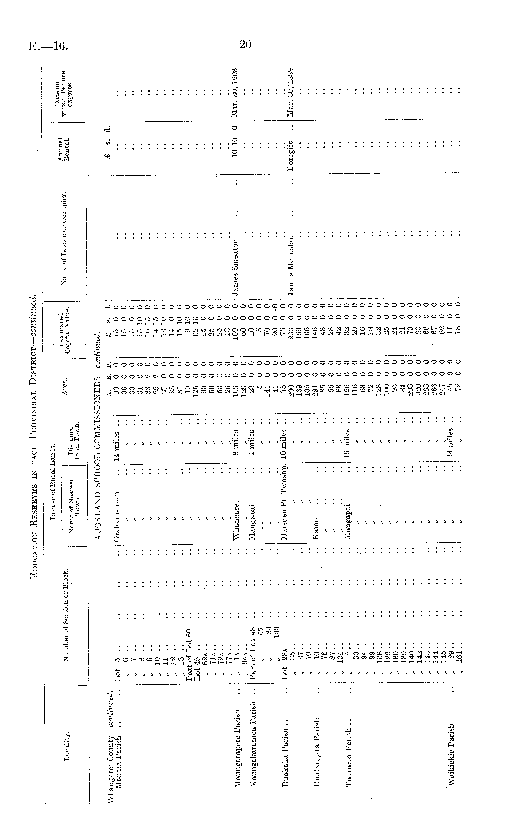 Locality. Number of Section or Block. In case of Rura Name of Nearest Town. In case of Rural Lands. al Lands. Distance from Town. .\rea. Estimated Capital Value. Name of Lessee or Occupier. Annual Rental. Date on which Tenure expires. AUCKLAND SCHOC )L COMMIS SIONERS— com t: tinned. ! I A. R. P. 30 0 0 30 0 0 30 0 0 31 0 0 33 2 0 29 2 0 27 0 0 28 0 0 31 0 0 19 0 0 125 0 0 90 0 0 50 0 0 50 0 0 26 0 0 109 0 0 129 0 0 23 0 0 5 0 0 141 0 0 41 0 0 j 75 0 0 200 0 0 169 0 0 100 0 0 291 0 0 85 0 0 56 0 0 83 0 0 ! 126 0 0 116 0 0 63 0 0 72 0 0 128 0 0 100 0 0 95 0 0 84 0 0 293 0 0 320 0 0 263 0 0 266 0 0 247 0 0 45 0 0 72 0 0 £ s. d. I 15 0 0 I 15 0 0 is o o : 15 10 0 16 15 0 14 15 0 13 10 0 : 14 0 0 15 10 0 9 10 0 62 10 0 45 0 0 ; 25 0 0 25 0 0 13 0 0 ; 109 0 0 60 0 0 10 0 0 5 0 0 70 0 0 20 0 0 75 0 0 200 0 0 169 0 0 106 0 0 146 0 0 43 0 0 28 0 0 42 0 0 32 0 0 j 29 0 0 i 16 0 0 ! 18 0 0 32 0 0 25 0 0 24 0 0 21 0 0 73 0 0 80 0 0 66 0 0 67 0 0 62 0 0 11 0 0 18 0 0 £ s. d. i'hangarei County — continued. Manaia Parish Lot 5 .. „ 6 .. „ 7 .. „ 8 .. „ 9 .. „ 10 .. „ 11 .. „ 12 .. „ 13 .. Part of Lot 60 Lot 45 .. „ 62a .. „ 71a .. „ 72a .. „ 77a.. „ 1a .. 94a Part of Lot 48 57 83 130 Lot 28a „ 35 .. „ 37 .. „ 70 .. „ 10 .. „ 76 .. „ 87 .. „ 104 .. 2 .. „ 30 .. „ 94 .. „ 99 .. „ 108 .. „ 129 .. „ 130 .. „ 139 .. „ 140 .. „ 142 .. „ 143 .. „ 144.. „ 145.. „ 29 .. „ 161 .. .. j Grahams town .. | Whangarei .. j Mangapai .. I Marsden Pt. Twnshp. .. ]Kamo .. I Mangapai 14 miles .. „ 8 miles .. James Smeaton io io o Mar. 30, 1903 Maungatapere Parish Maungakaramea Parish .. 4 miles .. Ruakaka Parish .. 10 miles .. Foregift Mar. 30,188c James McLellan Ruatangata Parish Tauraroa Parish 16 miles .. | I I ,, \ " Waikiekie Parish I ,, •• 14 miles .. I i