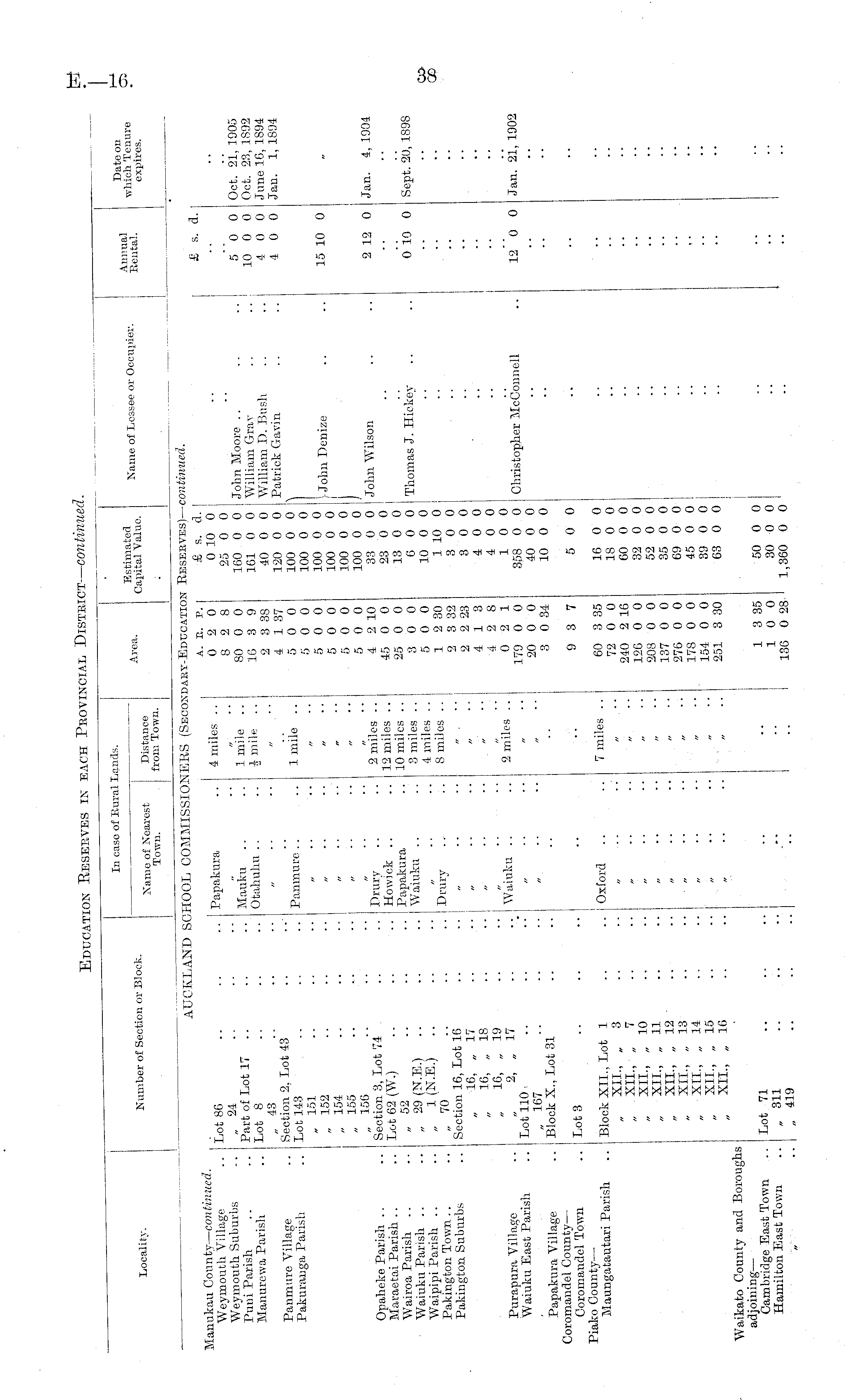 ■ Locality. Number of Section or Block. In case of Rural Lands. Name of Nearest Distance Town. from Town. Area. Estimated Capital Value. Name of Lessee or Occupier. Annual Rental. Date on which Tenure expires. Manukau County — continued. Weymouth Village Weymouth Suburbs Puni Parish Manurewa Parish Panmure Village Pakuranga Parish Opaheke Parish Maraetai Parish Wairoa Parish Waiuku Parish Waipipi Parish Pakington Town Pakington Suburbs Lot 86 „ 24 Part of Lot 17 .. Lot 8 „ 43 Section 2. Lot 43 Lot 143 „ 151 „ 152 „ 154 „ 155 „ 150 Section 3, Lot 74 Lot 62 (W.) „ 52 „ 29 (N.E.) .. „ 1 (N.E.I .. „ 70 ' Section 16, Lot 16 16, „ 17 16, „ 18 „ 10, „ 19 2, „ 17 Lot 110. „ 167 Block X., Lot 31 AUCKLAND SCHOOL COMMISSION .. Papakura .. Mauku .. Otahuhu .. .. Panmure . . .. Drury .. Howick Papakura .! .. Waiuku .. .. Drury .. Waiuku ERS (Secondary-Educatio: a. r.. p. 4 miles .. 0 2 0 8 2 8 1 mile .. 80 0 0 J mile .. 16 3 9 2 3 38 4 1 37 1 mile .. 5 0 0 5 0 0 5 0 0 5 0 0 5 0 0 5 0 0 2 miles .. 4 2 10 12 miles .. 45 0 0 10 miles .. 25 0 0 3 miles .. 3 0 0 4 miles . . 5 0 0 8 miles .. 1 2 30 2 3 32 „ ' .. 2 2 23 4 13 4 2 8 2 miles .. 0 2 1 179 0 0 20 0 0 3 0 34 in Reserves) — continued. £ s. d. 0 10 0 25 0 0 160 0 0 John Moore 161 0 0 William Gray 40 0 0 William D. Bush 120 0 0 Patrick Gavin 100 0 0 \ 100 0 0 j loo 0 0 K°hn Denize 100 0 0 i 100 0 0 1 33 0 0 John Wilson 23 0 0 13 0 0 6 0 0 Thomas J. Hickey 10 0 0 1 10 0 3 0 0 3 0 0 4 0 0 4 0 0 10 0 358 0 0 Christopher McConncll 40 0 0 10 0 0 £ s. d. 5 0 0 10 0 0 4 0 0 4 0 0 15 10 0 2 12 0 Oct. 21, 3 905 Oct. 23, 1S92 June 16, 1894 Jan. 1, 1894 Jan. 4, 1901 0 10 0 Sept. 20, 1898 Purapura Village Waiuku East Parish 12 0 0 Jan. 21, 1902 Papakura Village Coromandel County — Coromandel Town Piako County — Maungatautari Parish I Lot 3 Block XII., Lot 1 ,. XII., „ 3 „ XII., „ 7 „ XII., „ 10 „ XII., „ 11 „ XII., „ 12 „ XII., „ 13 „ XII., „ 14 „ XII., „ 15 „ XII., „ 16 .. j Oxford 9 3 7 7 miles .. 60 3 35 72 0 0 240 2 16 126 0 0 203 0 0 137 0 0 276 0 0 178 0 0 154 0 0 ■ ■ „ .. 251 3 30 5 0 0 16 0 0 j 18 0 0 60 0 0 82 0 0 52 0 0 35 0 0 69 0 0 1 45 0 0 ! 39 0 0 j 63 0 0 I Waikato County and Boroughs adjoining — Cambridge East Town Hamilton East Town Lot 71 „ 311 ,; 419 ..'I 13 35 10 0 I 130 0 28 50 0 0 30 0 0 ,i 1,360 0 0' "' I
