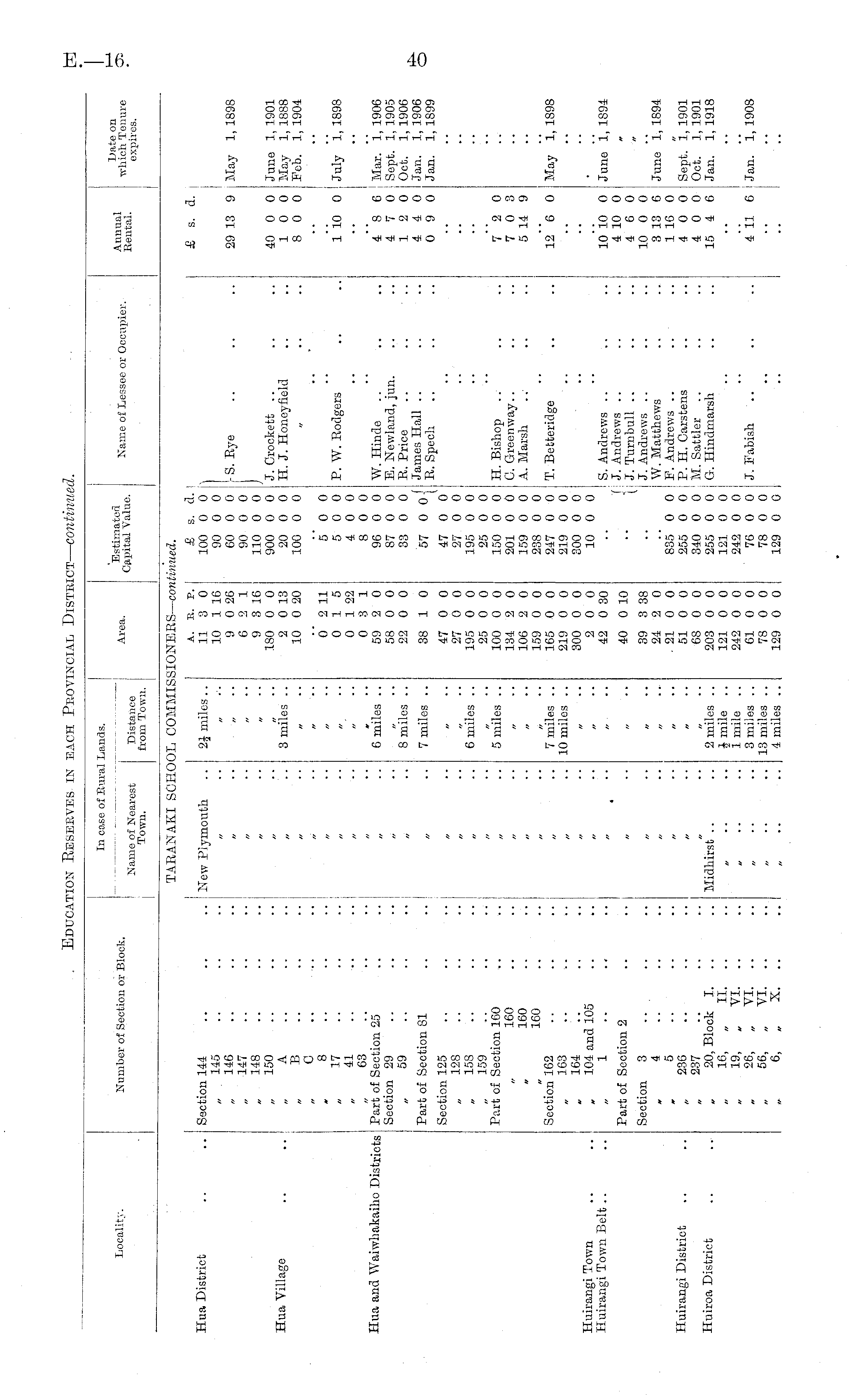 Locality. Number of Section or Block. In case of Rural Lands. Name of Nearest Distance Town. from Town. Area. Estimated Capital Value. Name of Lessee or Occupier. Annual Rental. Date on which Tenure expires. TARANAKI SCHOOL COMMIS SIONERS — continued. I 1 A. E. p. £ s. d. I 11 3 0 100 0 0 \ 10 1 16 90 0 0 I 9 0 26 60 0 0 \ S. Rye 6 2 1 90 0 0 I 9 3 16 110 0 0 J 180 0 0 900 0 0 J. Crockett .. 2 0 13 20 0 0 H. J. Honeyfield 10 0 20 100 0 0 Hua District Section 144 145 146 „ 147 148 150 A B C 8 17 41 63 Part of Section 25 Section 29 59 .. New Plymouth .. 2J miles .. „ .. 3 miles .. „ .. 6 miles .. „ .. 8 miles .. £ s. d. 29 13 9 May 1, 1896 Hua Village 40 0 0 10 0 8 0 0 June 1, 1903 May 1, 1886 Feb. 1, 1904 Hua and Waiwhakaiho Districts Huirangi Town Huirangi Town Belt Part of Section 81 Section 125 128 158 159 Part of Section 160 160 160 160 Section 162 163 164 104 and 105 1 „ .. 7 miles .. „ .. 6 miles .. „ .. 5 miles .. „ 7 miles .. .. 10 miles .. 0 2 11 5 0 0 0 15 5 0 0 P. W. Rodgers 0 1 22 4 0 0 0 3 1 8 0 0 59 2 0 96 0 0 W. Hinde .. 58 0 0 87 0 0 I E. Newland, jun. 22 0 0 33 0 0 R. Price 0Q , „ K _ „ „ f James Hal! .. 3(5 1 ° 5/ ° °( R.Spech .. 47 0 0 47 0 0 27 0 0 27 0 0 195 0 0 195 0 0 25 0 0 25 0 0 100 0 0 150 0 0 H. Bishop .. 134 2 0 201 0 0 G. Greenway.. 106 2 0 159 0 0 A. Marsh 159 0 0 238 0 0 165 0 0 247 0 0 T. Betteridge 219 0 0 219 0 0 300 0 0 300 0 0 2 0 0 10 0 0 42 0 30 .. S. Andrews .. ,„„-,„ I J. -Andrews .. 40 0 10 . . 1 'T m in ( J. Turnbull .. 39 3 38 .. i J. Andrews .. 24 2 0 .. I W. Matthews 21 0 0 835 0 0 ; F. Andrews .. 51 0 0 255 0 0 , P. H. Carstens 68 0 0 340 0 0 M. Sattler .. 203 0 0 255 0 0 i G. Hindmarsh 121 0 0 121 0 o ; 242 0 0 242 0 0 I 61 0 0 76 0 0 J, Fabish 78 0 0 78 0 0 I 129 0 0 129 0 0 I 1 10 0 4 8 0 4 7 0 12 0 4 4 0 0 9 0 7 2 0 7 0 3 5 14 9 12"6 0 July 1, 1896 Mar. 1, 190c Sept. 1, 190? Oct. 1, 1906 Jan. 1, 190t" Jan. 1, 1S9£ May 1, 1896 Huirangi District Part of Section 2 Section 3 4 5 236 237 20, Block I. 16, „ II. 19, „ VI. 26, „ VI. 56, „ VI. 6, „ X. . .. Midhirst .. .. 2 miles .. „ .. • ■ i mile .. „ .. .. 1 mile „ .. .. 3 miles .. „ .. .. 13 miles .. .. 4 miles .. 10 10 0 4 10 0 4 6 0 10 0 0 3 13 6 1 16 0 4 0 0 4 0 0 15 4 6 June 1, 1893 June 1, 1893 Sept. 1, 1901 Oct. 1, 1901 Jan. 1, 1916 Huiroa District 4 11 6 Jan. 1, 1906