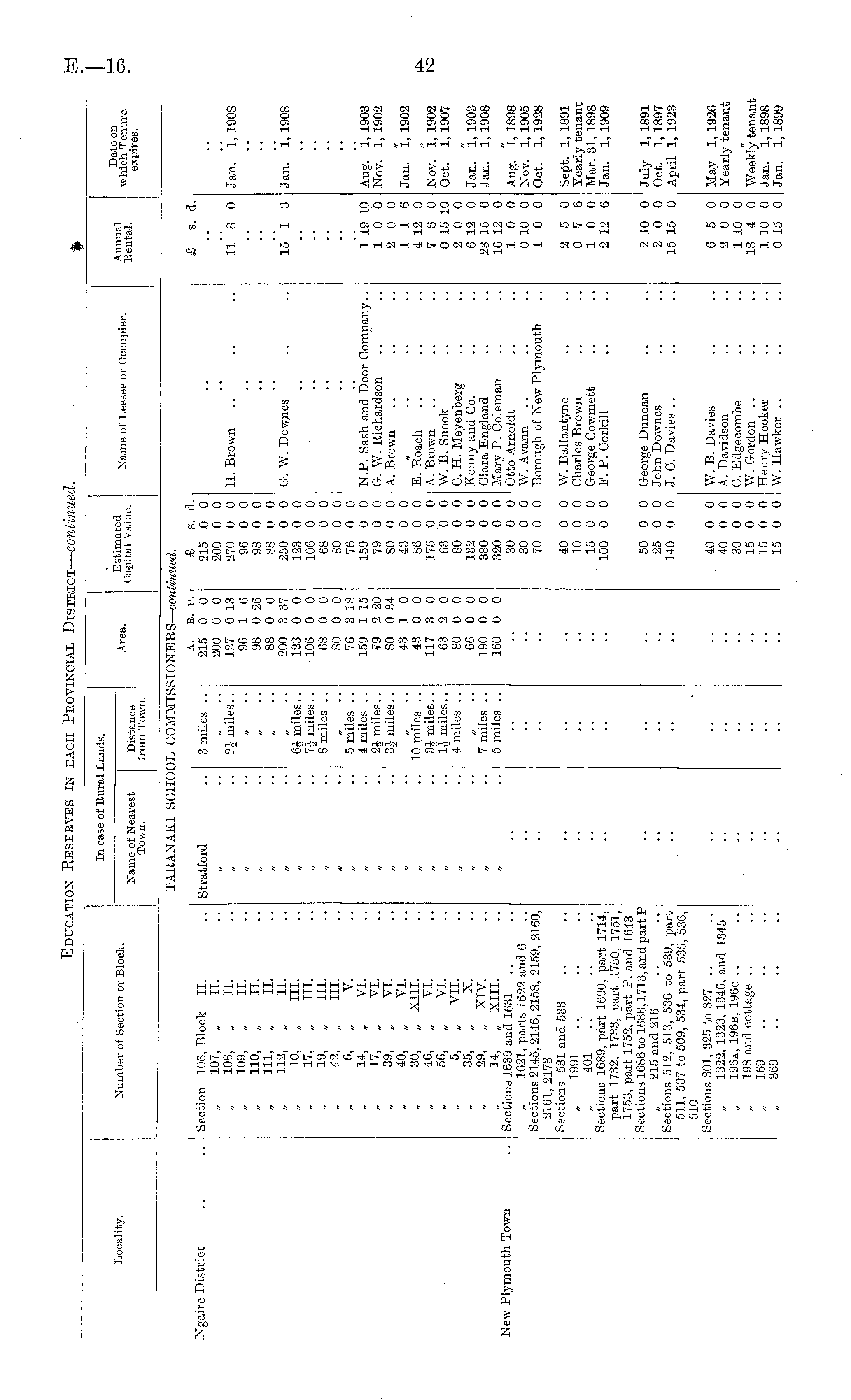 Locality. Number of Section or Block. In case of Rura Name of Nearest Town. In case of Rural Lands. al Lands. Distance from Town. Area. Estimated Capital Value. Name of Lessee or Occupier. Annual Rental. Date on which Tenure expires. TARANAKI SCHOi iL COMMISSIONERS— continued. gaire District Section 106, Block II. 107, „ II. 103, . II. 109, „ II. 110, „ II. 111, „ II. 112, „ II. 10, „ III. 17, „ III. 19, „ III. 42, „ III. 6, V. 14, „ VI. 17, „ VI. 39, „ VI. 40, „ VI. 30, „ XIII. 46, „ VI. 56, „ VI. 5, „ VII. 35, X. 29, „ XIV. 14, „ XIII. Sections 1639 and 1631 1621, parts 1622 and 6 Sections 2145, 2146, 2158, 2159, 2160, 2161, 2173 Sections 531 and 533 1991 401 Sections 1689, part 1690, part 1714, part 1732, 1733, part 1750, 1751, 1753, part 1752, part P, and 1643 Sections 1686 to 1688, 1713, and part P 215 and 216 Sections 512, 513, 536 to 539, part 511, 507 to 509, 534, part 535, 536, 510 Sections 301, 325 to 327 .. 1322, 1323, 1346, and 1345 196a, 196b, 196c „ 19S and cottage ,,169 „ -369 Stratford a. r. p. £ s. d. 3 miles .. 215 0 0 215 0 0 200 0 0 200 0 0 2J miles.. 127 0 13 270 0 0 96 1 6 96 0 0 98 0 26 98 0 0 88 0 0 88 0 0 200 3 37 250 0 0 6J miles.. 123 0 0 123 0 0 7* miles.. 106 0 0 106 0 0 8 miles .. 68 0 0 68 0 0 80 0 0 SO 0 0 5 miles .. 76 3 18 76 0 0 4 miles .. 159 1 15 159 0 0 2J miles.. 79 2 20 79 0 0 3J miles.. 80 0 34 80 0 0 43 1 0 43 0 0 10 miles .. 43 0 0 86 0 0 3J miles.. 117 3 0 175 0 0 1J miles.. 63 2 0 63 0 0 4 miles .. 80 0 0 80 0 0 66 0 0 132 0 0 7 miles .. 190 0 0 380 0 0 5 miles .. 160 0 0 320 0 0 30 0 0 30 0 0 70 0 0 H. Brown I G. W. Downes N.P. Sash and Door Company.. G. W. Richardson A. Brown E. Roach A. Brown W. B. Snook C. H. Meyenberg Kenny and Co. Clara England Mary P. Coleman Otto Arnoldt W. Avann Borough of New Plymouth £ s. d. ll"s 0 15"l 3 1 19 10 10 0 2 0 0 116 4 12 0 7 8 0 0 15 10 2 0 0 6 12 0 23 15 0 16 12 0 10 0 0 10 0 10 0 Jan. 1, 190S Jan. i, 1908 -Aug. 1, 1903 Nov. 1, 1902 Jan. 1, 1902 Nov. 1, 1902 Oct. 1, 1907 Jan. 1, 1903 Jan. 1, 1908 New Plymouth Town Aug. 1, 1898 Nov. 1, 1905 Oct. 1, 1928 40 0 0 10 0 0 15 0 0 100 0 0 W. Ballantyne .. Charles Brown George Cowmett F. P. Corkill 2 5 0 0 7 6 10 0 2 12 6 Sept. 1, 1891 Yearly tenant Mar. 31, 1898 Jan. 1, 1909 50 0 0 25 0 0 140 0 0 George Duncan John Downes J. C. Davies 2 10 0 2 0 0 15 15 0 July 1, 1891 Oct. 1, 1897 April 1, 1923 40 0 0 40 0 0 ,30 0 0 15 0 0 15 0 0 15 0 0 W. B. Davies A. Davidson C. Edgecombe W. Gordon Henry Hooker W. Hawker 6 5 0 2 0 0 1 10 0 18 4 0 1 10 0 0 15 0 May 1, 1926 Yearly tenant Weekly tenant Jan. 1, 1898 Jan. 1, 1899