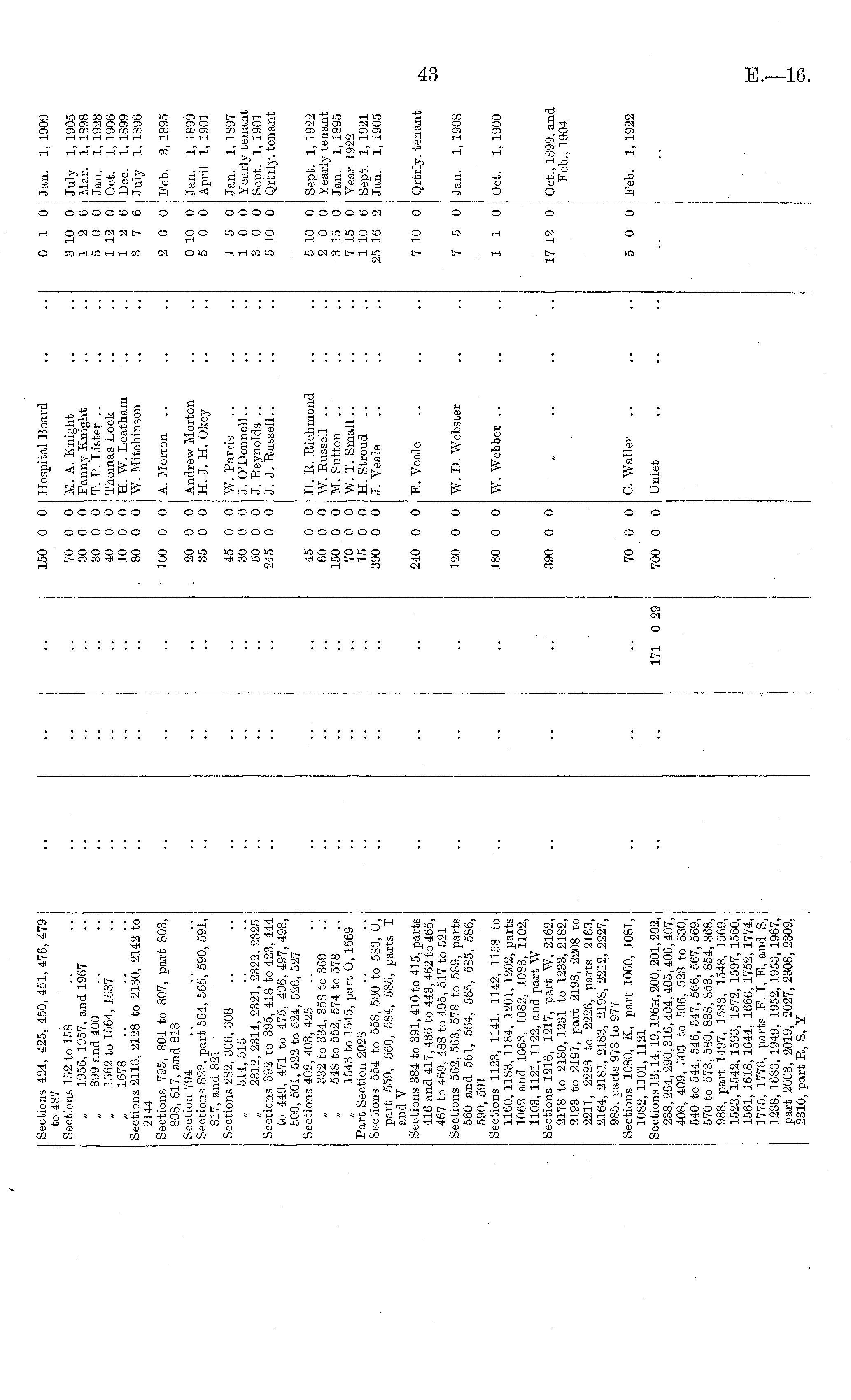 Sections 424, 425, 450, 451, 476, 479 to 487 Sections 152 to 158 1956, 1957, and 1967 399 and 400 1562 to 1564, 1587 1678 .. Sections 2116, 2128 to 2130, 2142 to 2144 Sections 795, 804 to 807, part 803, 808, 817, and 818 Section 794 Sections 822, part 564, 565, 590, 591, 817, and 821 Sections 282, 306, 308 514, 515 2312, 2314, 2321, 2322, 2325 Sections 392 to 395, 418 to 423, 444 to 449, 471 to 475, 496, 497, 498, 500, 501, 522 to 524, 526, 527 Sections 402, 403, 425 332 to 334, 358 to 360 548 to 552, 574 to 578 1543 to 1545, part 0, 1569 Part Section 2028 Sections 554 to 558, 580 to 583, U, part 559, 560, 584, 585, parts T and V Sections 384 to 391, 410 to 415, parts 416 and 417, 436 to 443, 462 to 465, 467 to 469, 488 to 495, 517 to 521 Sections 562, 563, 578 to 589, parts 560 and 561, 564, 565, 585, 586, 590, 591 Sections 1123, 1141, 1142, 1158 to 1150, 1183, 1184, 1201, 1202, parts 1062 and 1063, 1082, 1083, 1102, 1103, 1121, 1122, and part W Sections 1216, 1217, part W, 2162, 2178 to 2180, 1231 to 1233, 2182, 2193 to 2197, part 2198, 2208 to 2211, 2223 to 2226, parts 2163, 2164, 2181, 2183, 2198, 2212, 2227, 985, parts 973 to 977 Sections 1080, K, part 1060, 1081, 1082, 1101, 1121 Sections 13,14, 19, 196h, 200, 201, 202, 238, 264, 290,316, 404, 405,406, 407, 408, 409, 503 to 506, 528 to 530, 540 to 544, 546, 547, 566, 567, 569, 570 to 578, 580, 838, 853, 854, 868, 988, part 1497, 1583, 1548, 1569, 1523, 1542, 1593, 1572, 1597, 1560, 1561, 1618, 1644, 1666, 1752, 1774, 1775, 1776, parts F, I, E, and S, 1288, 1683, 1949, 1952, 1953, 1967, part 2003, 2019, 2027, 2308, 2309, 2310, part R, S, Y Hospital Board 0 10 Jan. 1, 1909 70 0 0 30 0 0 30 0 0 40 0 0 10 0 0 . 80 0 0 M. A. Knight Fanny Knight T. P. Lister .. Thomas Look H. W. Leatham W. Mitchinson 3 10 0 12 6 5 0 0 1 12 0 12 6 3 7 6 July 1, 1905 Mar. 1, 1898 Jan. 1, 1923 Oct. 1, 1906 Dec. 1, 1899 July 1, 1896 - 100 0 0 A. Morton 2 0 0 Feb. 3, 1895 . 20 0 0 35 0 0 Andrew Morton H. J. H. Okey 0 10 0 5 0 0 Jan. 1, 1899 April 1, 1901 45 0 0 30 0 0 50 0 0 245 0 0 W. Parris J. O'Donnell.. J. Reynolds .. J. J. Russell.. 15 0 10 0 3 0 0 5 10 0 Jan. 1, 1897 Yearly tenant Sept. 1, 1901 Qrtrly. tenant 45 0 0 60 0 0 150 0 0 70 0 0 15 0 0 390 0 0 H. R. Richmond W. Russell .. M. Sutton .. W. T. Small.. H. Stroud .. J. Veale 5 10 0 2 0 0 3 15 0 7 15 0 1 10 6 25 16 2 Sept. 1, 1922 Yearly tenant Jan. 1, 1895 Year 1922 Sept. 1, 1921 Jan. 1, 1905 240 0 0 E. Veale 7 10 0 Qrtrly. tenant 120 0 0 W. D.Webster 7 5 0 Jan. 1, 1908 180 0 0 W. W 7ebber .. 110 Oct. 1, 1900 390 0 0 17 12 0 Oct., 1899, and Feb., 1904 70 0 0 C. Waller .. 5 0 0 Feb. 1, 1922 171 0 29 700 0 0 Unlet