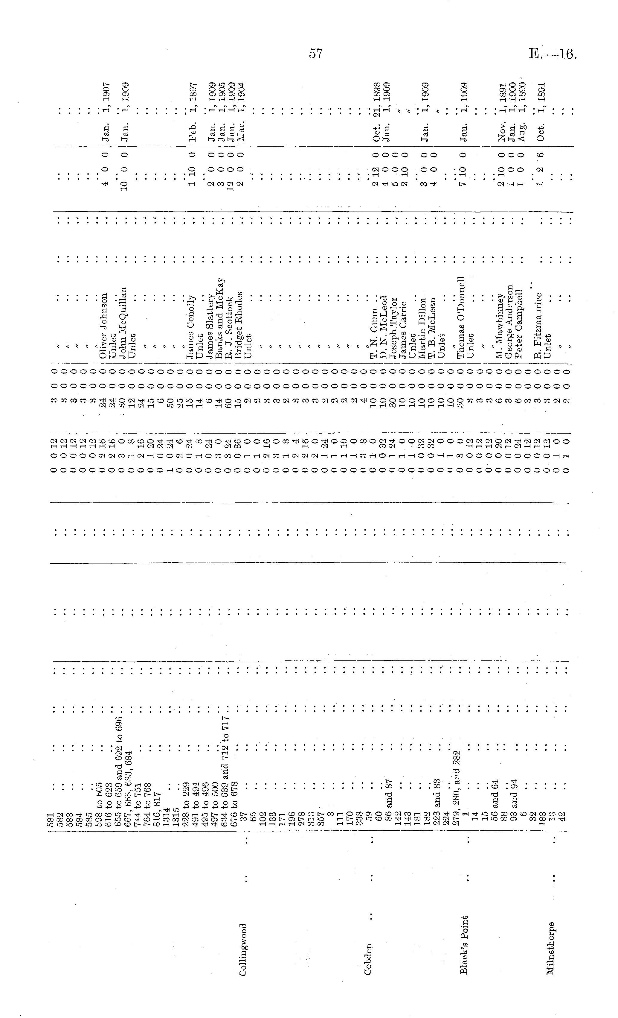 Collingwood Cobden 581 582 583 584 585 598 to 605 616 to 623 655 to 659 and 692 to 696 .. 667, 668, 683, 684 744 to 751 764 to 768 816, 817 1314 1315 228 to 229 491 to 494 495 to 496 497 to 500 634 to 639 and 712 to 717 .. 676 to 678 37 65 102 133 173 196 278 313 357 3 111 170 338 59 60 86 and 87 142 143 181 182 223 and 83 224 279, 280, and 282 1 14 15 56 and 64 88 93 and 94 6 32 183 13 42 0 0 12 0 0 12 0 0 12 0 0 12 0 0 12 0 2 10 0 2 16 0 3 0 0 18 0 2 16 0 1 20 0 0 24 1 0 24 0 2 6 0 0 24 0 18 0 0 24 0 3 0 0 3 24 0 0 36 0 10 0 10 0 2 16 0 3 0 0 18 0 2 4 0 2 16 0 2 0 0 1 24 0 10 0 1 10 0 10 0 3 8 0 10 0 0 32 0 1 24 0 10 0 10 0 0 32 0 0 32 0 10 0 10 0 3 0 0 0 12 0 0 12 0 0 12 0 0 20 0 0 12 0 0 24 0 0 12 0 0 12 0 0 12 0 10 0 10 3 0 0 3 0 0 3 0 0 • 3 0 0 3 0 0 24 0 0 Oliver Johnson 24 0 0 Unlet • 30 0 0 John McQuillan 12 0 0 Unlet 24 0 0 15 0 0 6 0 0 50 0 0 25 0 0 15 0 0 James Conolly 14 0 0 Unlet 6 0 0 James Slattery 14 0 0 Banks and McKay 60 0 0 R. J. Scottook 15 0 0 Bridget Rhodes 2 0 0 Unlet 2 0 0 3 0 0 3 0 0 2 0 0 3 0 0 3 0 0 3 0 0 2 0 0,, 2 0 0 2 0 0 2 0 0 4 0 0 10 0 0 T. N. Gunn .. 10 0 0 D. N. McLeod 30 0 0 Joseph Taylor 10 0 0 James Carrie 10 0 0 Unlet 10 0 0 Martin Dillon 10 0 0 T. B. McLean 10 0 0 Unlet 10 0 0 30 0 0 Thomas O'Donnell 3 0 0 Unlet 3 0 0 3 0 0 6 0 0 M. Mawhinney 3 0 0 George Anderson 6 0 0 Peter Campbell 3 0 0 3 0 0 R. Fitzmaurice 3 0 0 Unlet 2 0 0 2 0 0 4 0 0 io"o 0 l'io 0 2 0 0 3 0 0 12 0 0 2 0 0 Jan. 1, 1907 Jan. 1, 1909 Feb. 1, 1897 Jan. 1, 1909 Jan. 1, 1905 Jan. 1, 1909 Mar. 1, 1904 2 12 0 4 0 0 5 0 0 2 10 0 Oct. 21, 1898 Jan. 1, 1909 Black's Point 3°-0 0 4 0 0 Jan. 1, 1909 7 10 0 Jan. 1, 1909 Milnethorpe 2 10 0 10 0 10 0 Nov. 1, 1891 Jan. 1, 1900 Aug. 1, 1890 1 "2 6 Oct. 1, 1891