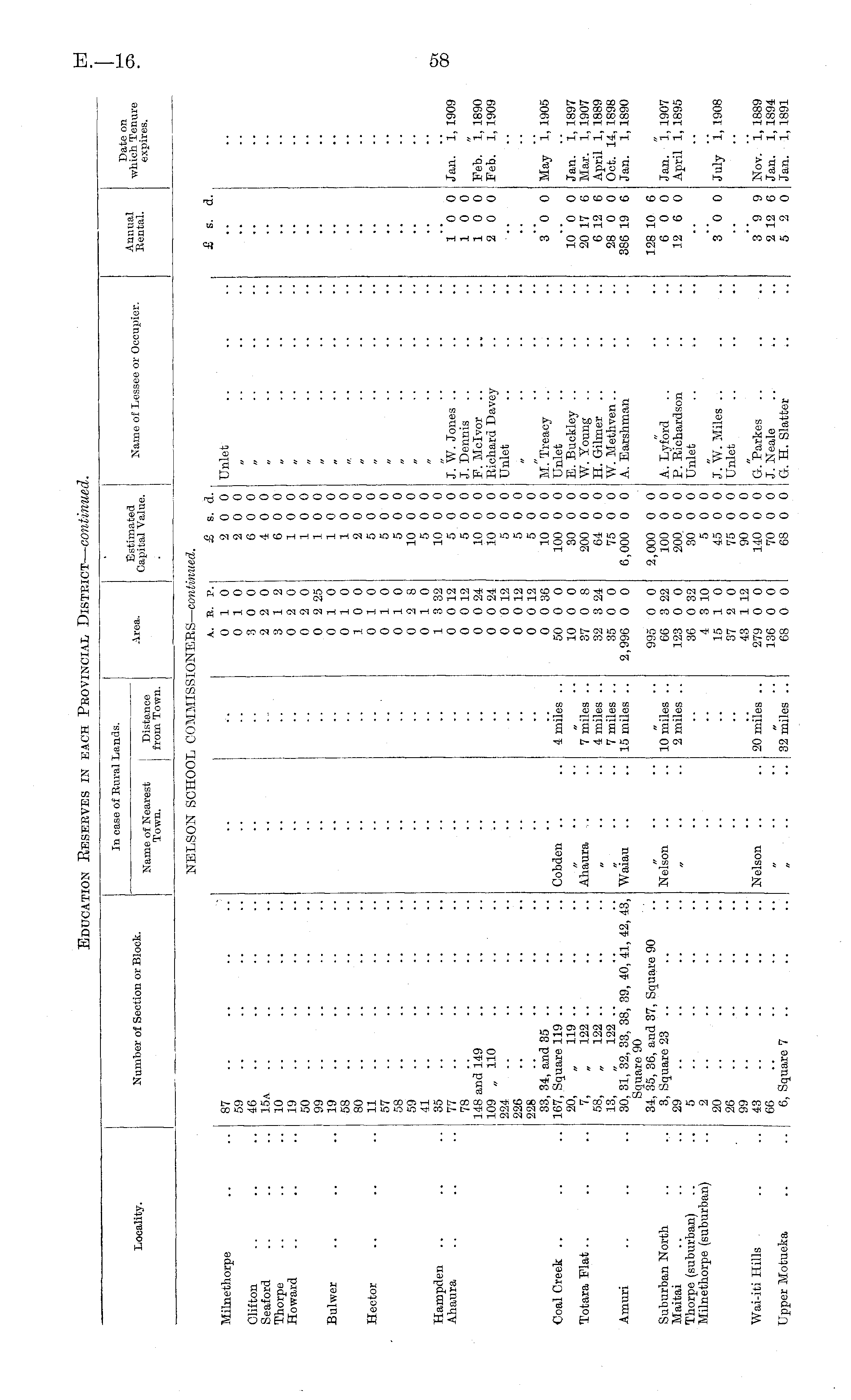 Locality. Number of Section or Block. In case of Hura Name oi: Nearest Town. In case of Hural Lands. al Lands. Distance from Town. Area. Estimated Capital Value. Name of Lessee or Occupier. Annual Rental. Date on which Tenure expires. NELSON SCHOO: i commiss: ONERS— conk Inued. Milnethorpe Clifton Seaford Thorpe Howard Bulwer Hector Hampden Ahaura 87 59 46 15a 10 19 50 99 19 58 80 11 57 58 59 41 35 77 78 3 48 and 149 109 „ 110 224 226 228 33, 34, and 35 .. 167, Square 119 .. 20, „ 119 .. 7, „ 122 .. 58, „ 122 .. 13 122 30' 31, 32, 33, 38, 39, 40, 41, 42, 43, Square 90 34, 35, 36, and 37, Square 90 3, Square 23 .. 29 5 2 26 99 43 66 6, Square 7 •■ A. B. P. 0 10 0 10 3 0 0 2 2 0 3 12 0 2 0 0 2 0 0 2 25 0 10 0 10 10 0 0 10 0 10 0 10 0 2 8 0 10 1 3 32 0 0 12 0 0 12 0 0 24 0 0 24 0 0 12 0 0 12 0 0 12 0 0 36 50 0 0 10 0 0 37 0 8 32 3 24 35 0 0 2,996 0 0 £ s. d. 2 0 0 2 0 0 6 0 0 4 0 0 6 0 0 10 0 10 0 10 0 10 0 10 0 2 0 0 5 0 0 5 0 0 5 0 0 10 0 0 5 0 0 10 0 0 5 0 0 5 0 0 10 0 0 10 0 0 5 0 0 5 0 0 5 0 0 10 0 0 100 0 0 30 0 0 200 0 0 64 0 0 75 0 0 6,000 0 0 Unlet £ s. d. J. W. Jones .. J. Dennis F. Mclvor .. Richard Davey Unlet 10 0 10 0 10 0 2 0 0 Jan. 1, 1909 Feb. 1, 1890 Feb. 1, 1909 Coal Creek M. Treacy Unlet E. Buckley .. W. Young H. Gilmer .. W. Methven .. A. Earshman 3"o 0 May 1, 1905 Cobden 4 miles .. Totara Flat Ahaura 7 miles .. 4 miles .. 7 miles .. 15 miles .. 10 0 0 20 17 6 6 12 6 28 0 0 386 19 6 Jan. 1, 1897 Mar. 1, 1907 April 1, 1889 Oct. 14, 1898 Jan. 1, 1890 Amuri Waiau Suburban North Maitai Thorpe (suburban) Milnethorpe (suburban) Nelson 10 miles .. 2 miles .. 995 0 0 66 3 22 123 0 0 36 0 32 4 3 10 15 1 0 37 2 0 43 1 12 279 0 0 136 0 0 68 0 0 2,000 0 0 100 0 0 200 0 0 30 0 0 5 0 0 45 0 0 75 0 0 90 0 0 140 0 0 70 0 0 68 0 0 A. Lyford P. Richardson Unlet 128 10 6 6 0 0 12 6 0 Jan. 1, 1907 April 1, 1895 J. W. Miles .. Unlet 3 "o 0 July 1, 1908 Wai-iti Hills Nelson 20 miles .. G. Parkes J. Neale G. H. Slatter 3 9 9 2 12 6 5 2 0 Nov. 1, 1889 Jan. 1, 1894 Jan. 1, 1891 Upper Motueka 32 miles ..