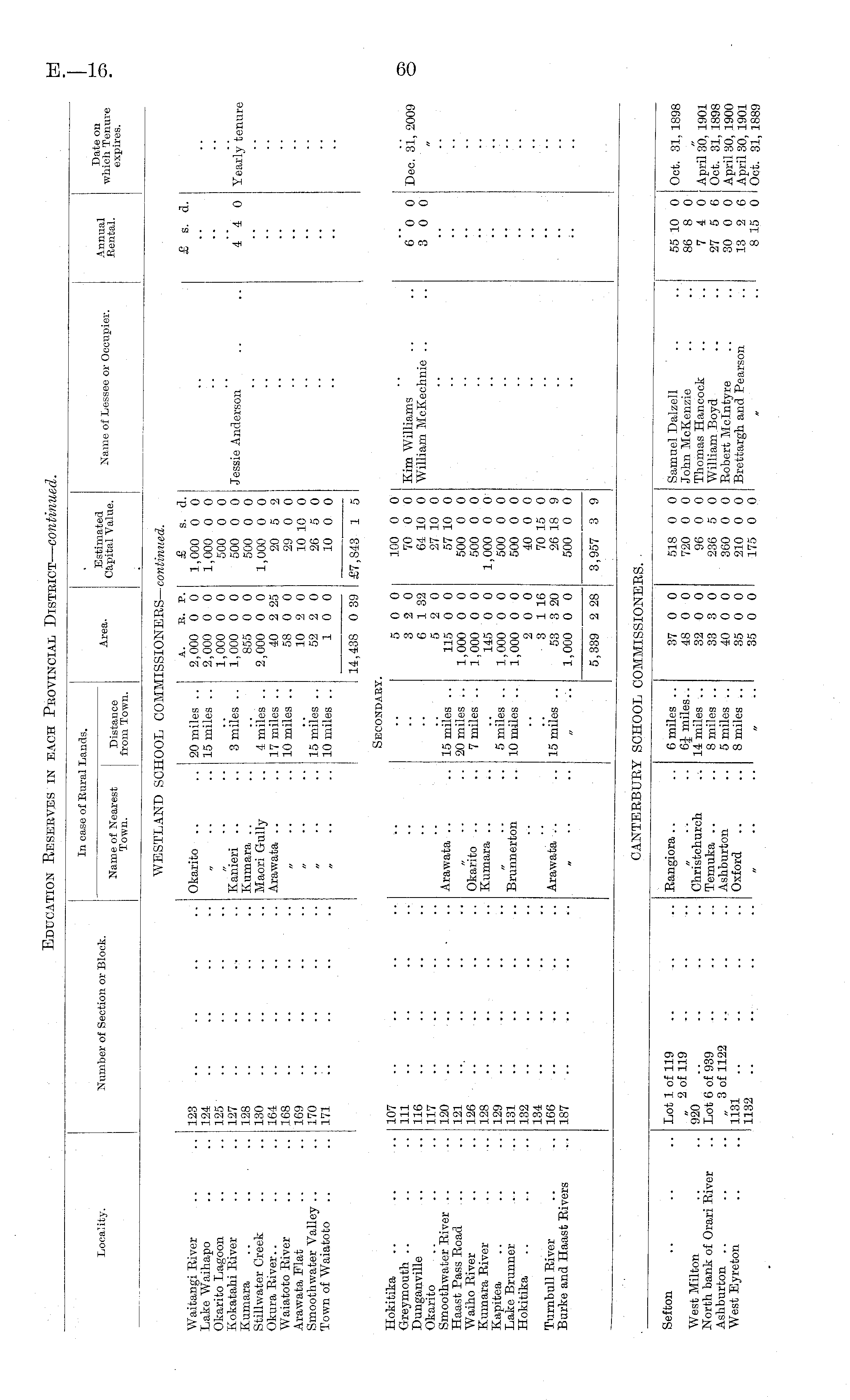Sefton West Milton North bank of Orari River Ashburton West Eyreton Lot 1 of 119 „ 2 of 119 920 Lot 6 of 939 „ 3 of 1122 1131 1132 Rangiora .. Christchurch Temuka .. Ashburton Oxford 6 miles .. 64/ miles.. 14 miles .. 8 miles .. 5 miles .. 8 miles .. 37 0 0 48 0 0 32 0 0 33 3 0 40 0 0 35 0 0 35 0 0 518 0 0 720 0 0 96 0 0 236 5 0 360 0 0 210 0 0 175 0 0 Samuel Dalzell John McKenzie Thomas Hancock William Boyd Robert Mclntyre Brettargh and Pearson 55 10 0 Oct. 31, 1898 86 8 0 7 4 0 April 30, 1901 27 5 6 Oct. 31, 1898 30 0 0 April 30, 1900 13 2 6 April 30, 1901 3 15 0 Oct. 31, 1889