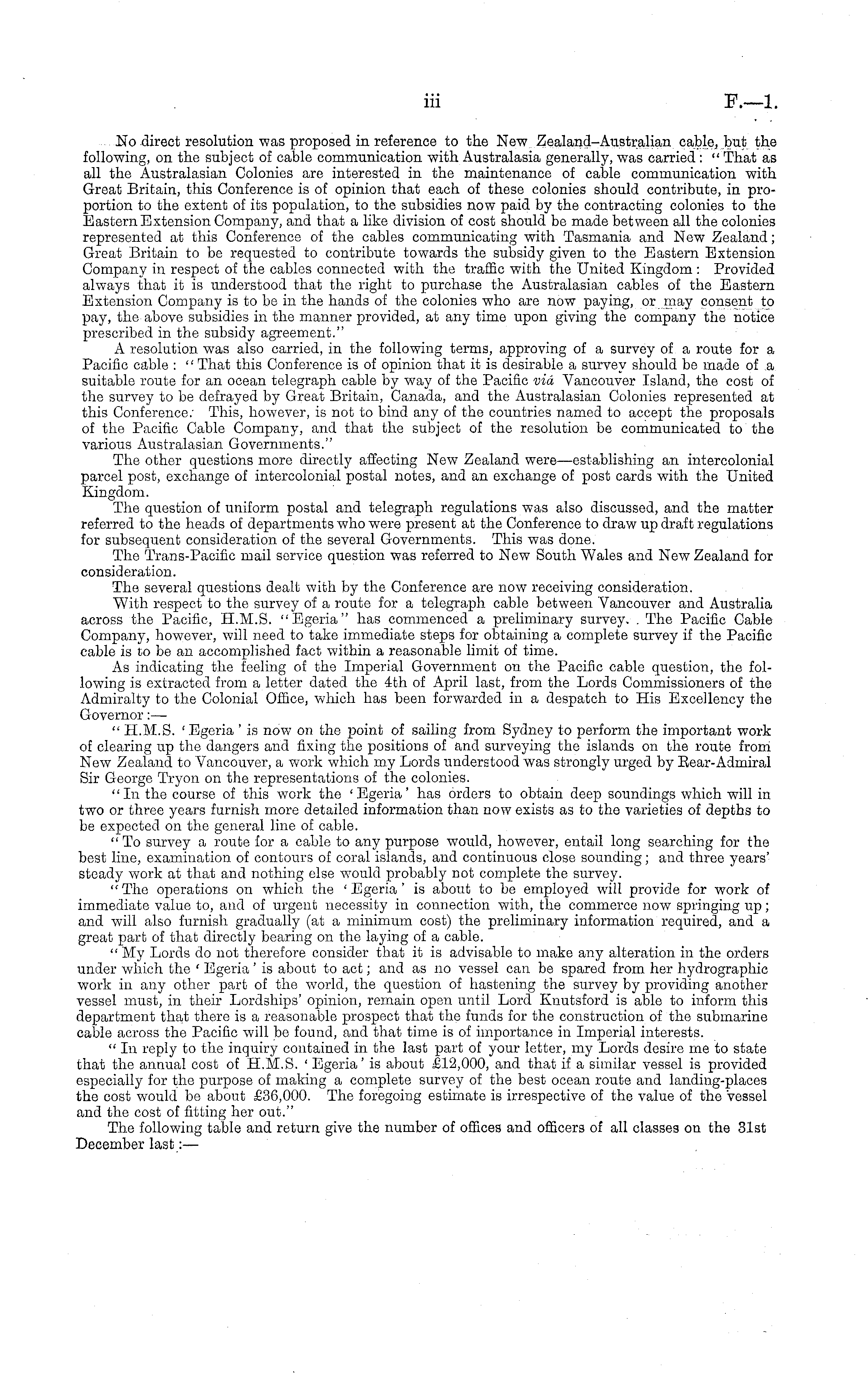No direct resolution was proposed in reference to the New Zealand-Australian cable, but the following, on the subject of cable communication with Australasia generally, was carried : " That as all the Australasian Colonies are interested in the maintenance of cable communication with Great Britain, this Conference is of opinion that each of these colonies should contribute, in proportion to the extent of its population, to the subsidies now paid by the contracting colonies to the Eastern Extension Company, and that a like division of cost should be made between all the colonies represented at this Conference of the cables communicating with Tasmania and New Zealand; Great Britain to be requested to contribute towards the subsidy given to the Eastern Extension Company in respect of the cables connected with the traffic with the United Kingdom : Provided always that it is understood that the right to purchase the Australasian cables of the Eastern Extension Company is to be in the hands of the colonies who are now paying, or may consent to pay, the above subsidies in the manner provided, at any time upon giving the company the notice prescribed in the subsidy agreement." A resolution was also carried, in the following terms, approving of a survey of a route for a Pacific cable : " That this Conference is of opinion that it is desirable a survey should be made of a suitable route for an ocean telegraph cable by way of the Pacific via Vancouver Island, the cost of the survey to be defrayed by Great Britain, Canada, and the Australasian Colonies represented at this Conference. This, however, is not to bind any of the countries named to accept the proposals of the Pacific Cable Company, and that the subject of the resolution be communicated to the various Australasian Governments." The other questions more directly affecting New Zealand were—establishing an intercolonial parcel post, exchange of intercolonial postal notes, and an exchange of post cards with the United Kingdom. The question of uniform postal and telegraph regulations was also discussed, and the matter referred to the heads of departments who were present at the Conference to draw up draft regulations for subsequent consideration of the several Governments. This was done. The Trans-Pacific mail service question was referred to New South Wales and New Zealand for consideration. The several questions dealt with by the Conference are now receiving consideration. With respect to the survey of a route for a telegraph cable between Vancouver and Australia across the Pacific, H.M.S. "Egoria" has commenced a preliminary survey. . The Pacific Cable Company, however, will need to take immediate steps for obtaining a complete survey if the Pacific cable is to be an accomplished fact within a reasonable limit of time. As indicating the feeling of the Imperial Government on the Pacific cable question, the following is extracted from a letter dated the 4th of April last, from the Lords Commissioners of the Admiralty to the Colonial Office, which has been forwarded in a despatch to His Excellency the Governor:— " H.M.S. 'Egeria ' is now on the point of sailing from Sydney to perform the important work of clearing up the dangers and fixing the positions of and surveying the islands on the route from New Zealand to Vancouver, a work which my Lords understood was strongly urged by Bear-Admiral Sir George Tryon on the representations of the colonies. "In the course of this work the 'Egeria' has orders to obtain deep soundings which will in two or three years furnish more detailed information than now exists as to the varieties of depths to be expected on the general line of cable. " To survey a route for a cable to any purpose would, however, entail long searching for the best line, examination of contours of coral islands, and continuous close sounding; and three years' steady work at that and nothing else would probably not complete the survey. " The operations on which the ' Egeria ' is about to be employed will provide for work of immediate value to, and of urgent necessity in connection with, the commerce now springing up; and will also furnish gradually (at a minimum cost) the preliminary information required, and a great part of that directly bearing on the laying of a cable. " My Lords do not therefore consider that it is advisable to make any alteration in the orders under which the ' Egeria' is about to act; and as no vessel can be spared from her hydrographic work in any other part of the world, the question of hastening the survey by providing another vessel must, in their Lordships' opinion, remain open until Lord Knutsford is able to inform this department that there is a reasonable prospect that the funds for the construction of the submarine cable across the Pacific will be found, and that time is of importance in Imperial interests. " In reply to the inquiry contained in the last part of your letter, my Lords desire me to state that the annual cost of H.M.S. 'Egeria' is about £12,000, and that if a similar vessel is provided especially for the purpose of making a complete survey of the best ocean route and landing-places the cost would be about £36,000. The foregoing estimate is irrespective of the value of the vessel and the cost of fitting her out." The following table and return give the number of offices and officers of all classes on the 31st December last:—