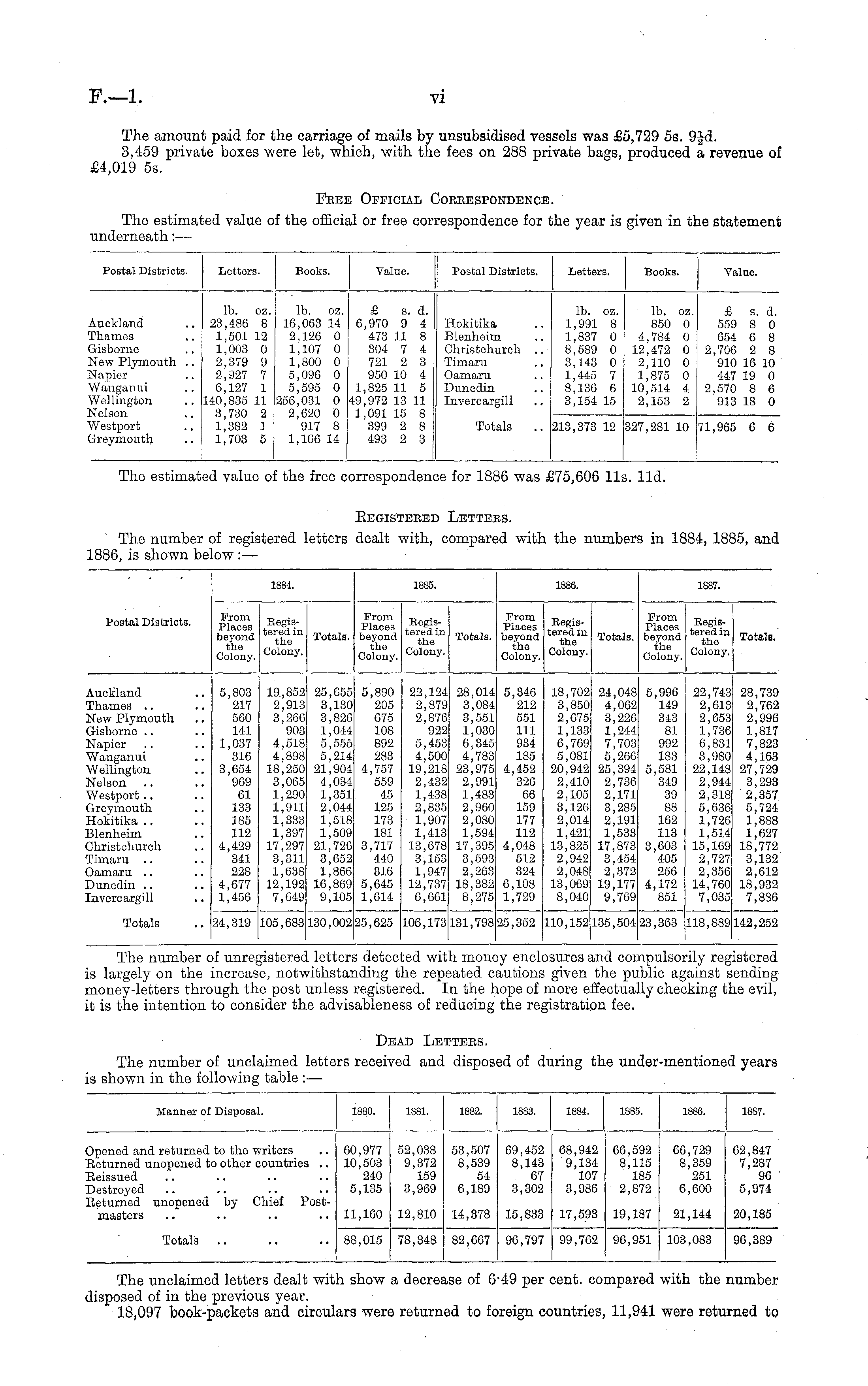 The estimated value of the free correspondence for 1886 was £75,606 lls. lid. Eegisteeed Lettees. The number of registered letters dealt with, compared with the numbers in 1884, 1885, and 1886, is shown below :—