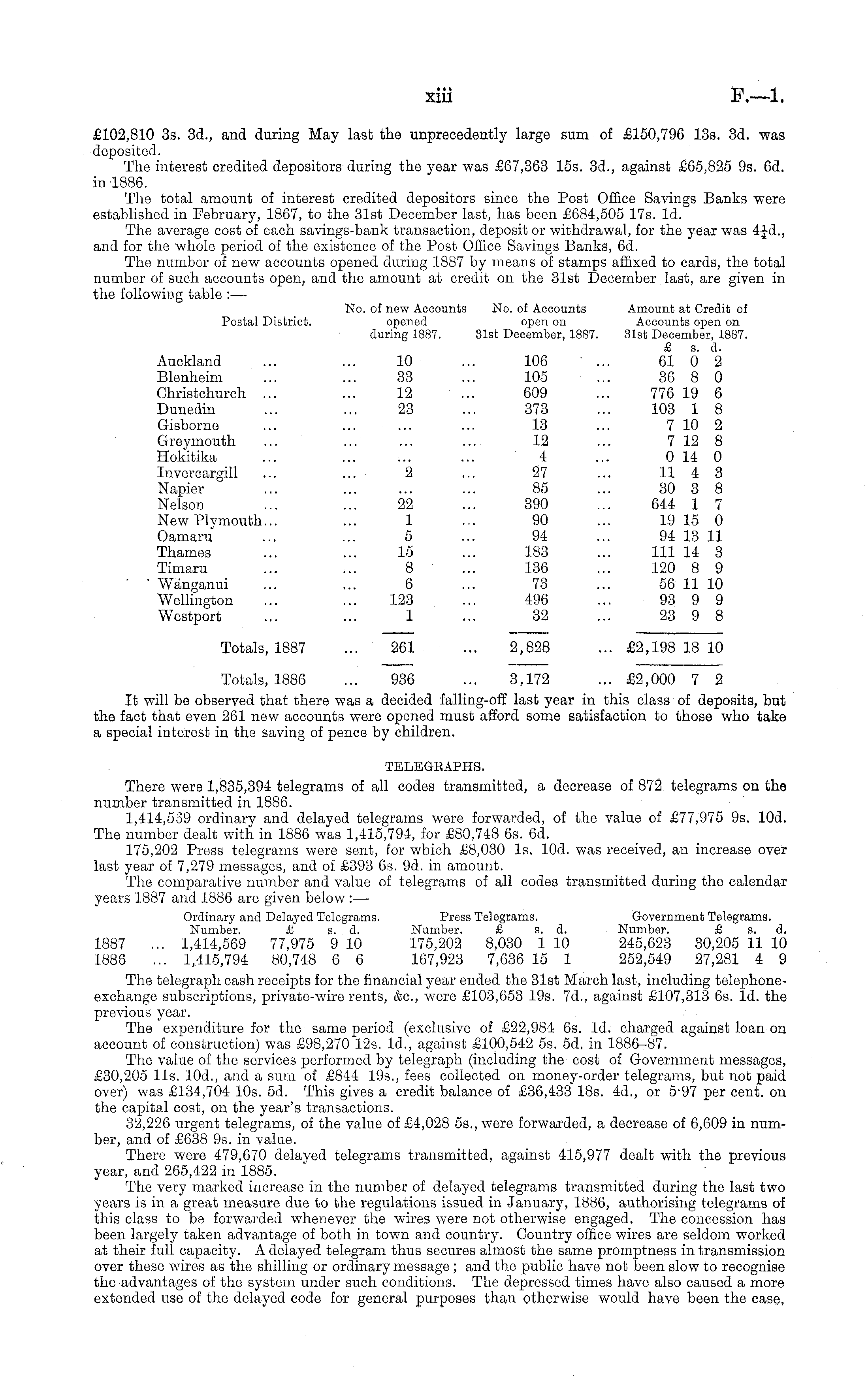 £102,810 3s. 3d., and during May last the unprecedently large sum of £150,796 13s. 3d. was deposited. The interest credited depositors during the year was £67,363 15s. 3d., against £65,825 9s. 6d. in 1886. The total amount of interest credited depositors since the Post Office Savings Banks were established in February, 1867, to the 31st December last, has been £684,505 17s. Id. The average cost of each savings-bank transaction, deposit or withdrawal, for the year was 4Jd., and for the whole period of the existence of the Post Office Savings Banks, 6d. The number of new accounts opened during 1887 by means of stamps affixed to cards, the total number of such accounts open, and the amount at credit on the 31st December last, are given in the following table : —■ No. of now Accounts No. of Accounts Amount at Credit of Postal District. opened open on Accounts open on during 1887. 31st December, 1887. 31st December, 1887. £ s. d. Auckland ... ... 10 ... 106 ... 61 0 2 Blenheim ... ... 33 ... 105 ... 36 8 0 Christchurch ... ... 12 ... 609 ... 776 19 6 Dunedin ... ... 23 ... 373 ... 103 1 8 Gisborne ... ... 13 ... 7 10 2 Greymouth ... ... 12 ... 712 8 Hokitika ... ... 4 ... 0 14 0 Invercargill ... ... 2 ... 27 ... 11 4 3 Napier ... ... 85 ... 30 3 8 Nelson ... ... 22 ... 390 ... 644 1 7 New Plymouth... ... 1 ... 90 ... 19 15 0 Oamaru ... ... 5 ... 94 ... 94 13 11 Thames ... ... 15 ... 183 ... 11l 14 3 Timaru ... ... 8 ... 136 ... 120 8 9 • Wanganui ... ... 6 ... 73 ... 56 11 10 Wellington ... ... 123 ... 496 ... 93 9 9 Westport ... ... 1 ... 32 ... 23 9 8 Totals, 1887 ... 261 ... 2,828 ... £2,198 18 10 Totals, 1886 ... 936 ... 3,172 ... £2,000 7 2 It will be observed that there was a decided falling-off last year in this class of deposits, but the fact that even 261 new accounts were opened must afford some satisfaction to those who take a special interest in the saving of pence by children. TELEGRAPHS. There were 1,835,394 telegrams of all codes transmitted, a decrease of 872 telegrams on the number transmitted in 1886. 1,414,539 ordinary and delayed telegrams were forwarded, of the value of £77,975 9s. lOd. The number dealt with in 1886 was 1,415,794, for £80,748 6s. 6d. 175,202 Press telegrams were sent, for which £8,030 Is. lOd. was received, an increase over last year of 7,279 messages, and of £393 6s. 9d. in amount. The comparative number and value of telegrams of all codes transmitted during the calendar years 1887 and 1886 are given below :— Ordinary and Delayed Telegrams. Press Telegrams. Government Telegrams. Number. £ s. d. Number. £ s. d. Number. £ s. d. 1887 ... 1,414,569 77,975 910 175,202 8,030 110 245,623 30,205 11 10 1886 ... 1,415,794 80,748 6 6 167,923 7,636 15 1 252,549 27,281 4 9 The telegraph cash receipts for the financial year ended the 31st March last, including telephoneexchange subscriptions, private-wire rents, &c, were £103,653 19s. 7d., against £107,313 6s. Id. the previous year. The expenditure for the same period (exclusive of £22,984 6s. Id. charged against loan on account of construction) was £98,270 12s. Id., against £100,542 ss. sd. in 1886-87. The value of the services performed by telegraph (including the cost of Government messages, £30,205 11s. 10d., and a sum of £844 195., fees collected on money-order telegrams, but not paid over) was £134,704 10s. sd. This gives a credit balance of £36,433 18s. 4d., or 5-97 per cent, on the capital cost, on the year's transactions. 32,226 urgent telegrams, of the value of £4,028 55., were forwarded, a decrease of 6,609 in number, and of £638 9s. in value. There were 479,670 delayed telegrams transmitted, against 415,977 dealt with the previous year, and 265,422 in 1885. The very marked increase in the number of delayed telegrams transmitted during the last two years is in a great measure due to the regulations issued in January, 1886, authorising telegrams of this class to be forwarded whenever the wires were not otherwise engaged. The concession has been largely taken advantage of both in town and country. Country office wires are seldom worked at their full capacity. A delayed telegram thus secures almost the same promptness in transmission over these wires as the shilling or ordinary message; and the public have not been slow to recognise the advantages of the system under such conditions. The depressed times have also caused a more extended use of the delayed code for general purposes than otherwise would have been the case.