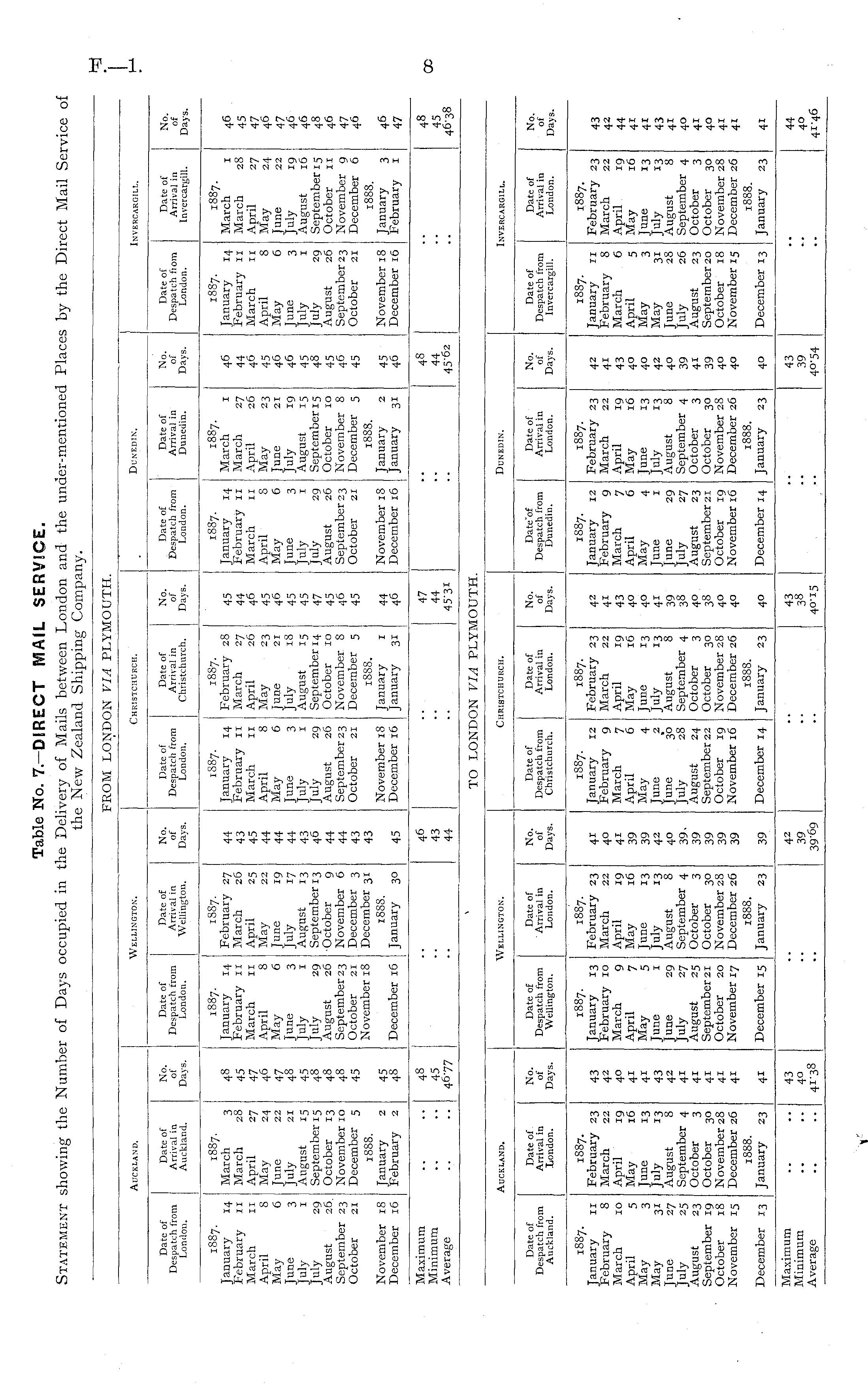 Auckland. Wellington 1. Christchurch. DUNEDIN. Invercargill. Date of Despatch from Auckland. Date of Arrival in London. No. of Days. Date of Despatch from Wellington. Date of Arrival in London. No. of Days. Date of Despatch from Christchurch. Date of Arrival in London. No. of Days. Dateof Despatch from Dunedin. Date of Arrival in London. No. of Days. Date of Despatch from Invercargill. Date of Arrival in London. No. of Days. 1887. January 11 February 8 March 10 April 5 May 3 May 31 June 27 July 25 August 23 September 19 October 18 November 15 1887. February 23 March 22 April 19 May 16 June 13 July 13 August 8 September 4 October 3 October 30 November 28 December 26 1888. January 23 43 42 40 41 43 42 41 4 1 41 4 1 1887. January 13 February 10 March 9 April 7 May 5 June 1 June 29 July 27 August 25 September 21 October 20 November 17 1887. February 23 March 22 April 19 May 16 June 13 July 13 August 8 September 4 October 3 October 30 November 28 December 26 1888. January 23 41 40 4 1 39 39 42 40 39. 39 39 39 39 1887. January 12 February 9 March 7 April 6 May 4 June 2 June 30 July 28 August 24 September 22 October 19 November 16 1887. February 23 March 22 April 19 May 16 June 13 July 13 August 8 September 4 October 3 October 30 November 28 December 26 1888. January 23 4 2 41 43 40 40 4 1 39 38 40 40 40 1887. January 12 February 9 March 7 April 6 May 4 June 1 June 29 July 27 August 23 September 21 October 19 November 16 1887. February 23 March 22 April 19 May 16 June 13 July 13 August 8 September 4 October 3 October 30 November 28 December 26 1888. January 23 42 4 1 43 40 40 42 40 39 39 40 40 1887. January 11 February 8 March 6 April 5 May 3 May 31 June 28 July 26 August 23 September 20 October 18 November 15 1887. February 23 March 22 April 19 May 16 June 13 July 13 August 8 September 4 October 3 October 30 November 28 December 26 1888. 43 42 44 41 43 41 40 40 41 41 December 13 4 1 December 15 39 December 14 40 December 14 40 December 13 January 23 4 1 Maximum Minimum Average 43 4° 42 39 39'69 43 38 40-15 43 39 4°'54 44 40 41-46