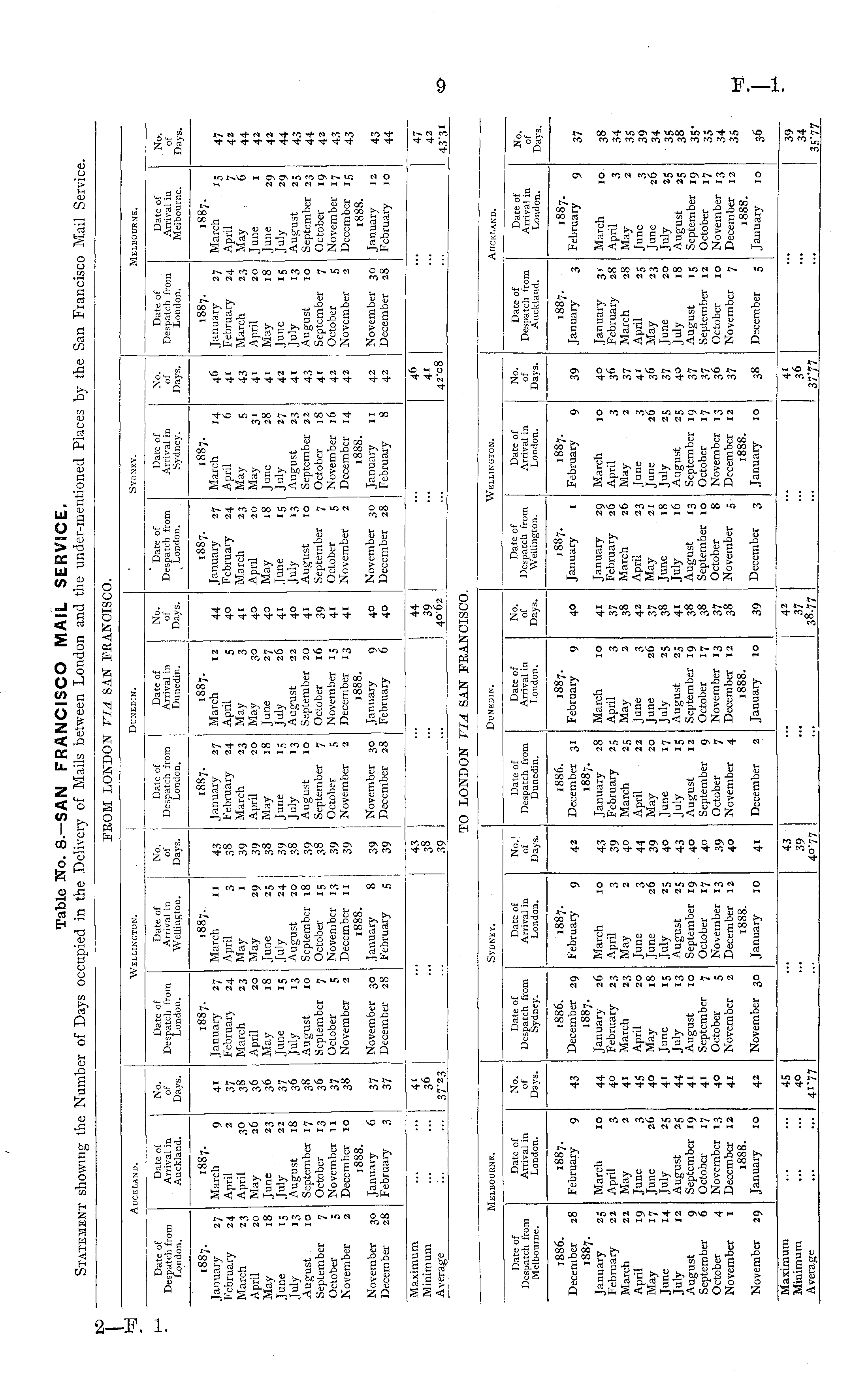 PROM LONDON" VIA SAN FRANCISCO. fcd Auckland. Wellington. DUNEDIN. Sydney. Melbourne. l-» Date of Despatch from London. 1887. January 27 February 24 March 23 April 20 May 18 June 15 August 10 September 7 October 5 November 2 Date of Arrival in Auckland. 1887. March 9 April 2 April 30 May 26 June 23 July 22 August 18 September 17 October 13 November 11 December 10 1888. No. of Days. 4' 37 36 36 37 36 38 36 37 38 Date of Despatch from London. 1887. January 27 February 24 March 23 April 20 May 18 June 15 August 10 September 7 October 5 November 2 Date of Arrival in Wellington. i 1887. March 1 1 April 3 May 1 May 29 June 25 July 24 August 20 September 18 October 15 November 13 December 1 1 1888. No. of Days. 43 38 39 39 38 39 38 39 38 39 39 Date of Despatch from London. I 1887. January 27 February 24 March 23 April 20 May 18 June 15 July 13 August 10 September 7 October 5 November 2 Date of Arrival in Dunedin. 1887. March 12 April 5 May 3 May 30 June 27 July 26 August 22 September 20 October 16 November 15 December 13 1888. January 9 February 6 No. of Days. 44 40 41 40 40 4' 40 4i 39 41 41 Date of Despatch from London. 1887. January 2 7 February 24 March 23 April 20 May 18 June 15 August 10 September 7 October 5 November 2 Date of Arrival in Sydney. 1887. March 14 April 6 May 5 May 3 1 June 28 July 27 August 23 September 22 October 18 November 16 December 14 1888. No. of Days. 46 4i 43 41 4t 42 41 43 4' 42 42 Date of Despatch from London. ,88 7 . January 27 February 24 March 23 April 20 May 18 June 15 J ul y '3 August 10 September 7 October 5 November 2 Date of Arrival in Melbourne. 1887. March 15 April 7 May 6 June 1 June 29 July 29 August 25 September 23 October 19 November 17 December 1 e, 1888. January 12 February 10 . No-. of Days. 47 42 44 42 42 44 43 44 42 43 43 November 30 December 28 January 6 February 3 37 37 November 30 December 28 January 8 February 5 39 39 November 30 December 28 40 40 November 30 December 28 January 11 February 8 42 42 November 30 December 28 43 44 Maximum Minimum Average 41 36 43 39 44 39 4062 46 42*O8 47 42