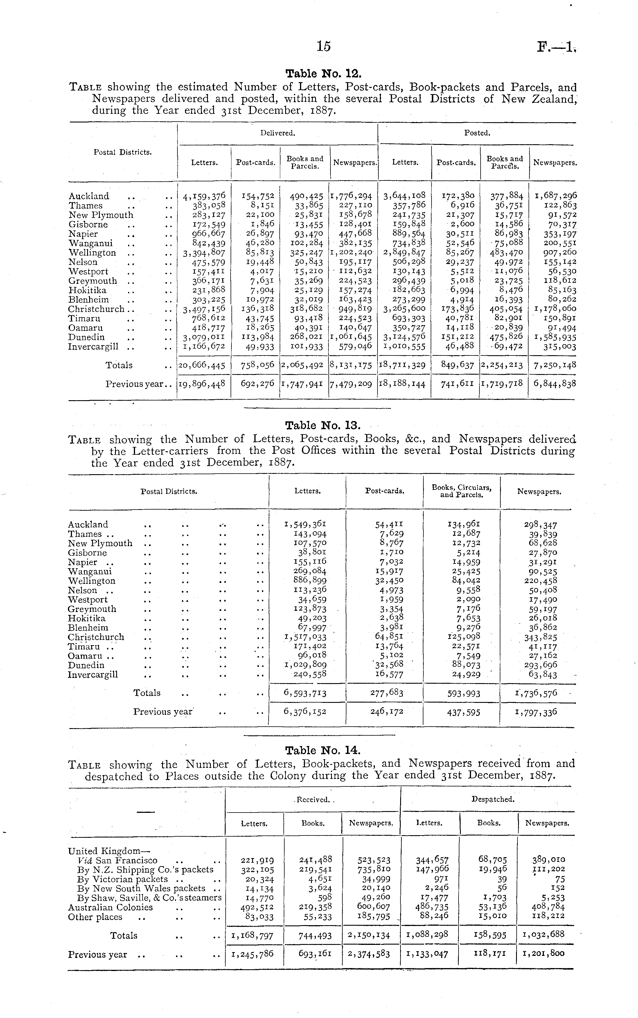 Postal Districts. Letters. Post-cards. Books, Circulars, and Parcels. Newspapers. Auckland rhames .. Sew Plymouth jisborne Sfapier .. iVanganui Wellington Slelson .. SVestport Ureymouth riokitika 31enheim rimaru .. Damaru .. Dunedin invercargill i 1,549,361 143,094 107,570 38,801 155,116 269,084 886,899 113,236 34.659 123,873 49,203 67,997 1,517,033 171,402 96,018 1,029,809 240,558 54.4" 7.629 8,767 1,710 7. O32 15.917 32.45O 4.973 1.959 3.354 2,638 3,98i 64,851 13.764 5,102 '32,568 ' 16,577 134.961 12,687 12,732 5,214 14.959 25,425 84,042 9,558 2,ogo 7,176 7.653 9,276 125,098 22,571 7.549 88,073 24,929 298,347 39,»39 68,628 27,870 3i,29i 9°,525 220,458 5°,408 17,490 59,197 26,018 36,862 343.825 41,117 27,162 293,696 63,843 Totals 6,593,713 277,683 593.993 1.736,576 Previous year' 6,376,152 246,172 437.595 J.797.336