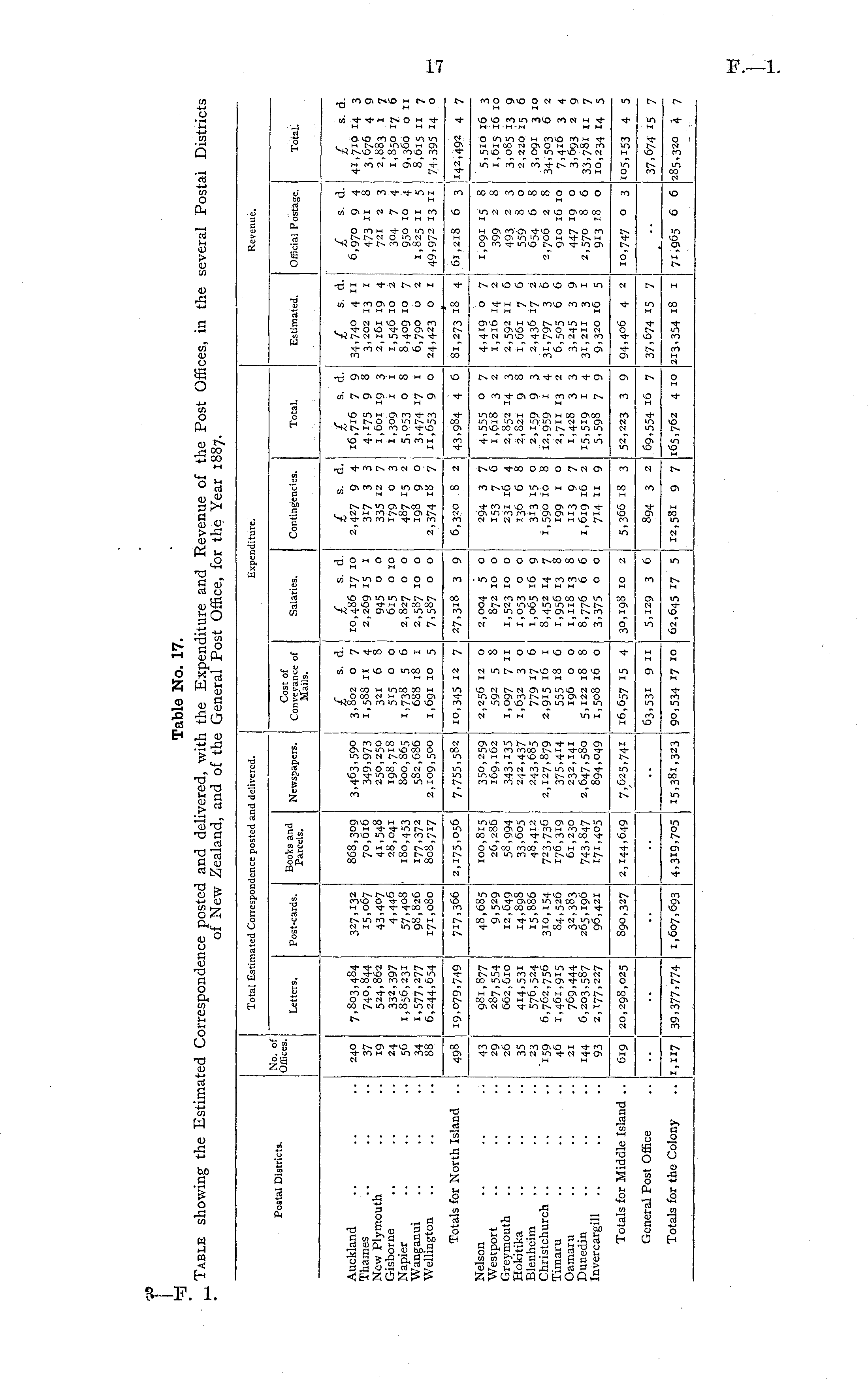 Table No. 17. Table showing the Estimated Correspondence posted and delivered, with the Expenditure and Revenue of the Post Offices, in the several Postal Districts of New Zealand, and of the General Post Office, for the Year 1887.