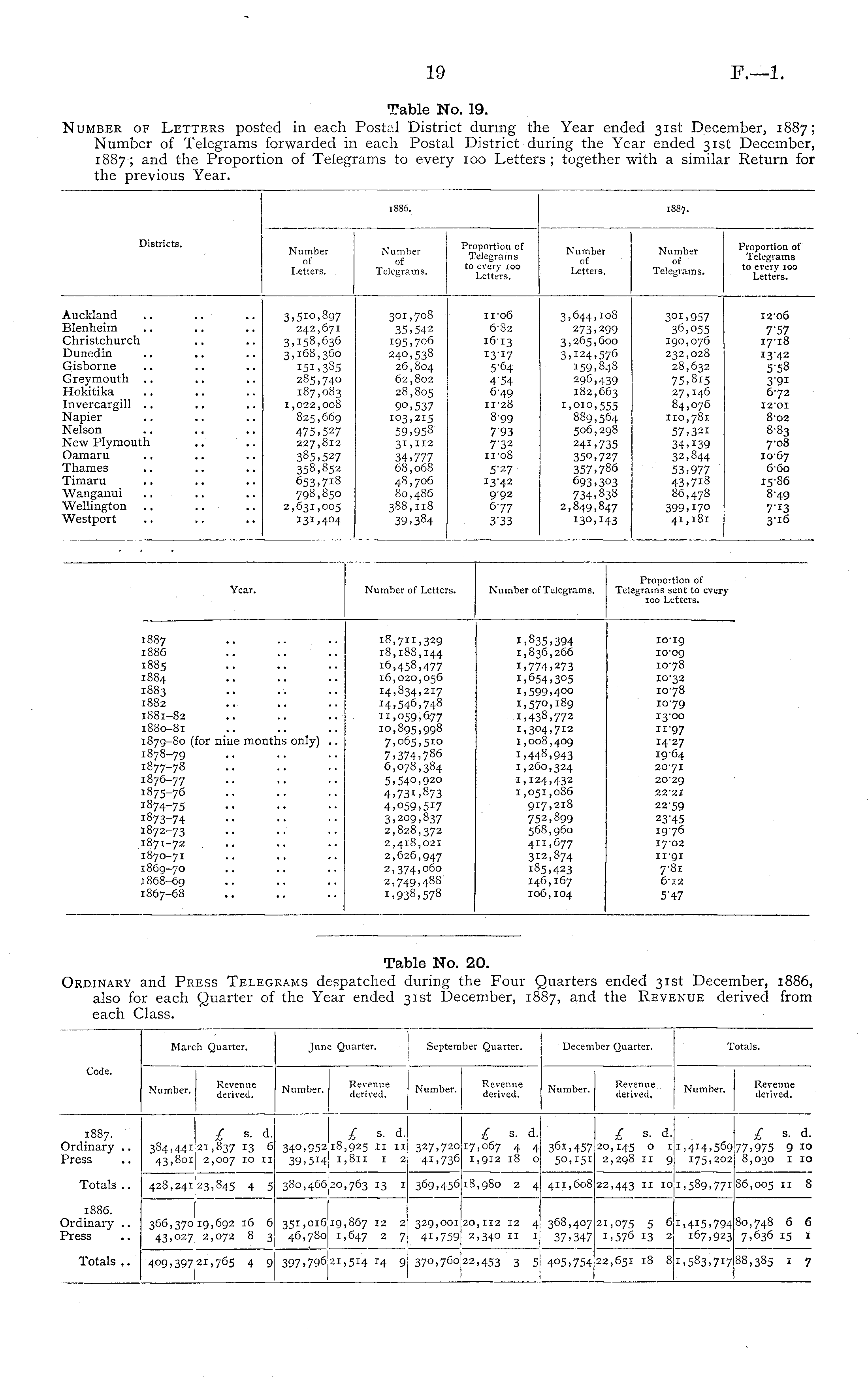 Table No. 19. Number of Letters posted in each Postal District during the Year ended 31st December, 1887; Number of Telegrams forwarded in each Postal District during the Year ended 31st December, 1887; and the Proportion of Telegrams to every 100 Letters; together with a similar Return for the previous Year.