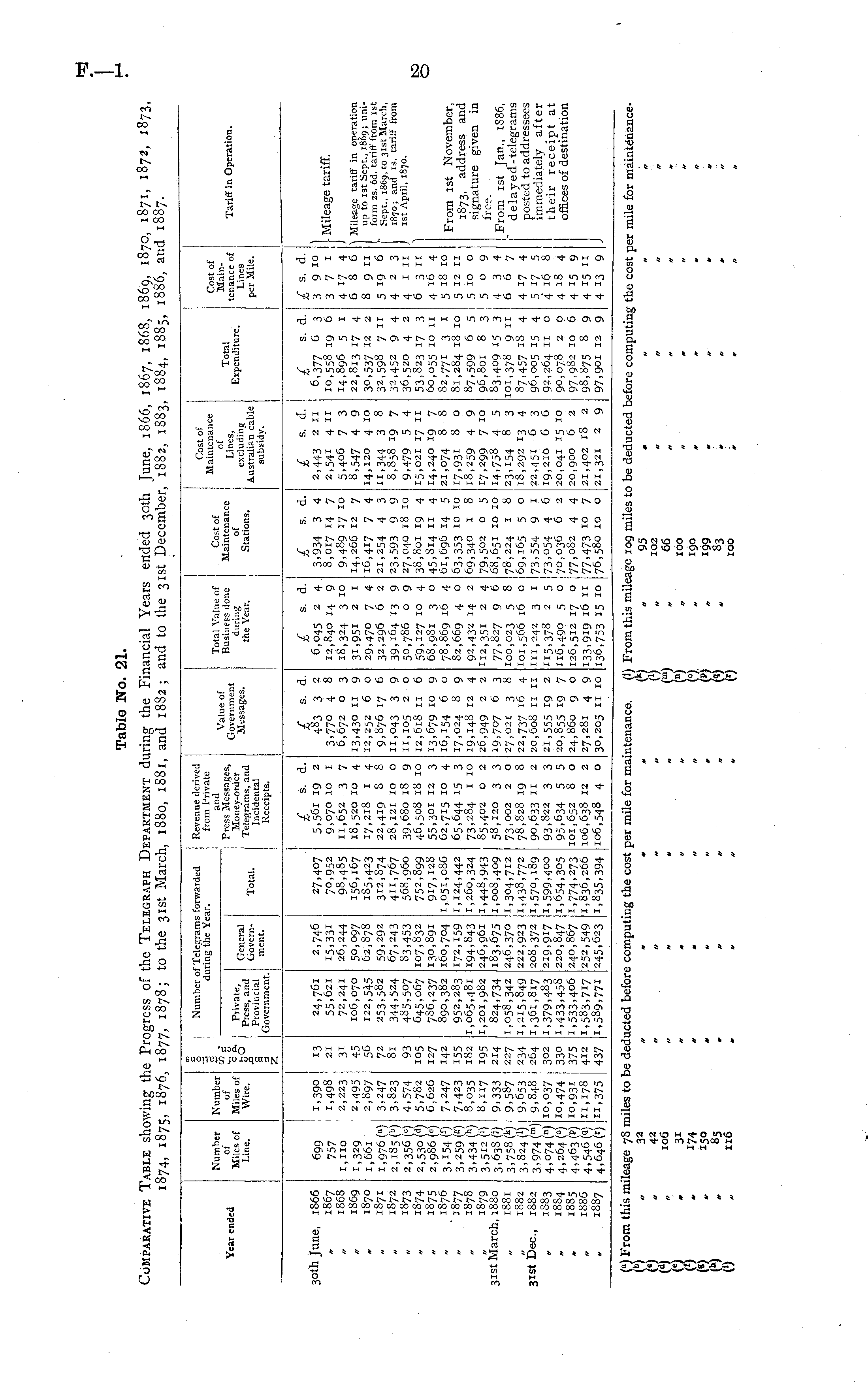 Table No. 21. Comparative Table showing the Progress of the Telegraph Department during the Financial Years ended 30th June, 1866, 1867, 1868, 1869, 1870, 1871, 1872, 1873, 1874, 1875, 1876, 1877, 1878; to the 31st March, 1880, 1881, and 1882; and to the 31st December, 1882, 1883, 1884, 1885, 1886, and 1887.
