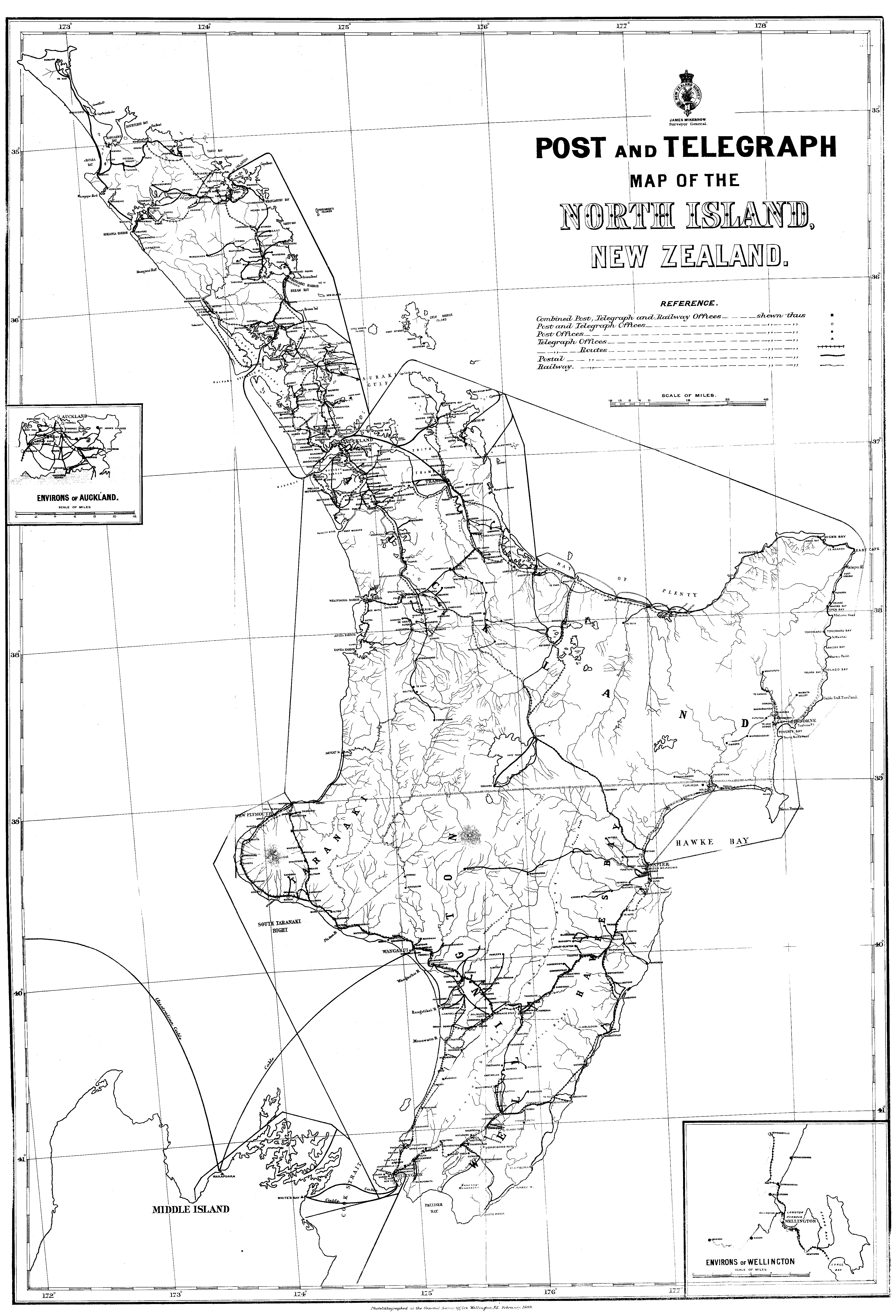 POST and TELEGRAPH MAP OF THE NORTH ISLAND, NEW ZEALAND.