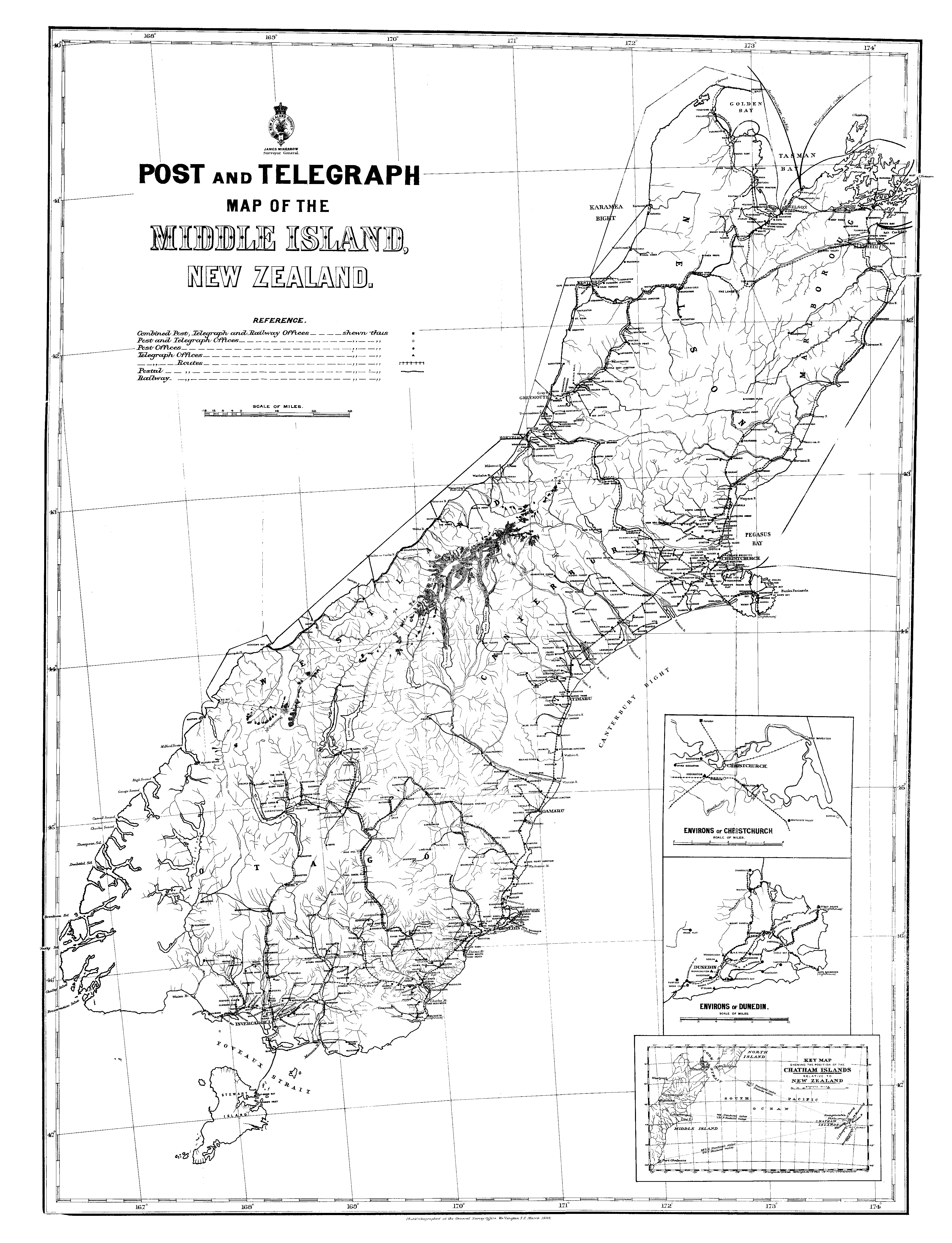 POST AND TELEGRAPH MAP OF THE MIDDLE ISLAND, NEW ZEALAND.
