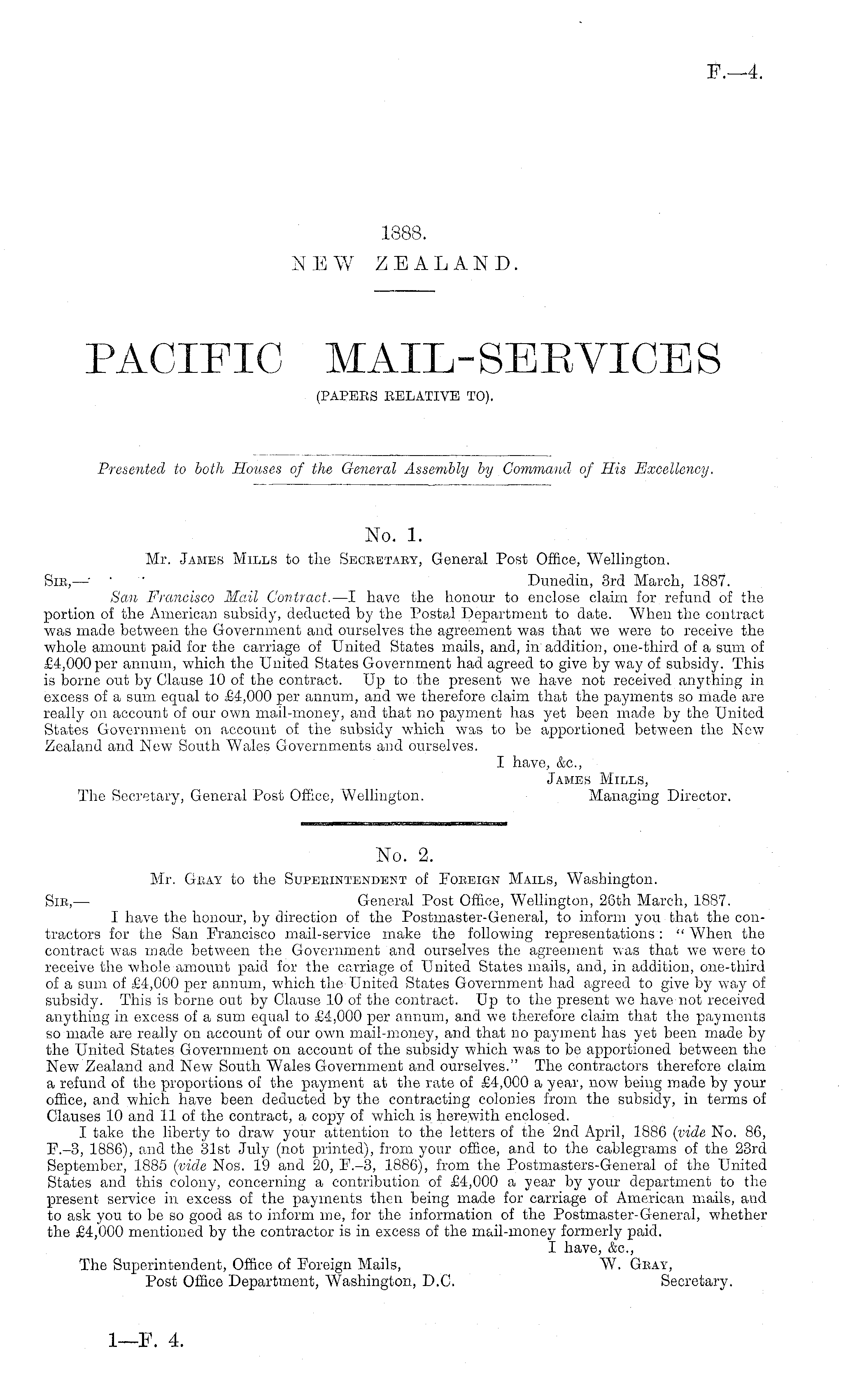 No. 2, Mr. Geay to the Superintendent of Foreign Mails, Washington. Sib,— General Post Office, Wellington, 26th March, 1887. I have the honour, by direction of the Postmaster-General, to inform you that the contractors for the San Francisco mail-service make the following representations: " When the contract was made between the Government and ourselves the agreement was that we were to receive the whole amount paid for the carriage of United States mails, and, in addition, one-third of a sum of £4,000 per annum, which the United States Government had agreed to give by way of subsidy. This is borne out by Clause 10 of the contract. Up to the present wo have not received anything in excess of a sum equal to £4,000 per annum, and we therefore claim that the payments so made are really on account of our own mail-money, and that no payment has yet been made by the United States Government on account of the subsidy which -was to bo apportioned between the New Zealand and New South Wales Government and ourselves." The contractors therefore claim a refund of the proportions of the payment at the rate of £4,000 a year, now being made by your office, and which have been deducted by the contracting colonies from the subsidy, in terms of Clauses 10 and 11 of the contract, a copy of which is herewith enclosed. I take the liberty to draw your attention to the letters of the 2nd April, 1886 (vide No. 86, F.-3, 1886), and the 31st July (not printed), from your office, and to the cablegrams of the 23rd September, 1885 (vide Nos. 19 and 20, F.-8, 1886), from the Postmasters-General of the United States and this colony, concerning a contribution of £4,000 a year by your department to the present service in excess of the payments then being made for carriage of American mails, and to ask you to be so good as to inform me, for the information of the Postmaster-General, whether the £4,000 mentioned by the contractor is in excess of the mail-money formerly paid. I have, &c, The Superintendent, Office of Foreign Mails, W. Ghay, Post Office Department, Washington, D.C. Secretary.