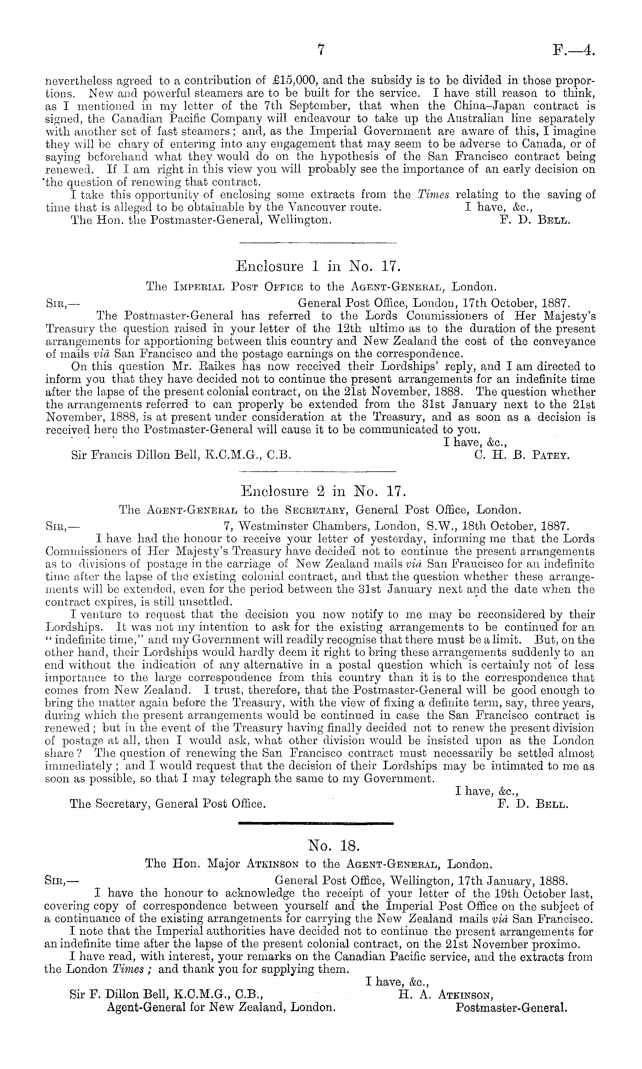 No. 18. The Hon. Major Atkinson to the Agent-Genebal, London. Sib,— General Post Office, Wellington, 17th January, 1888. I have the honour to acknowledge the receipt of your letter of the 19th October last, covering copy of correspondence between yourself and the Imperial Post Office on the subject of a continuance of the existing arrangements for carrying the New Zealand mails via San Francisco. I note that the Imperial authorities have decided not to continue the present arrangements for an indefinite time after the lapse of the present colonial contract, on the 21st November proximo. I have read, with interest, your remarks on the Canadian Pacific service, and the extracts from the London Times ; and thank you for supplying them. I have, &c, Sir P. Dillon Bell, K.0.M.G., C.8., H. A. Atkinson, Agent-General for New Zealand, London. Postmaster-General.