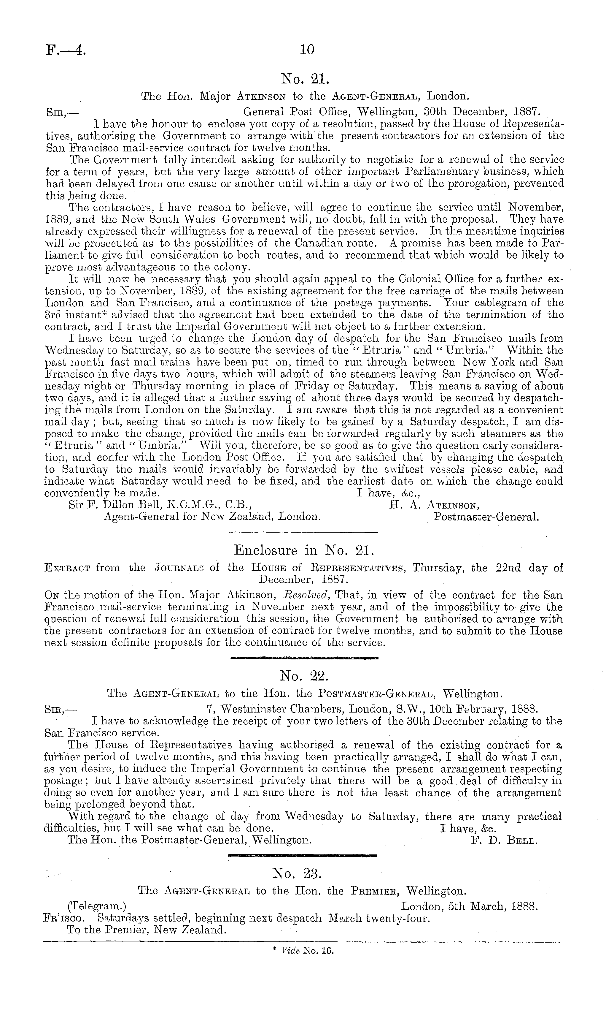 Enclosure in No. 21. Exteact from the Journals of the House of Eepeesentatives, Thursday, the 22nd day of December, 1887. On the motion of the Hon. Major Atkinson, Resolved, That, in view of the contract for the San Francisco mail-service terminating in November next year, and of the impossibility to give the question of renewal full consideration this session, the Government be authorised to arrange with the present contractors for an extension of contract for twelve months, and to submit to the House next session definite proposals for the continuance of the service.