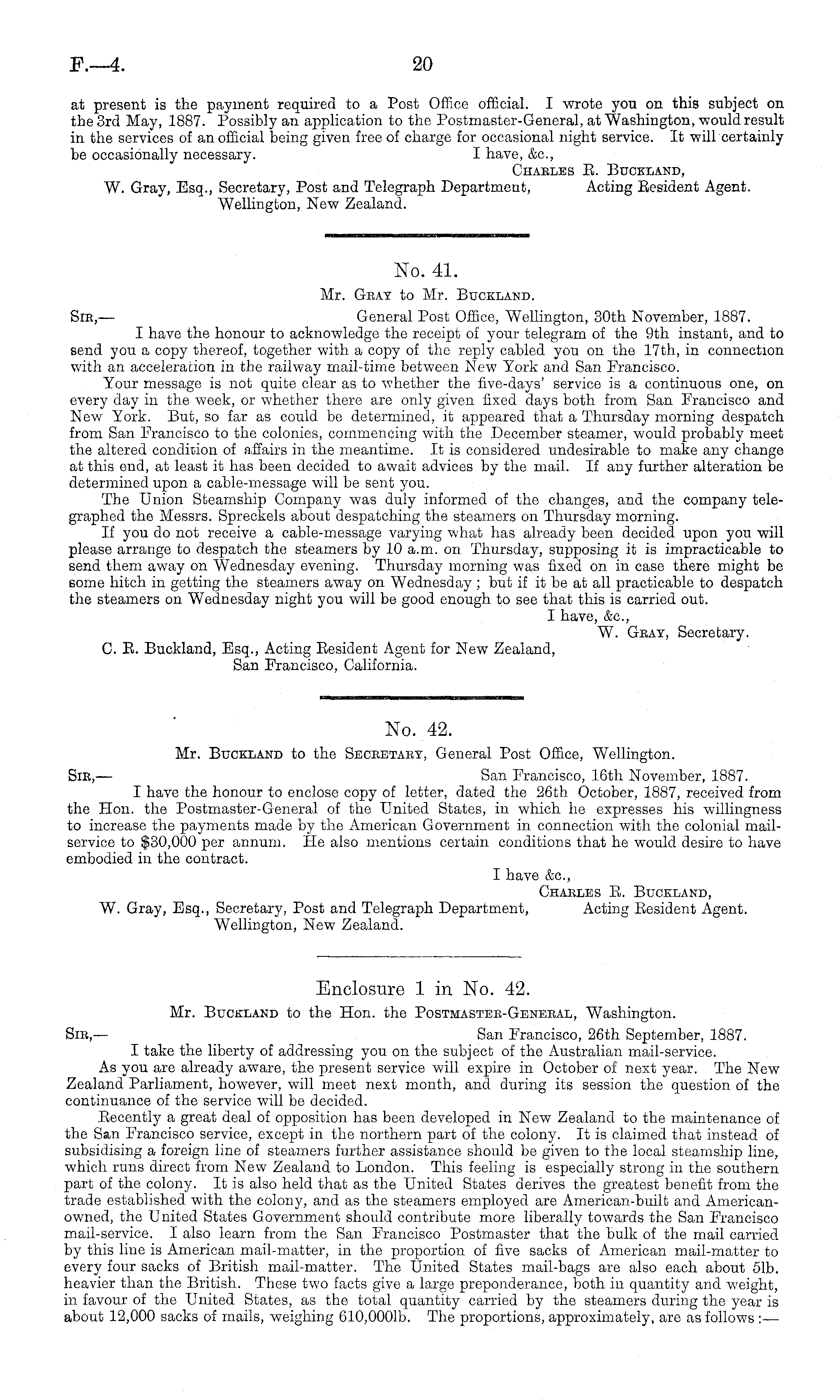Enclosure 1 in No. 42. Mr. Buckland to the Hon. the Postmastek-Genebal, Washington. Sib, — San Francisco, 26th September, 1887. I take the liberty of addressing you on the subject of the Australian mail-service. As you are already aware, the present service will expire in October of next year. The New Zealand Parliament, however, will meet next month, and during its session the question of the continuance of the service will be decided. Eecently a great deal of opposition has been developed in New Zealand to the maintenance of the San Francisco service, except in the northern part of the colony. It is claimed that instead of subsidising a foreign line of steamers further assistance should be given to the local steamship line, which runs direct from New Zealand to London. This feeling is especially strong in the southern part of the colony. It is also held that as the United States derives the greatest benefit from the trade established with the colon)', and as the steamers employed are American-built and Americanowned, the United States Government should contribute more liberally towards the San Francisco mail-service. I also learn from the San Francisco Postmaster that the bulk of the mail carried by this line is American mail-matter, in the proportion of five sacks of American mail-matter to every four sacks of British mail-matter. The United States mail-bags are also each about 51b. heavier than the British. These two facts give a large preponderance, both in quantity and weight, in favour of the United States, as the total quantity carried by the steamers during the year is about 12,000 sacks of mails, weighing 610,0001b. The proportions, approximately, are as follows :—
