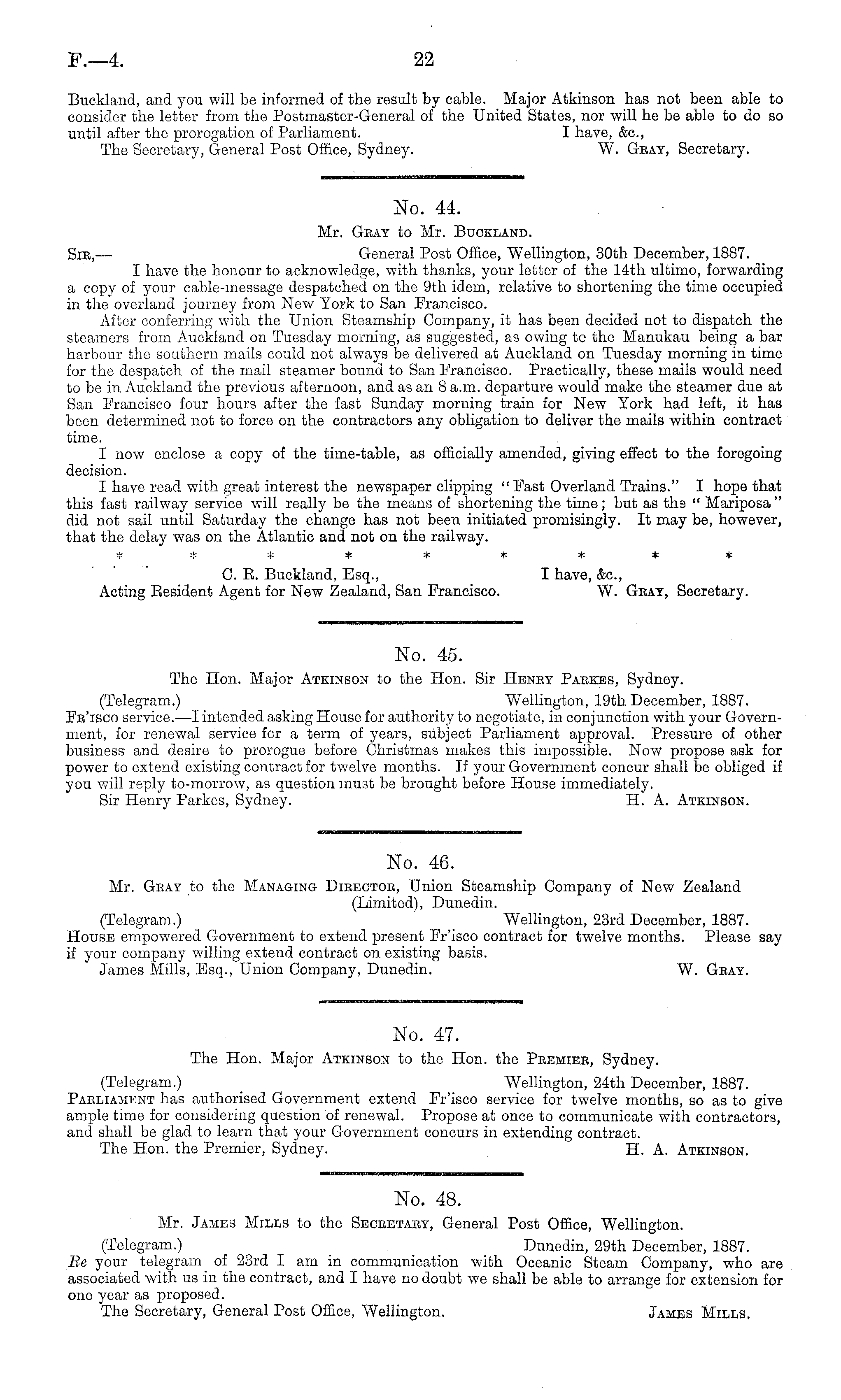No. 45. The Hon. Major Atkinson to the Hon. Sir Hbney Paekes, Sydney. (Telegram.) Wellington, 19th December, 1887. Fb'isco service.—l intended asking House for authority to negotiate, in conjunction with your Government, for renewal service for a term of years, subject Parliament approval. Pressure of other business and desire to prorogue before Christmas makes this impossible. Now propose ask for power to extend existing contract for twelve months. If your Government concur shall be obliged if you will reply to-morrow, as question must be brought before House immediately. Sir Henry Parkes, Sydney. H. A. Atkinson.