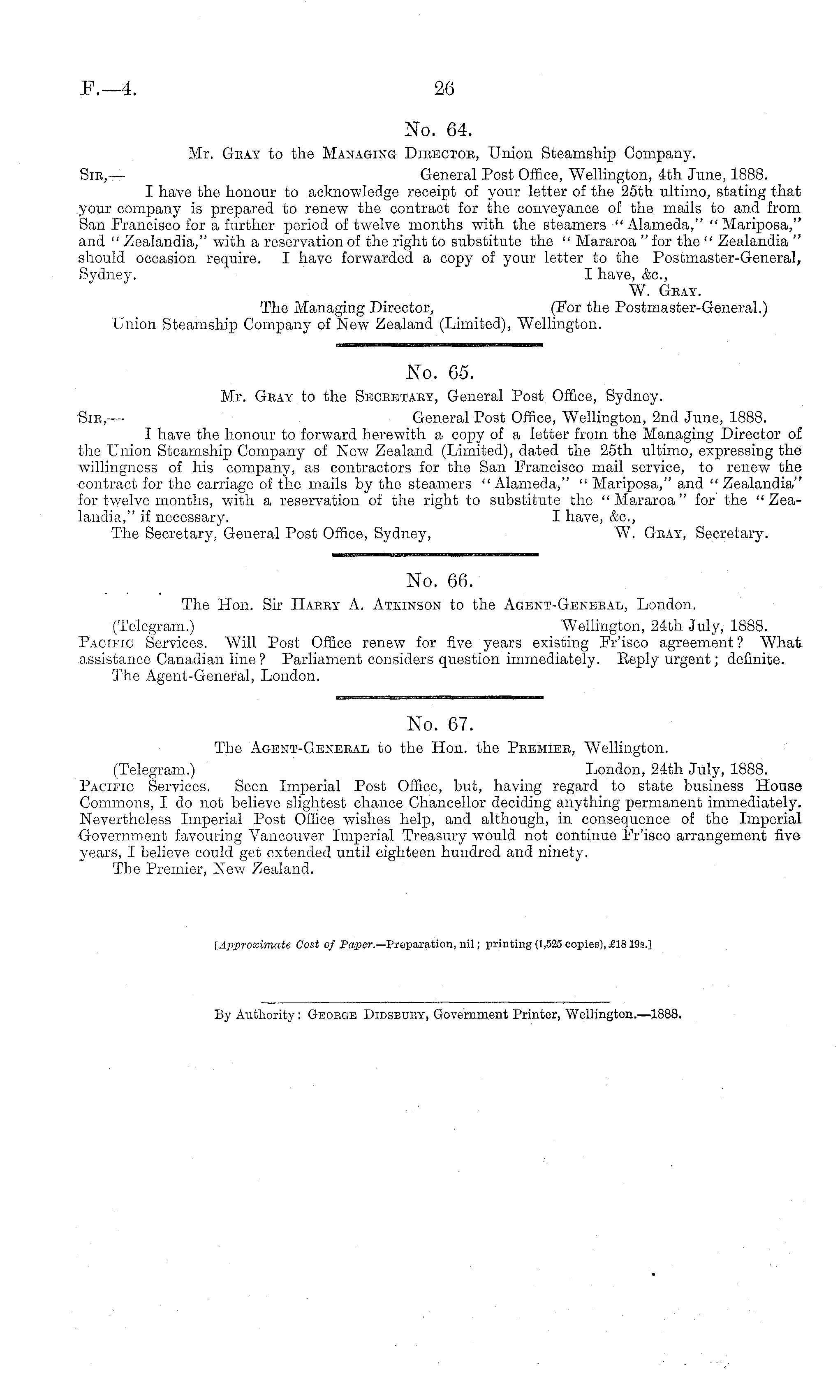 No. 64. Mr. Gray to the Managing Director, Union Steamship Company. Sir, — General Post Office, Wellington, 4th June, 1888. I have the honour to acknowledge receipt of your letter of the 25th ultimo, stating that your company is prepared to renew the contract for the conveyance of the mails to and from San Francisco for a further period of twelve months with the steamers "Alameda," "Mariposa," and " Zealandia," with a reservation of the right to substitute the " Mararoa " for the " Zealandia " should occasion require. I have forwarded a copy of your letter to the Postmaster-General, Sydney. I have, &c, W. Gray. The Managing Director, (For the Postmaster-General.) Union Steamship Company of New Zealand (Limited), Wellington.