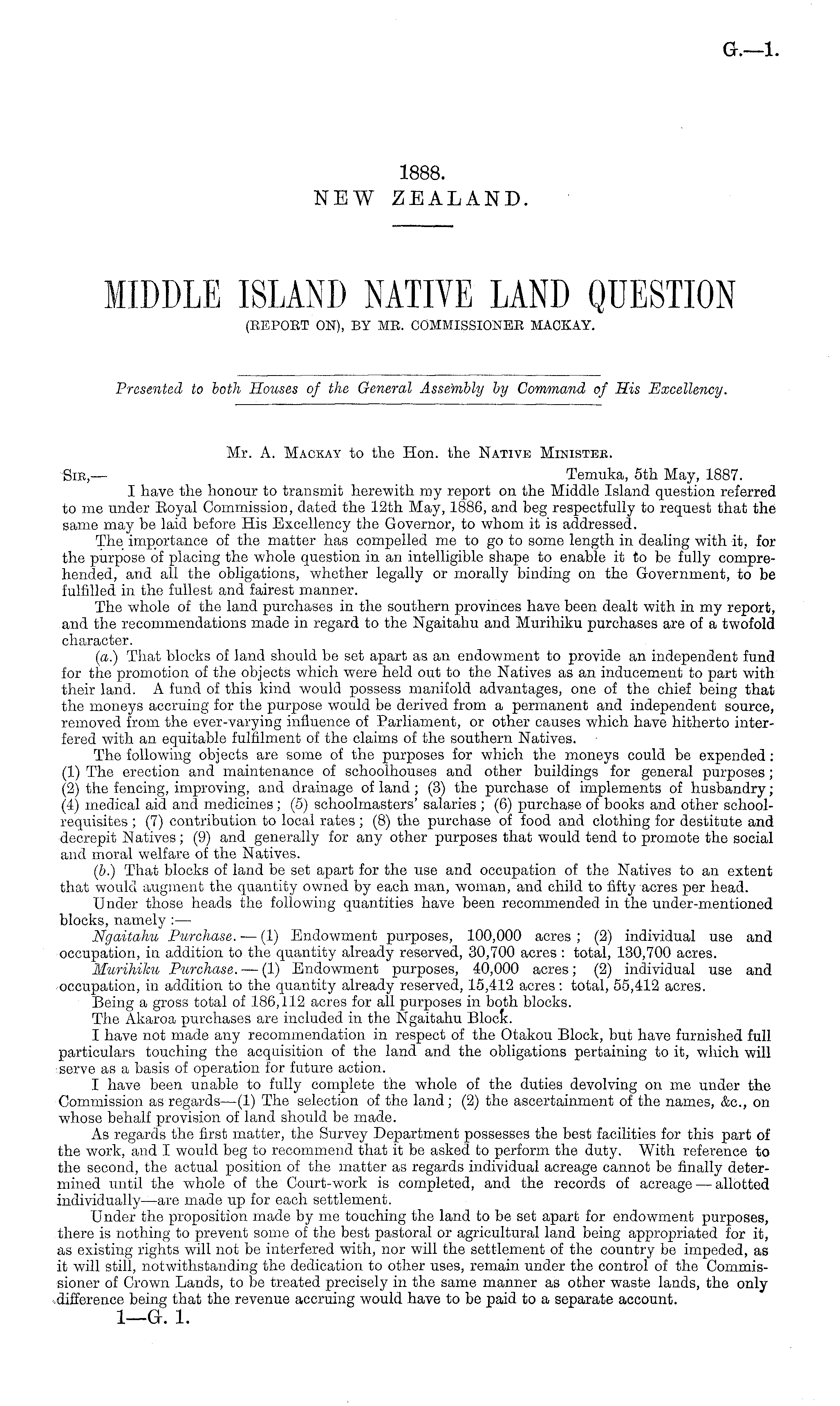 Mr. A. Mackay to the Hon. the Native Minister. Sir,— Temuka, sth May, 1887. I have the honour to transmit herewith my report on the Middle Island question referred to me under Royal Commission, dated the 12th May, 1886, and beg respectfully to request that the same may be laid before His Excellency the Governor, to whom it is addressed. The importance of the matter has compelled me to go to some length in dealing with it, for the purpose of placing the whole question in an intelligible shape to enable it to be fully comprehended, and all the obligations, whether legally or morally binding on the Government, to be fulfilled in the fullest and fairest manner. The whole of the land purchases in the southern provinces have been dealt with in my report, and the recommendations made in regard to the Ngaitahu and Murihiku purchases are of a twofold character. (a.) That blocks of land should be set apart as an endowment to provide an independent fund for the promotion of the objects which were held out to the Natives as an inducement to part with their land. A fund of this kind would possess manifold advantages, one of the chief being that the moneys accruing for the purpose would be derived from a permanent and independent source, removed from the ever-varying influence of Parliament, or other causes which have hitherto interfered with an equitable fulfilment of the claims of the southern Natives. The following objects are some of the purposes for which the moneys could be expended: (1) The erection and maintenance of schoolhouses and other buildings for general purposes; (2) the fencing, improving, and drainage of land; (3) the purchase of implements of husbandry; (4) medical aid and medicines ; (5) schoolmasters' salaries ; (6) purchase of books and other schoolrequisites ; (7) contribution to local rates ; (8) the purchase of food and clothing for destitute and decrepit Natives ; (9) and generally for any other purposes that would tend to promote the social and moral welfare of the Natives. (b.) That blocks of land be set apart for the use and occupation of the Natives to an extent that would augment the quantity owned by each man, woman, and child to fifty acres per head. Under those heads the following quantities have been recommended in the under-mentioned blocks, namely : — Ngaitahu Purchase. — (1) Endowment purposes, 100,000 acres ; (2) individual use and occupation, in addition to the quantity already reserved, 30,700 acres : total, 130,700 acres. Murihiku Purchase. — (1) Endowment purposes, 40,000 acres; (2) individual use and occupation, in addition to the quantity already reserved, 15,412 acres: total, 55,412 acres. Being a gross total of 186,112 acres for all purposes in both blocks. The Akaroa purchases are included in the Ngaitahu Blocfc. I have not made any recommendation in respect of the Otakou Block, but have furnished full particulars touching the acquisition of the land and the obligations pertaining to it, which will •serve as a basis of operation for future action. I have been unable to fully complete the whole of the duties devolving on me under the Commission as regards—(l) The selection of the land; (2) the ascertainment of the names, &c, on whose behalf provision of land should be made. As regards the first matter, the Survey Department possesses the best facilities for this part of the work, and I would beg to recommend that it be asked to perform the duty. With reference to the second, the actual position of the matter as regards individual acreage cannot be finally determined until the whole of the Court-work is completed, and the records of acreage — allotted individually —are made up for each settlement. Under the proposition made by me touching the land to be set apart for endowment purposes, there is nothing to prevent some of the best pastoral or agricultural land being appropriated for it, as existing rights will not be interfered with, nor will the settlement of the country be impeded, as it will still, notwithstanding the dedication to other uses, remain under the control of the Commissioner of Crown Lands, to be treated precisely in the same manner as other waste lands, the only difference being that the revenue accruing would have to be paid to a separate account. I— G. 1.