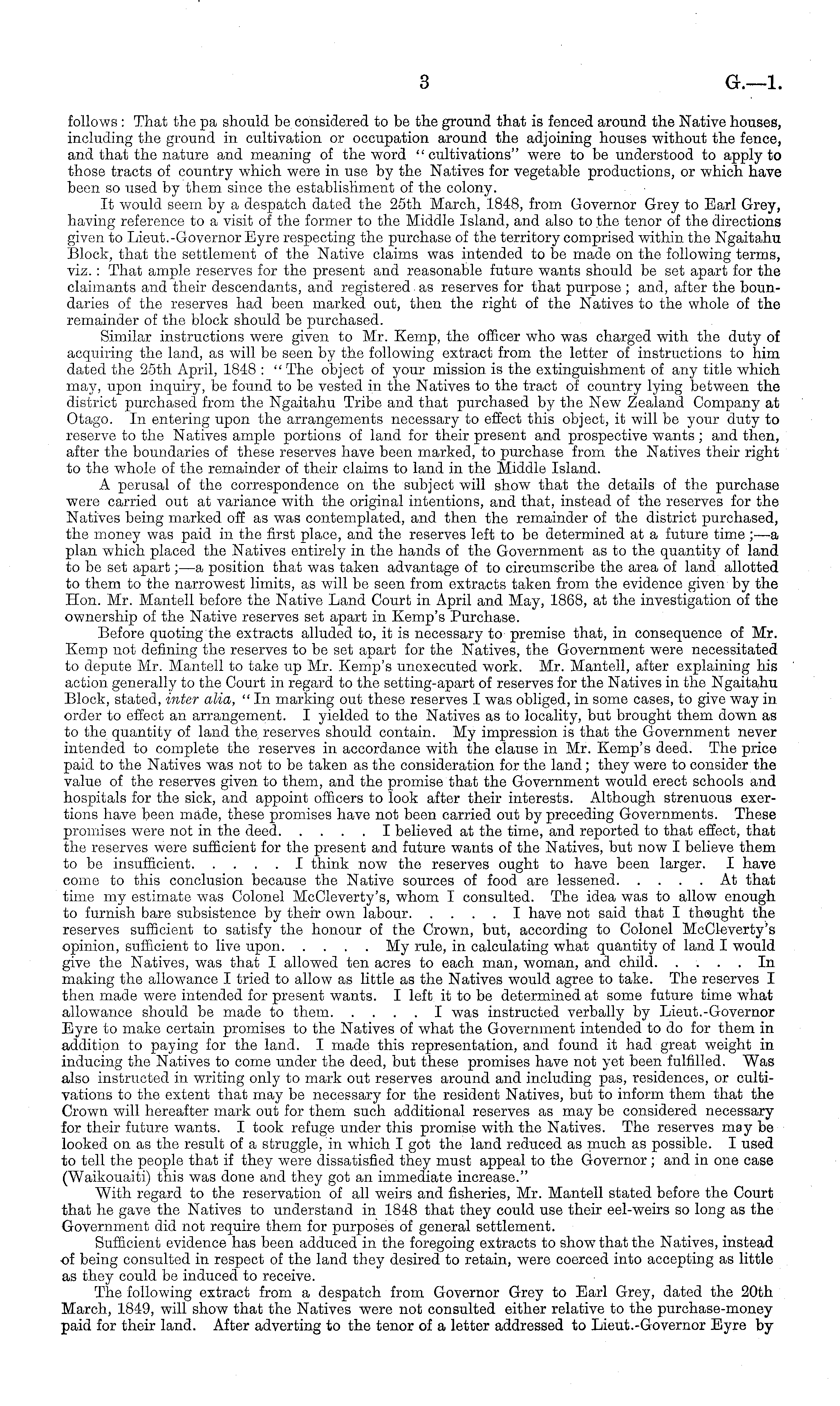 follows : That the pa should be considered to be the ground that is fenced around the Native houses, including the ground in cultivation or occupation around the adjoining houses without the fence, and that the nature and meaning of the word "cultivations" were to be understood to apply to those tracts of country which were in use by the Natives for vegetable productions, or which have been so used by them since the establishment of the colony. It would seem by a despatch dated the 25th March, 1848, from Governor Grey to Earl Grey, having reference to a visit of the former to the Middle Island, and also to the tenor of the directions given to Lieut.-Governor Eyre respecting the purchase of the territory comprised within the Ngaitahu Block, that the settlement of the Native claims was intended to be made on the following terms, viz. : That ample reserves for the present and reasonable future wants should be set apart for the claimants and their descendants, and registered. as reserves for that purpose ; and, after the boundaries of the reserves had been marked out, then the right of the Natives to the whole of the remainder of the block should be purchased. Similar instructions were given to Mr. Kemp, the officer who was charged with the duty of acquiring the land, as will be seen by the following extract from the letter of instructions to him dated the 25th April, 1848 : "The object of your mission is the extinguishment of any title which may, upon inquiry, be found to be vested in the Natives to the tract of country lying between the district purchased from the Ngaitahu Tribe and that purchased by the New Zealand Company at Otago. In entering upon the arrangements necessary to effect this object, it will be your duty to reserve to the Natives ample portions of land for their present and prospective wants ; and then, after the boundaries of these reserves have been marked, to purchase from the Natives their right to the whole of the remainder of their claims to land in the Middle Island. A perusal of the correspondence on the subject will show that the details of the purchase were carried out at variance with the original intentions, and that, instead of the reserves for the Natives being marked off as was contemplated, and then the remainder of the district purchased, the money was paid in the first place, and the reserves left to be determined at a future time ; —a plan which placed the Natives entirely in the hands of the Government as to the quantity of land to be set apart;—a position that was taken advantage of to circumscribe the area of land allotted to them to the narrowest limits, as will be seen from extracts taken from the evidence given by the Hon. Mr. Mantell before the Native Land Court in April and May, 1868, at the investigation of the ownership of the Native reserves set apart in Kemp's Purchase. Before quoting the extracts alluded to, it is necessary to premise that, in consequence of Mr. Kemp not defining the reserves to be set apart for the Natives, the Government were necessitated to depute Mr. Mantell to take up Mr. Kemp's unexecuted work. Mr. Mantell, after explaining his action generally to the Court in regard to the setting-apart of reserves for the Natives in the Ngaitahu Block, stated, inter alia, " In marking out these reserves I was obliged, in some cases, to give way in order to effect an arrangement. I yielded to the Natives as to locality, but brought them down as to the quantity of land the, reserves should contain. My impression is that the Government never intended to complete the reserves in accordance with the clause in Mr. Kemp's deed. The price paid to the Natives was not to be taken as the consideration for the land; they were to consider the value of the reserves given to them, and the promise that the Government would erect schools and hospitals for the sick, and appoint officers to look after their interests. Although strenuous exertions have been made, these promises have not been carried out by preceding Governments. These promises were not in the deed I believed at the time, and reported to that effect, that the reserves were sufficient for the present and future wants of the Natives, but now I believe them to be insufficient I think now the reserves ought to have been larger. I have come to this conclusion because the Native sources of food are lessened At that time my estimate was Colonel McCleverty's, whom I consulted. The idea was to allow enough to furnish bare subsistence by their own labour I have not said that I thought the reserves sufficient to satisfy the honour of the Crown, but, according to Colonel McCleverty's opinion, sufficient to live upon My rule, in calculating what quantity of land I would give the Natives, was that I allowed ten acres to each man, woman, and child In making the allowance I tried to allow as little as the Natives would agree to take. The reserves I then made were intended for present wants. I left it to be determined at some future time what allowance should be made to them I was instructed verbally by Lieut.-Governor Eyre to make certain promises to the Natives of what the Government intended to do for them in addition to paying for the land. I made this representation, and found it had great weight in inducing the Natives to come under the deed, but these promises have not yet been fulfilled. Was also instructed in writing only to mark out reserves around and including pas, residences, or cultivations to the extent that may be necessary for the resident Natives, but to inform them that the Crown will hereafter mark out for them such additional reserves as may be considered necessary for their future wants. I took refuge under this promise with the Natives. The reserves may be looked on as the result of a struggle, in which I got the land reduced as much as possible. I used to tell the people that if they were dissatisfied they must appeal to the Governor; and in one case (Waikouaiti) this was done 