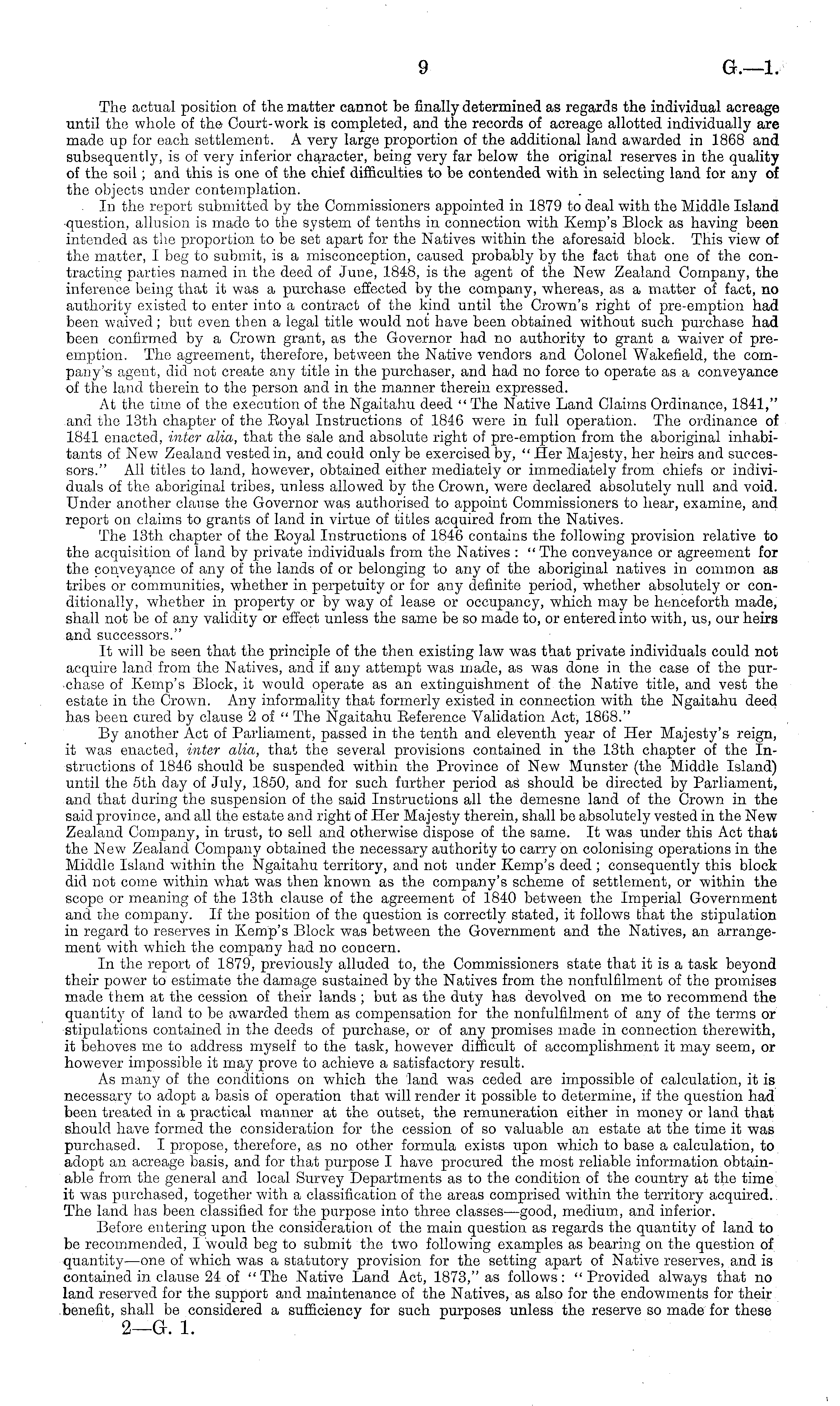 The actual position of the matter cannot be finally determined as regards the individual acreage until the, whole of the Court-work is completed, and the records of acreage allotted individually are made up for each settlement. A very large proportion of the additional land awarded in 1868 and subsequently, is of very inferior character, being very far below the original reserves in the quality of the soil; and this is one of the chief difficulties to be contended with in selecting land for any of the objects under contemplation. In the report submitted by the Commissioners appointed in 1879 to deal with the Middle Island •question, allusion is made to the system of tenths in connection with Kemp's Block as having been intended as the proportion to be set apart for the Natives within the aforesaid block. This view of the matter, I beg to submit, is a misconception, caused probably by the fact that one of the contracting parties named in the deed of June, 1848, is the agent of the New Zealand Company, the inference being that it was a purchase effected by the company, whereas, as a matter of fact, no authority existed to enter into a contract of the kind until the Crown's right of pre-emption had been waived ; but even then a legal title would not have been obtained without such purchase had been confirmed by a Crown grant, as the Governor had no authority to grant a waiver of preemption. The agreement, therefore, between the Native vendors and Colonel Wakefield, the company's agent, did not create any title in the purchaser, and had no force to operate as a conveyance of the land therein to the person and in the manner therein expressed. At the time of the execution of the Ngaitahu deed " The Native Land Claims Ordinance, 1841," and the 13th chapter of the Royal Instructions of 1846 were in full operation. The ordinance of 1841 enacted, inter alia, that the sale and absolute right of pre-emption from the aboriginal inhabitants of New Zealand vested in, and could only be exercised by, " Her Majesty, her heirs and successors." All titles to land, however, obtained either mediately or immediately from chiefs or individuals of the aboriginal tribes, unless allowed by the Crown, were declared absolutely null and void. Under another clause the Governor was authorised to appoint Commissioners to hear, examine, and report on claims to grants of land in virtue of titles acquired from the Natives. The 13th chapter of the Royal Instructions of 1846 contains the following provision relative to the acquisition of land by private individuals from the Natives : " The conveyance or agreement for the conveyance of any of the lands of or belonging to any of the aboriginal natives in common as tribes or communities, whether in perpetuity or for any definite period, whether absolutely or conditionally, whether in property or by way of lease or occupancy, which may be henceforth made, shall not be of any validity or effect unless the same be so made to, or entered into with, us, our heirs and successors." It will be seen that the principle of the then existing law was that private individuals could not acquire land from the Natives, and if any attempt was made, as was done in the case of the purchase of Kemp's Block, it would operate as an extinguishment of the Native title, and vest the estate in the Crown. Any informality that formerly existed in connection with the Ngaitahu deed has been cured by clause 2 of " The Ngaitahu Reference Validation Act, 1868." By another Act of Parliament, passed in the tenth and eleventh year of Her Majesty's reign, it was enacted, inter alia, that the several provisions contained in the 13th chapter of the Instructions of 1846 should be suspended within the Province of New Munster (the Middle Island) until the sth day of July, 1850, and for such further period as should be directed by Parliament, and that during the suspension of the said Instructions all the demesne land of the Crown in the said province, and all the estate and right of Her Majesty therein, shall be absolutely vested in the New Zealand Company, in trust, to sell and otherwise dispose of the same. It was under this Act that the New Zealand Company obtained the necessary authority to carry on colonising operations in the Middle Island within the Ngaitahu territory, and not under Kemp's deed ; consequently this block did not come within what was then known as the company's scheme of settlement, or within the scope or meaning of the 13th clause of the agreement of 1840 between the Imperial Government and the company. If the position of the question is correctly stated, it follows that the stipulation in regard to reserves in Kemp's Block was between the Government and the Natives, an arrangement with which the company had no concern. In the report of 1879, previously alluded to, the Commissioners state that it is a task beyond their power to estimate the damage sustained by the Natives from the nonfulfilment of the promises made them at the cession of their lands ; but as the duty has devolved on me to recommend the quantity of land to be awarded them as compensation for the nonfulfilment of any of the terms or stipulations contained in the deeds of purchase, or of any promises made in connection therewith, it behoves me to address myself to the task, however difficult of accomplishment it may seem, or however impossible it may prove to achieve a satisfactory result. As many of the conditions on which the land was ceded are impossible of calculation, it is necessary to adopt a basis of operation that will render it possible to determine, if the question had been treated in a practical manner at the outset, the remuneration either in money or land that should have formed the consideration for the cession of so valuable an estate at the time it was purchased. I propose, therefore, as no other formula exists upon which to base a calculation, to adopt an acreage basis, and for that purpose I have procured the mos