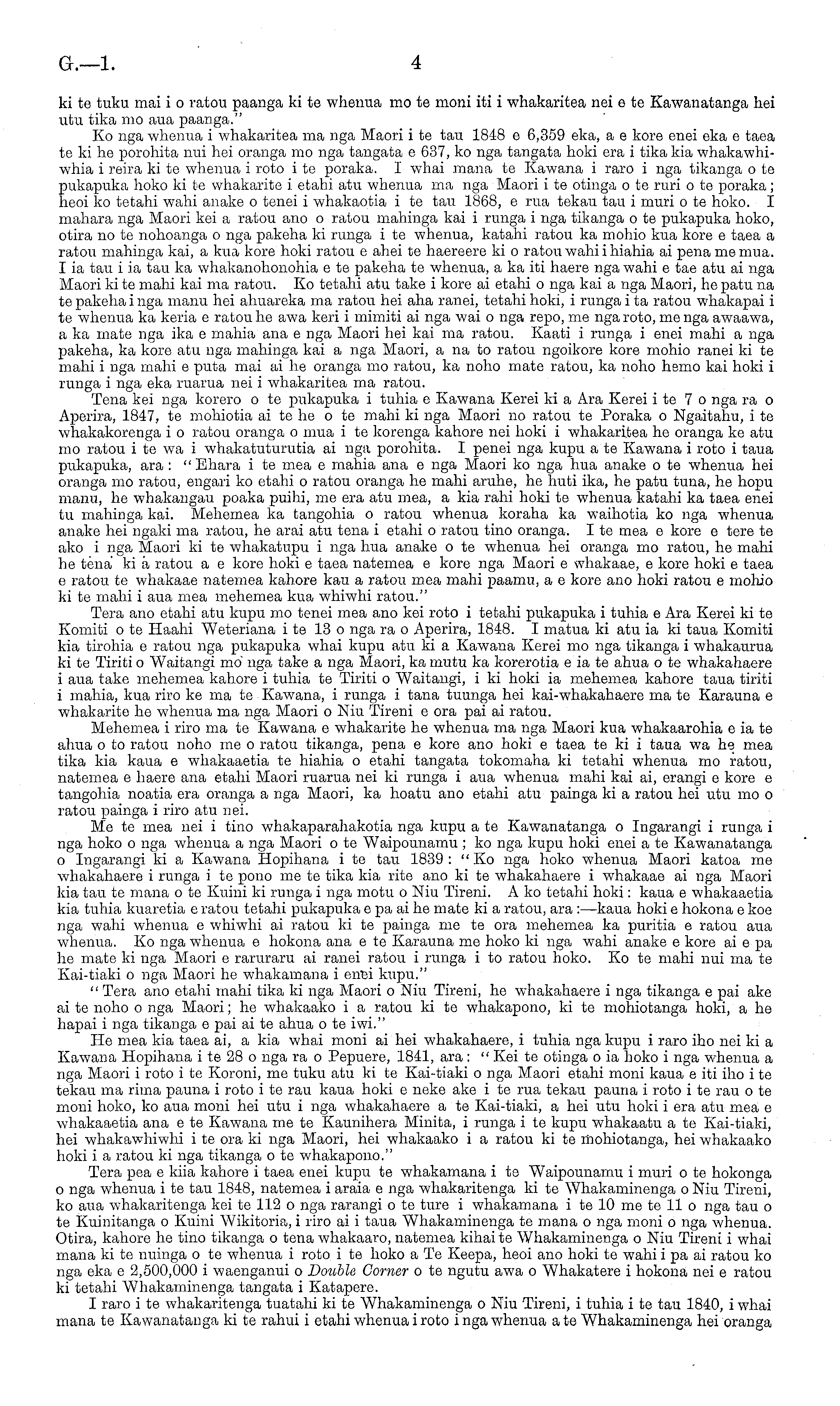 ki te tuku mai i o ratou paanga ki te whenua mo te moni iti i whakaritea nei e te Kawanatanga hei utu tika mo aua paanga." Ko nga whenua i whakaritea ma nga Maori i te tau 1848 e 6,359 eka, a e kore enei eka e taea te ki he porohita nui hei oranga mo nga tangata e 637, ko nga tangata hoki era i tika kia whakawhiwhia i reira ki te whenua i roto ite poraka. I whai mana te Kawana i raro i nga tikanga ote pukapuka hoko ki te whakarite i etahi atu whenua ma nga Maori i te otinga o te ruri o te poraka; heoi ko tetahi wahi anake o tenei i whakaotia i te tau 1868, e rua tekau tau i muri ote hoko. I mahara nga Maori kei a ratou ano o ratou mahinga kai i runga i nga tikanga o te pukapuka hoko, otira no te nohoanga o nga pakeha ki runga i te whenua, katahi ratou ka mohio kua kore e taea a ratou mahinga kai, a kua kore hoki ratou e ahei te haereere ki o ratou wahi i hiahia ai pena me mua. I ia tau i ia tau ka whakanohonohia e te pakeha te whenua, a ka iti haere nga wahi e tae atu ai nga Maori ki te mahi kai ma ratou. Ko tetahi atu take i kore ai etahi o nga kai a nga Maori, he patu na te pakeha i nga manu hei ahuareka ma ratou hei aha ranei, tetahi hoki, i runga i ta ratou whakapai i te whenua ka keria e ratou he awa keri i mimiti ai nga wai o nga repo, me nga roto, me nga awaawa, aka mate nga ika e mahia ana e nga Maori hei kai ma ratou. Kaati i runga i enei mahi a nga pakeha, ka kore atu nga mahinga kai a nga Maori, a na to ratou ngoikore kore mohio ranei ki te mahi i nga mahi e puta mai ai he oranga mo ratou, ka noho mate ratou, ka noho hemo kai hoki i runga i nga eka ruarua nei i whakaritea ma ratou. Tena kei nga korero o te pukapuka i tuhia e Kawana Kerei ki a Ara Kerei i te 7 o nga ra o Aperira, 1847, te mohiotia ai te he o te mahi ki nga Maori no ratou te Poraka o Ngaitahu, i te whakakorenga i o ratou oranga o mua i te korenga kahore nei hoki i whakaritea he oranga ke atu mo ratou ite wa i whakatuturutia ai nga porohita. I penei nga kupu ate Kawana i roto i taua pukapuka, ara : " Ehara i te mea e mahia ana e nga Maori ko nga hua anake o te whenua hei oranga mo ratou, engari ko etahi o ratou oranga he mahi aruhe, he huti ika, he patu tuna, he hopu manu, he whakaugau poaka puihi, me era atu mea, a kia rahi hoki te whenua katahi ka taea enei tu mahinga kai. Mehemea ka tangohia o ratou whenua koraha ka waihotia ko nga whenua anake hei ngaki ma ratou, he arai atu tena i etahi o ratou tino oranga. Ite mea e kore e tere te ako i nga Maori ki te whakatupu i nga hua anake o te whenua hei oranga mo ratou, he mahi he tena ki a ratou a e kore hoki e taea natemea e kore nga Maori e whakaae, e kore hoki e taea e ratou te whakaae natemea kahore kau a ratou mea mahi paamu, a e kore ano hoki ratou e mohio ki te mahi i aua mea mehemea kua whiwhi ratou." Tera ano etahi atu kupu mo tenei mea ano kei roto i tetahi pukapuka i tuhia e Ara Kerei ki te Komiti ote Haahi Weteriana ite 13 o nga ra o Aperira, 1848. I matua ki atu ia ki taua Komiti kia tirohia e ratou nga pukapuka whai kupu atu ki a Kawana Kerei mo nga tikanga i whakaurua ki te Tiriti o Waitangi mo nga take a nga Maori, ka mutu ka korerotia e ia te ahua o te whakahaere i aua take mehemea kahore i tuhia te Tiriti o Waitangi, i ki hoki ia mehemea kahore taua tiriti i mahia, kua riro ke ma te Kawana, i runga i tana tuunga hei kai-whakahaere ma te Karauna e whakarite he whenua ma nga Maori o Niu Tireni e ora pai ai ratou. Mehemea i riro ma te Kawana e whakarite he whenua ma nga Maori kua whakaarohia e ia te ahua o to ratou noho me o ratou tikanga, pena e kore ano hoki e taea te ki i taua wa he mea tika kia kaua e whakaaetia te hiahia o etahi tangata tokomaha ki tetahi whenua mo ratou, natemea e haere ana etahi Maori ruarua nei ki runga i aua whenua mahi kai ai, erangi e kore e tangohia noatia era oranga a nga Maori, ka hoatu ano etahi atu painga ki a ratou hei utu mo o ratou painga i riro atu nei. Me te mea nei i tino whakaparahakotia nga kupu a te Kawanatanga o Ingarangi i runga i nga hoko o nga whenua a nga Maori o te Waipounamu ; ko nga kupu hoki enei a te Kawanatanga o Ingarangi ki a Kawana Hopihana i te tau 1839 : "Ko nga hoko whenua Maori katoa me whakahaere i runga i te pono me te tika kia rite ano ki te whakahaere i whakaae ai nga Maori kia tau te mana ote Kuini ki runga i nga motu o Niu Tireni. Ako tetahi hoki: kaua e whakaaetia kia tuhia kuaretia e ratou tetahi pukapuka e pa ai he mate ki a ratou, ara : —kaua hoki e hokona e koe nga wahi whenua e whiwhi ai ratou ki te painga me te ora mehemea ka puritia e ratou aua whenua. Ko nga whenua e hokona ana ete Karauna me hoko ki nga wahi anake e kore ai epa he mate ki nga Maori e raruraru ai ranei ratou i runga ito ratou hoko. Ko te mahi nui ma te Kai-tiaki o nga Maori he whakamana i enei kupu." " Tera ano etahi mahi tika ki nga Maori o Niu Tireni, he whakahaere i nga tikanga e pai ake ai te noho o nga Maori; he whakaako i a ratou ki te whakapono, ki te mohiotanga hoki, a he hapai i nga tikanga e pai ai te ahua o te iwi." He mea kia taea ai, a kia whai moni ai hei whakahaere, i tuhia nga kupu i raro iho nei ki a Kawana Hopihana i te 28 o nga ra o Pepuere, 1841, ara : " Kei te otinga o ia hoko i nga whenua a nga Maori i roto i te Koroni, me tuku atu ki te Kai-tiaki o nga Maori etahi moni kaua e iti iho i te tekau ma rima pauna i roto i te rau kaua hoki e neke ake i te rua tekau pauna i roto i te rau o te moni hoko, ko aua moni hei utu i nga whakahaere a te Kai-tiaki, a hei utu hoki i era atu mea e whakaaetia ana e te Kawana me te Kaunihera Minita, i runga i te kupu whakaatu a te Kai-tiaki, hei whakawhiwhi i te ora ki nga Maori, hei whakaako i a ratou ki te mohiotanga, hei whakaako hoki i a ratou ki nga tikanga o te whakapono." Tera pea e kiia kahore i taea enei kupu te whakamana i te Waipounamu i muri o te hokonga o nga whenua i te tau 1848, natemea i araia e nga whakaritenga ki te Whakaminenga o Niu Tireni, ko aua whakaritenga kei te 112 o nga rarangi o te ture i whakamana i te 10 me te 11 o nga tau o te