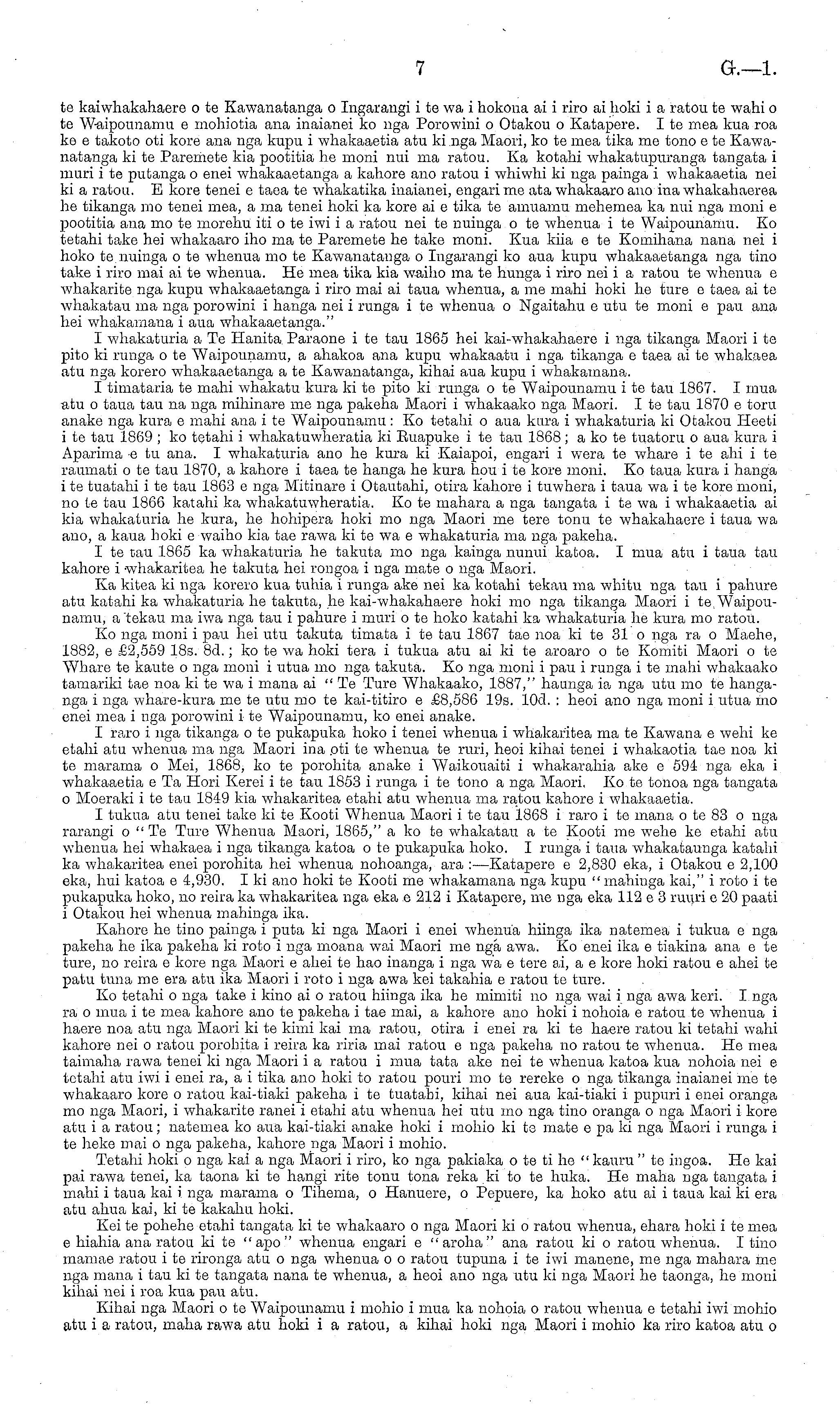 te kaiwhakahaere o te Kawanatanga o Ingarangi i te wa i hokona ai i riro ai hoki i a ratou te wahi o te Waipounamu e mohiotia ana inaianei ko nga Porowini o Otakou o Katapere. Ite mea kua roa ke e takoto oti kore ana nga kupu i whakaaetia atu ki nga Maori, ko te mea tika me tono e te Kawanatanga ki te Paremete kia pootitia he moni nui ma ratou. Ka kotahi whakatupuranga tangata i muri i te putanga o enei whakaaetanga a kahore ano ratou i whiwhi ki nga painga i whakaaetia nei ki a ratou. E kore tenei e taea te whakatika inaianei, engari me ata whakaaro ano ina whakahaerea he tikanga mo tenei mea, a ma tenei hoki ka kore ai e tika te amuamu mehemea ka nui nga moni e pootitia ana mo te morehu iti ote iwi i a ratou nei te nuinga o te whenua i te Waipounamu. Ko tetahi take hei whakaaro iho ma te Paremete he take moni. Kua kiia e te Komihana nana nei i hoko te nuinga o te whenua mo te Kawanatanga o Ingarangi ko aua kupu whakaaetanga nga tino take i riro mai ai te whenua. He mea tika kia waiho ma te hunga i riro nei i a ratou te whenua e whakarite nga kupu whakaaetanga i riro mai ai taua whenua, a me mahi hoki he fare o taea ai te whakatau ma nga porowini i hanga nei i runga i te whenua o Ngaitahu e utu te moni e pau ana hei whakamana i aua whakaaetanga." I whakaturia a Te Hanita Paraone i to tau 1865 hei kai-whakahaere i nga tikanga Maori i to pito ki runga o te Waipounamu, a ahakoa ana kupu whakaatu i nga tikanga e taea ai te whakaea atu nga korero whakaaetanga a te Kawanatanga, kihai aua kupu i whakamana. I timataria te mahi whakatu kura ki te pito ki runga ote Waipounamu ite tau 1867. I mua atu o taua tau na nga mihinare me nga pakeha Maori i wdiakaako nga Maori. Ite tau 1870 e toru anake nga kura e mahi ana ite Waipounamu: Ko tetahi o aua kura i whakaturia ki Otakou Heeti ite tau 1869 ; ko tetahi i whakatuwheratia ki Ruapuke ite tau 1868; ako te tuatoru o aua kura i Aparima -e tu ana. I whakaturia ano he kura ki Kaiapoi, engari i w Tera te wharo i te ahi i to raumati ote tau 1870, a kahore i taea te hanga he kura hou ite kore moni. Ko taua kura i hanga i te tuatahi i te tau 1863 e nga Mitinare i Otautahi, otira kahore i tuwhera i taua wa i te kore moni, no te tau 1866 katahi ka whakatuwheratia. Ko te mahara a nga tangata i te wa i whakaaetia ai kia whakaturia he kura, he hohipera hoki mo nga Maori me tere tonu te whakahaere i taua wa ano, a kaua hoki e waiho kia tae rawa ki te wa e whakaturia ma nga pakeha. I te tau 1865 ka whakaturia he takuta mo nga kainga nunui katoa. I mua atu i taua tau kahore i -whakaritea he takuta hei rongoa i nga mate o nga Maori. Ka kitea ki nga korero kua tuhia i runga ake nei ka kotahi tekau ma whitu nga tau i pahure atu katahi ka whakaturia he takuta, he kai-whakahaere hoki mo nga tikanga Maori i te, Waipounamu, a "tekau ma iwa nga tau i pahure i muri o te hoko katahi ka whakaturia he kura mo ratou. Ko nga moni i pau hei utu takuta timata i te tau 1867 tae noa ki te 31 o nga ra o Maehe, 1882, e £2,559 18s. Bd.; ko te wa hoki tera i tukua atu ai ki te aroaro o te Komiti Maori o te Whare te kaute o nga moni i utua mo nga takuta. Ko nga moni i pau i runga ite mahi whakaako tamariki tae noa ki te wa i mana ai " Te Ture Whakaako, 1887," haunga ia nga utu mo te hanganga i nga whare-kura me te utu mo te kai-titiro e £8,586 19s. lOd. : heoi ano nga moni i utua mo enei mea i nga porowini i te Waipounamu, ko enei anake. I raro i nga tikanga o te pukapuka hoko i tenei whenua i whakaritea ma te Kawana e wehi ke etahi atu whenua ma nga Maori ina .oti te whenua te ruri, heoi kihai tenei i whakaotia tae noa ki te marama o Mei, 1868, ko te porohita anake i Waikouaiti i whakarahia ake e 594 nga eka i whakaaetia eTa Hori Kerei ite tau 1853 i runga ite tono a nga Maori, Ko te tonoa nga tangata o Moeraki i te tau 1849 kia whakaritea etahi atu whenua ma ratou kahore i whakaaetia. I tukua atu tenei take ki to Kooti Whenua Maori i te tau 1868 i raro i to mana o te 83 o nga rarangi o " Te Ture Whenua Maori, 1865," a ko te whakatau a te Kooti me wehe ke etahi atu whenua hei whakaea i nga tikanga katoa ote pukapuka hoko. I runga i taua whakataunga katahi ka whakaritea enei porohita hei whenua nohoanga, ara : —Katapere e 2,830 eka, i Otakou e 2,100 eka, hui katoa e 4,930. Iki ano hoki te Kooti me whakamana nga kupu " mahinga kai," i roto ito pukapuka hoko, no reira ka whakaritea nga eka e 212 i Katapere, mo nga eka 112 e 3 ruuri e 20 paati i Otakou hei whenua mahinga ika. Kahore he tino painga i puta ki nga Maori i enei whenua hiinga ika natemea i tukua e nga pakeha he ika pakeha ki roto i nga moana wai Maori me nga awa. Ko enei ika e tiakina ana e te ture, no reira e kore nga Maori e ahei te hao inanga i nga wa e tere ai, a e kore hoki ratou e ahei te patu tuna me era atu ika Maori i roto i nga awa kei takahia e ratou te ture. Ko tetahi o nga take i kino ai o ratou hiinga ika he mimiti no nga wai i nga awa keri. I nga ra o mua i te mea kahore ano te pakeha i tae mai, a kahore ano hoki i nohoia e ratou te whenua i haere noa atu nga Maori ki te kimi kai ma ratou, otira i enei ra ki te haere ratou ki tetahi wahi kahore nei o ratou porohita i reira ka riria mai ratou e nga pakeha no ratou te whenua. He mea taimaha rawa tenei ki nga Maori i a ratou i mua tata ake nei te whenua katoa kua nohoia nei e tetahi atu iwi i enei ra, a i tika ano hoki to ratou pouri mo te rereke o nga tikanga inaianei me to whakaaro kore o ratou kai-tiaki pakeha i te tuatahi, kihai nei aua kai-tiaki i pupuri i enei oranga mo nga Maori, i whakarite ranei i etahi atu whenua hei utu mo nga tino oranga o nga Maori i kore atu i a ratou; natemea ko aua kai-tiaki anake hoki i mohio ki to mate epa ki nga Maori i runga i te heke mai o nga pakeha, kahore nga Maori i mohio. Tetahi hoki o nga kai a nga Maori i riro, ko nga pakiaka oteti he " kauru "te ingoa. He kai pai rawa tenei, ka taona ki te hangi rite tonu tona reka ki to te huka. He maha nga tangata i mahi i taua kai i nga marama o Tihema, o Hanuere, o Pepuero, ka hoko