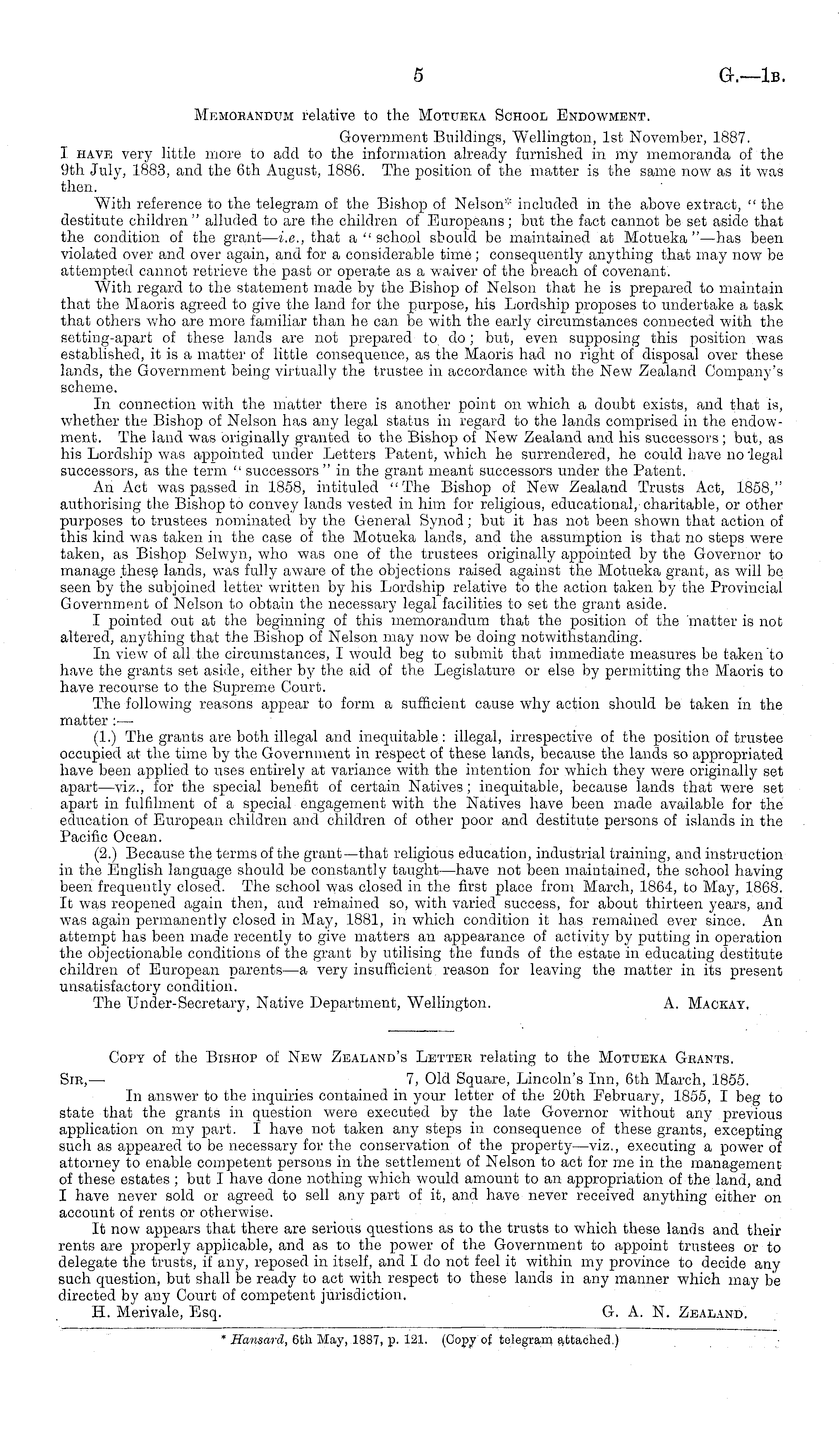 Memorandum relative to the Motueka School Endowment. Government Buildings, Wellington, Ist November, 1887. I have very little more to add to the information already furnished in my memoranda of the 9th July, 1883, and the 6th August, 1886. The position of the matter is the same now as it was then. With reference to the telegram of the Bishop of Nelson* included in the above extract, " the destitute children " alluded to are the children of Europeans; but the fact cannot be set aside that the condition of the grant— i.e., that a " school should be maintained at Motueka " —has been violated over and over again, and for a considerable time; consequently anything that may now bo attempted cannot retrieve the past or operate as a waiver of the breach of covenant. With regard to the statement made by the Bishop of Nelson that he is prepared to maintain that the Maoris agreed to give the land for the purpose, his Lordship proposes to undertake a task that others who are more familiar than he can be with the early circumstances connected with the setting-apart of these lands are not prepared to do; but, even supposing this position was established, it is a matter of little consequence, as the Maoris had no right of disposal over these lands, the Government being virtually the trustee in accordance with the New Zealand Company's scheme. In connection with the matter there is another point on. which a doubt exists, and that is, whether the Bishop of Nelson has any legal status in regard to the lands comprised in the endowment. The land was originally granted to the Bishop of New Zealand and his successors; but, as his Lordship was appointed under Letters Patent, which he surrendered, he could have no legal successors, as the term " successors " in the grant meant successors under the Patent. An Act was passed in 1858, intituled "The Bishop of New Zealand Trusts Act, 1858," authorising the Bishop to convey lands vested in him for religious, educational, charitable, or other purposes to trustees nominated by the General Synod; but it has not been shown that action of this kind was taken in the case of the Motueka lands, and the assumption is that no steps were taken, as Bishop Selwyn, who was one of the trustees originally appointed by the Governor to manage these lands, was fully aware of the objections raised against the Motueka grant, as will bo seen by the subjoined letter written by his Lordship relative to the action taken by the Provincial Government of Nelson to obtain the necessary legal facilities to set the grant aside. I pointed out at the beginning of this memorandum that the position of the matter is not altered, anything that the Bishop of Nelson may now be doing notwithstanding. In view of all the circumstances, I would beg to submit that immediate measures be taken to have the grants set aside, either by the aid of the Legislature or else by permitting the Maoris to have recourse to the Supreme Court. The following reasons appear to form a sufficient cause why action should be taken in the matter :— (1.) The grants are both illegal and inequitable: illegal, irrespective of the position of trustee occupied at the time by the Government in respect of these lands, because the lands so appropriated have been applied to uses entirely at variance with the intention for which they were originally set apart —viz., for the special benefit of certain Natives ; inequitable, because lands that were set apart in fulfilment of a special engagement with the Natives have been made available for the education of European, children and children of other poor and destitute persons of islands in the Pacific Ocean. (2.) Because the terms of the grant —that religious education, industrial training, and instruction in the English language should be constantly taught—have not been maintained, the school having been frequently closed. The school was closed in the first place from March, 1864, to May, 1868. It was reopened again then, and remained so, with varied success, for about thirteen years, and was again permanently closed in May, 1881, in which condition it has remained ever since. An attempt has been made recently to give matters an appearance of activity by putting in operation the objectionable conditions of the grant by utilising the funds of the estate in educating destitute children of European parents—a very insufficient reason for leaving the matter in its present unsatisfactory condition. The Under-Seeretary, Native Department, Wellington. A. Mackay.