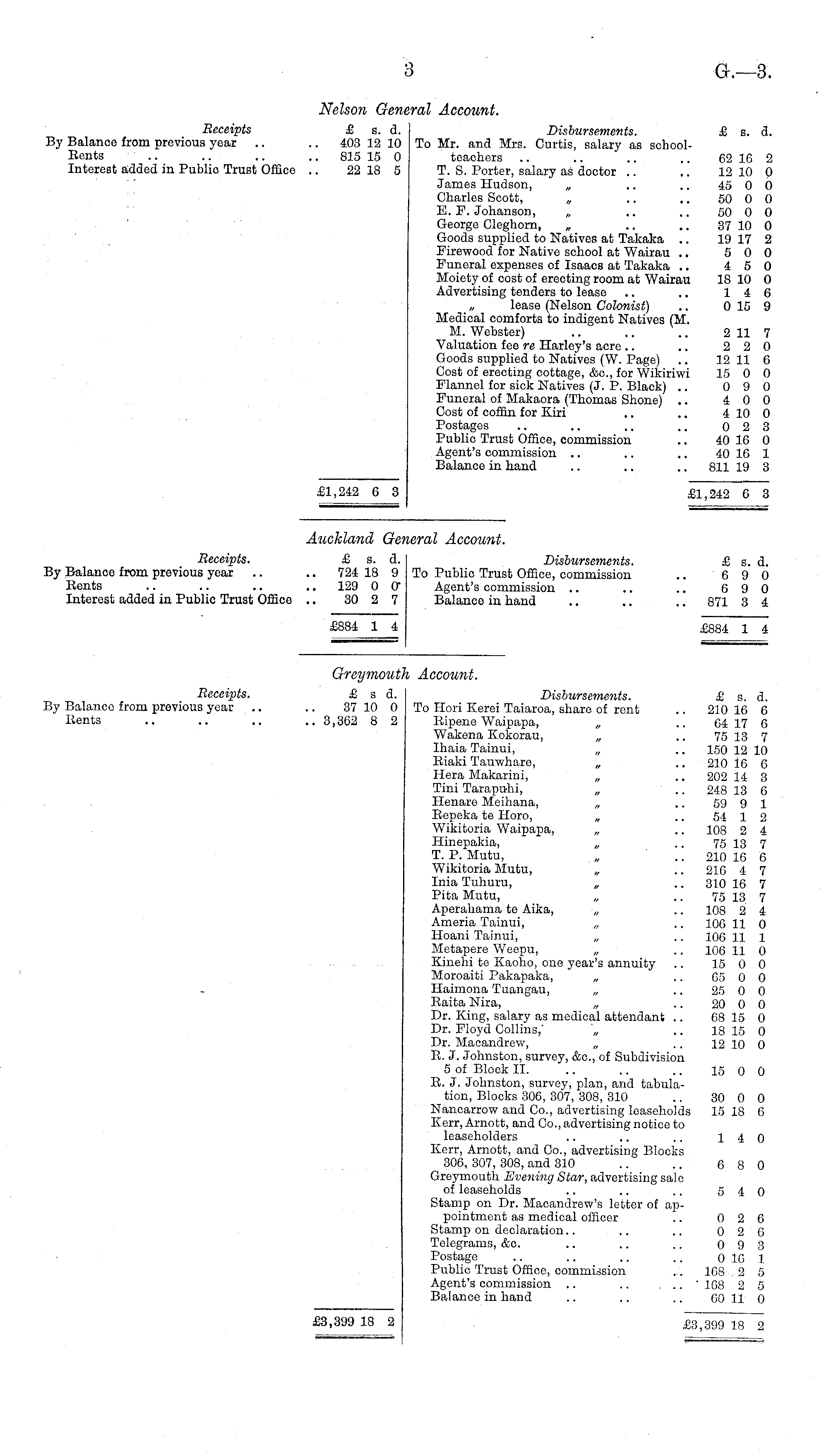 Greymouth Account. Receipts. £ s d. Disbursements. £ s. d. By Balance from previous year .. .. 37 10 0 To Hori Kerei Taiaroa, share of rent .. 210 16 6 Rents .. .. .. .. 3,362 8 2 Bipene Waipapa, „ .. 64 17 6 Waken a Kokorau, „ .. 75 13 7 Ihaia Tainui, „ .. 150 12 10 Biaki Tauwhare, „ .. 210 16 6 Hera Makarini, „ .. 202 11 3 Tini Tarapuhi, „ .. 248 13 6 Henare Meihana, „ .. 59 9 1 Bepeka te Horo, „ .. 54 1 2 Wikitoria Waipapa, „ .. 108 2 4 Hinepakia, „ .. 75 13 7 T. P. Mutu, „ .. 210 16 6 Wikitoria Mutu, „ .. 216 4 7 Inia Tuhuru, „ .. 310 16 7 Pita Mutu, „ .. 75 13 7 Aperahama te Aika, „ .. 108 2 4 Ameria Tainui, „ .. 106 11 0 Hoani Tainui, „ .. 106 11 1 Metapere Weepu, „ .. 106 11 0 Kinehi te Kaoho, one year's annuity .. 15 0 0 Moroaiti Pakapaka, „ .. 65 0 0 Haimona Tuangau, „ 25 0 0 Raita Nira, „ 20 0 0 Dr. King, salary as medical attendant .. 68 15 0 Dr. Floyd Collins, „ .. 18 15 0 Dr. Maeandrew, „ .. 12 10 0 B. J. Johnston, survey, &0., of Subdivision sof Block 11. .. .. .. 15 0 0 B. J. Johnston, survey, plan, and tabulation, Blocks 306, 307, 308, 310 .. 30 0 0 Nancarrow and Co., advertising leaseholds 15 18 6 Kerr, Arnott, and Co., advertising notice to leaseholders .. .. .. 14 0 Kerr, Arnott, and Co., advertising Blocks 306, 307, 308, and 310 .. .. 6 8 0 Greymouth Evening Star, advertising sale of leaseholds .. .. .. 5 4 0 Stamp on Dr. Maeandrew's letter of appointment as medical officer .. 0 2 6 Stamp on declaration.. .. .. 0 2 6 Telegrams, &o. .. .. .. 0 9 3 Postage .. .. .. .. 0 16 1 Public Trust Office, commission .. 168 2 5 Agent's commission .. .. .. ' 168 2 5 Balance in hand .. .. .. 60 11 0 £3.399 18 2 mZmiY~2