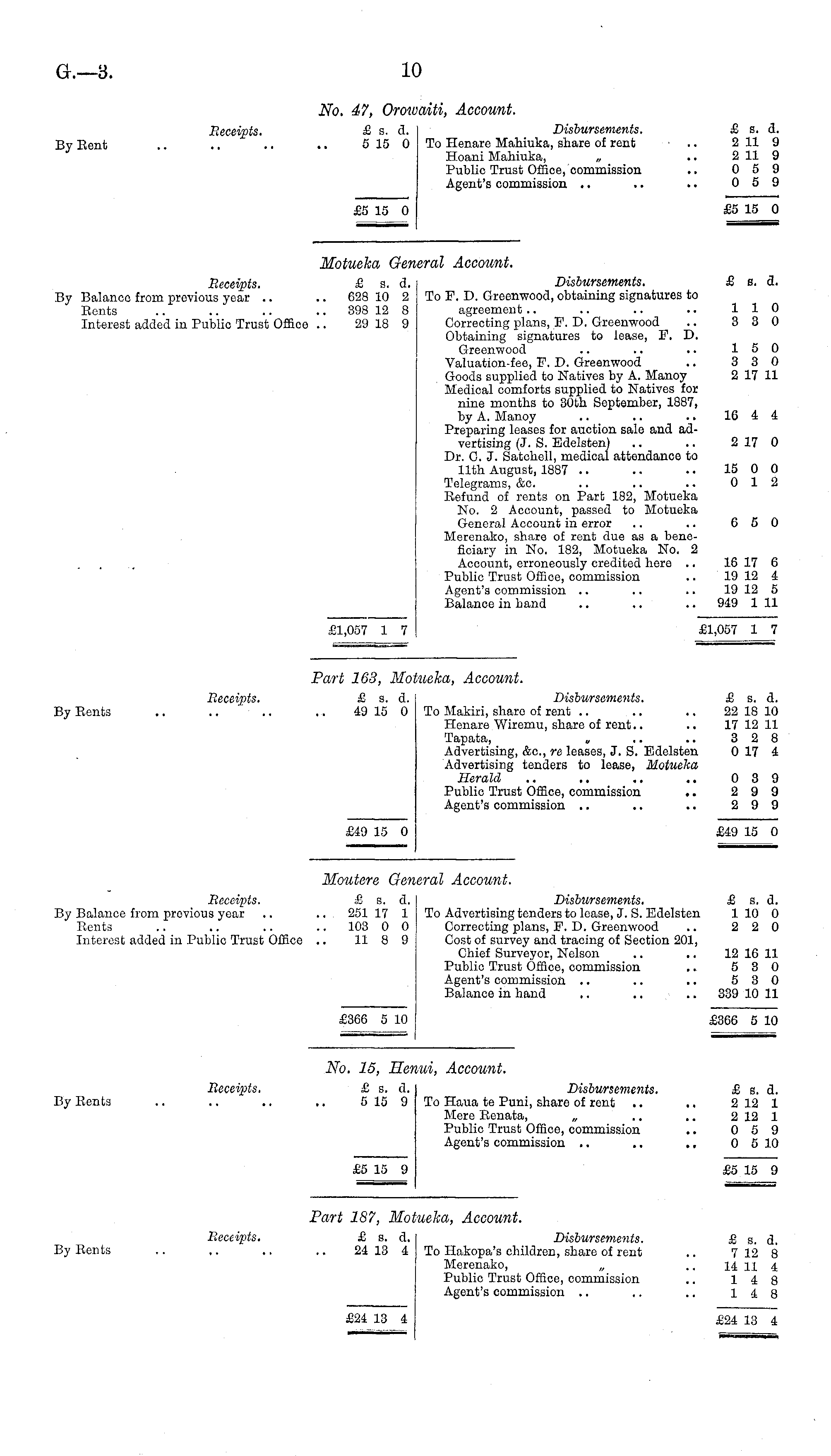 Motueka General Accottnt. Receipts. £ s. d. Disbursements. £ s. d. By Balance from previous year .. .. 628 10 2 To E. D. Greenwood, obtaining signatures to Rents .. .. .. 398 12 8 agreement.. .. .. .. 110 Interest added in Public Trust Office .. 29 18 9 Correcting plans, E. D. Greenwood .. 3 3 0 Obtaining signatures to lease, E. D. Greenwood .. .. .. 15 0 Valuation-fee, F. D. Greenwood .. 3 3 0 Goods supplied to Natives by A. Manoy 2 17 11 Medical comforts supplied to Natives for nine months to 30th September, 1887, by A. Manoy .. .. .. 16 4 4 Preparing leases for auction sale and advertising (J. S. Edelsten) .. .. 217 0 Dr. C. J. Satchell, medical attendance to 11th August, 1887 .. .. .. 15 0 0 Telegrams, &c. .. .. .. 0 12 Refund of rents on Part 182, Motueka No. 2 Account, passed to Motueka General Account in error .. .. 6 5 0 Merenako, share of rent duo as a beneficiary in No. 182, Motueka No. 2 Account, erroneously credited here .. 16 17 6 Public Trust Office, commission .. 19 12 4 Agent's commission .. .. .. 19 12 5 Balance in hand .. .. .. 949 1 11 £1,057 1 7 £1,057 1 7