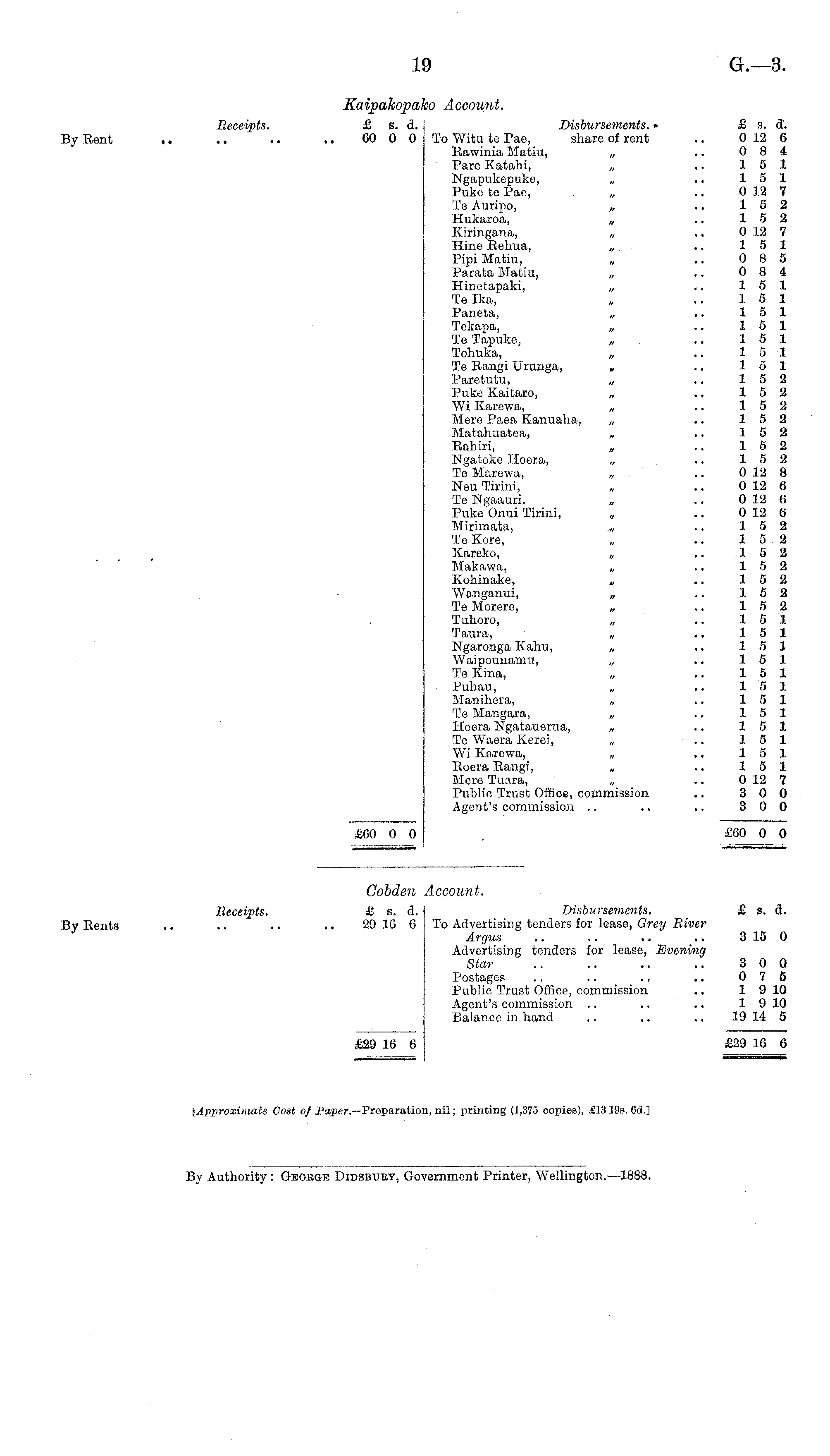 Gobden Account. Receipts. £ s. d. Disbursements. £ s. d. By Rents .. .. .. .. 29 16 6 To Advertising tenders for lease, Grey River Argus .. .. ~ .. 315 0 Advertising tenders for lease, Evening Star .. .. .. .. 3 0 0 Postages .. .. .. .. 0 7 5 Public Trust Office, commission .. 1 9 10 Agent's commission .. .. .. 1 9 10 Balance in hand .. .. .. 19 14 5 £29 16 6 £29 16 6 {Approximate Cost of Ta/per.— Preparation, nil; printing (1,375 copies), £13195, Od.J