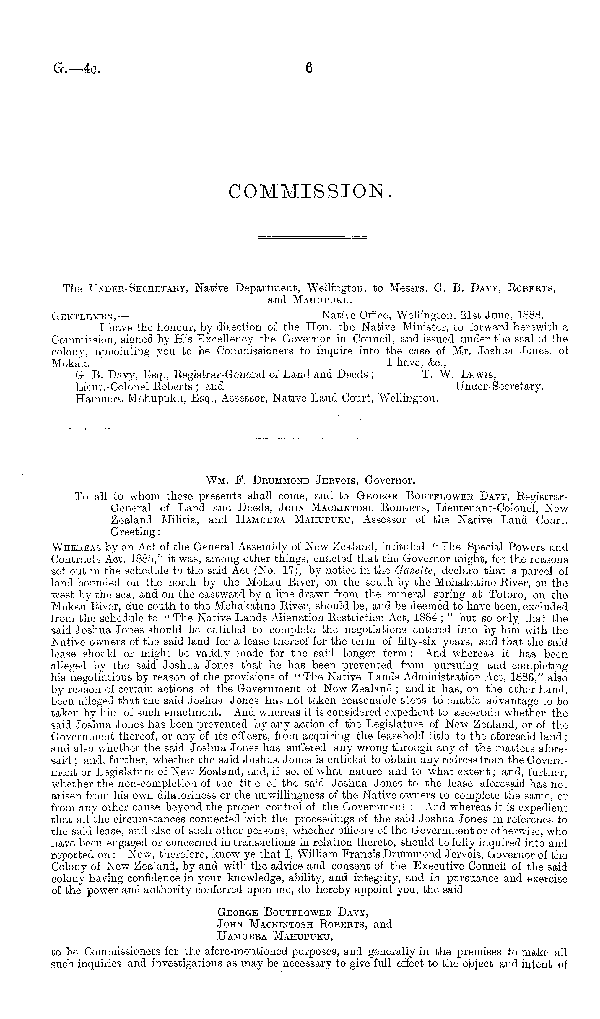 Wm. P. Deummond Jeevois, Governor. To all to whom these presents shall come, and to Geoege Boutflowee Davy, Registrar - General of Land and Deeds, John Mackintosh Robebts, Lieutenant-Colonel, New Zealand Militia, and Hamueea Mahupuku, Assessor of the Native Land Court. Greeting: Whekeas by an Act of the General Assembly of New Zealand, intituled " The Special Powers and Contracts Act, 1885," it was, among other things, enacted that the Governor might, for the reasons set out in the schedule to the said Act (No. 17), by notice in the Gazette, declare that a parcel of land bounded on the north by the Mokau River, on the south by the Mohakatino River, on the west by the sea, and on the eastward by a line drawn from the mineral spring at Totoro, on the Mokau River, due south to the Mohakatino River, should be, and be deemed to have been, excluded from the schedule to " The Native Lands Alienation Restriction Act, 188-1; " but so only that the said Joshua Jones should be entitled to complete the negotiations entered into by him with the Native owners of the said land for a lease thereof for the term of fifty-six years, and that the said lease should or might be validly made for the said longer term : And whereas it has been alleged by the said Joshua Jones that he has been prevented from pursuing and completing his negotiations by reason of the provisions of "The Native Lands Administration Act, 1886," also by reason of certain actions of the Government of New Zealand ; and it has, on the other hand, been alleged that the said Joshua Jones has not taken reasonable steps to enable advantage to be taken by him of such enactment. And whereas it is considered expedient to ascertain whether the said Joshua Jones has been prevented by any action of the Legislature of New Zealand, or of the Government thereof, or any of its officers, from acquiring the leasehold title to the aforesaid land; and also whether the said Joshua Jones has suffered any wrong through any of the matters aforesaid ; and, farther, whether the said Joshua Jones is entitled to obtain any redress from the Government or Legislature of New Zealand, and, if so, of what nature and to what extent; and, further, whether the non-completion of the title of the said Joshua Jones to the lease aforesaid has not arisen from his own dilatoriness or the unwillingness of the Native owners to complete the same, or from any other cause beyond the proper control of the Government : And whereas it is expedient that all the circumstances connected with the proceedings of the said Joshua Jones in reference to the said lease, and also of such other persons, whether officers of the Government or otherwise, who have been engaged or concerned in transactions in relation thereto, should be fully inquired into and reported on : Now, therefore, know ye that I, William Francis Drummond Jervois, Governor of the Colony of New Zealand, by and with the advice and consent of the Executive Council of the said colony having confidence in your knowledge, ability, and integrity, and in pursuance and exercise of the power and authority conferred upon me, do hereby appoint you, the said Geoege Boutflowee Davy, John Mackintosh Roberts, and Hamueea Mahupuku, to bo Commissioners for the afore-mentioned purposes, and generally in the premises to make all such inquiries and investigations as may be necessary to give full effect to the object and intent of