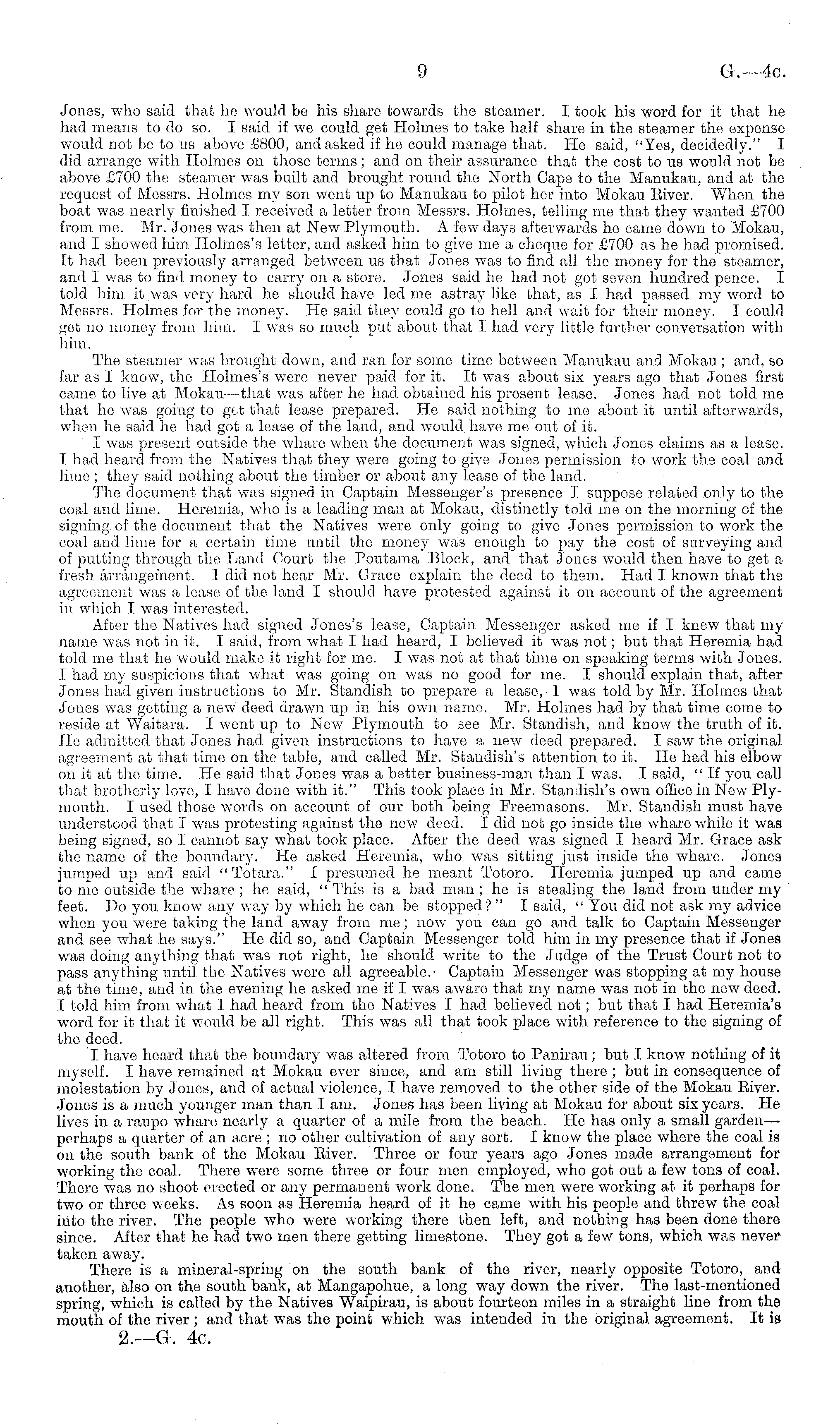 Jones, who said that he would, be his share towards the steamer. I took his word for it that he had means to do so. I said if we could get Holmes to take half share in the steamer the expense would not be to us above £800, and asked if he could manage that. He said, "Yes, decidedly." I did arrange with Holmes on those terms; and on their assurance that the cost to us would not be above £700 the steamer was built and brought round the North Cape to the Manukau, and at the request of Messrs. Holmes my son went up to Manukau to pilot her into Mokau Eiver. When the boat was nearly finished I received a letter from Messrs. Holmes, telling me that they wanted £700 from me. Mr. Jones was then at New Plymouth. A few days afterwards he came down to Mokau, and I showed him. Holmes's letter, and asked him to give me a cheque for £700 as he had promised. It had been previously arranged between us that Jones was to find all the money for the steamer, and 1 was to find money to carry on a store. Jones said he had not got seven hundred pence. I told him it was very hard he should have led me astray like that, as I had passed my word to Messrs. Holmes for the money. He said they could go to hell and wait for their money. I could get no money from him. I was so much put about that I had very little further conversation with him. The steamer was brought down, and ran for some time between Manukau and Mokau; and, so far as I know, the Holrnes's were never paid for it. It was about six years ago that Jones first came to live at Mokau — that was after he had obtained his present lease. Jones had not told me that he was going to get that lease prepared. Ho said nothing to me about it until afterwards, when he said he had got a lease of the land, and would have me out of it. I was present outside the whare when the document was signed, which Jones claims as a lease. I had heard from the Natives that they were going to give Jones permission to work the coal and lime; they said nothing about the timber or about any lease of the land. The document that was signed in Captain Messenger's presence I suppose related only to the coal and lime. Heromia, who is a leading man at Mokau, distinctly told me on the morning of the signing of the document that the Natives were only going to give Jones permission to work the coal and lime for a certain time until the money was enough to pay the cost of surveying and of putting through the Land Court the Poutama Block, and that Jones would then have to get a fresh arrangement. I did not hear Mr. Grace explain the deed to them. Had I known that the agreement was a lease of the land I should have protested against it on account of the agreement in which I was interested. After the Natives had signed Jones's lease, Captain Messenger asked me if I knew that my name was not in it. I said, from what I had heard, I believed it was not; but that Heremia had told me that he would make.it right for me. I was not at that time on speaking terms with Jones. I had my suspicions that what was going on was no good for me. I should explain that, after Jones had given instructions to Mr. Standish to prepare a lease, I was told by Mr. Holmes that Jones was getting a new deed drawn up in his own name. Mr. Holmes had by that time come to reside at Waitara. I went up to New Plymouth to ,see Mr. Standish, and know the truth of it. He admitted that Jones had given instructions to have a new deed prepared. I saw the original agreement at that time on the table, and called Mr. Staudish's attention to it. He had his elbow on it at the time. He said that Jones was a better business-man than I was. I said, "If you call that brotherly love, I have done with it." This took place in Mr. Standish's own office in New Plymouth. I used those words on account of our both being Freemasons. Mr. Standish must have understood that I was protesting against the new deed. I did not go inside the whare w 7hile it was being signed, so I cannot say what took place. After the deed was signed. I heard Mr. Grace ask the name of the boundary. He asked Heremia, who was sitting just inside the whare. Jones jumped up and said " Totara." I presumed he meant Totoro. Heromia jumped up and came to me outside the whare ; he said, " This is a bad man ; he is stealing the land from under my feet. Do you know any way by which he can be stopped? " I said, " You did not ask my advice when you were taking the land away from me; now you can go and talk to Captain Messenger and see what he says." He did so, and Captain Messenger told him in my presence that if Jones was doing anything that was not right, he should write to the Judge of the Trust Court not to pass anything until the Natives were all agreeable.- Captain Messenger was stopping at my house at the time, and in the evening he asked me if I was aware that my name was not in the new deed. I told him from what I had heard from the Natives I had believed not; but that I had Heremia's word for it that it would be all right. This was all that took place with reference to the signing of the deed. I have heard that the boundary was altered from Totoro to Panirau ; but I know nothing of it myself. I have remained at Mokau ever since, and am still living there ; but in consequence of molestation by Jones, and of actual violence, I have removed to the other side of the Mokau Eiver. Jones is a much younger man than I am. Jones has been living at Mokau for about six years. He lives in a raupo wharf! nearly a quarter of a mile from the beach. He has only a small gardenperhaps a quarter of an acre ; no other cultivation of any sort. I know the place where the coal is on the south bank of the Mokau Eiver. Three or four years ago Jones made arrangement for working the coal. There were some three or four men employed, who got out a few tons of coal. There was no shoot erected or any permanent work done. The men were working at it perhaps for two or three weeks. As soon as Heremia heard of it he 